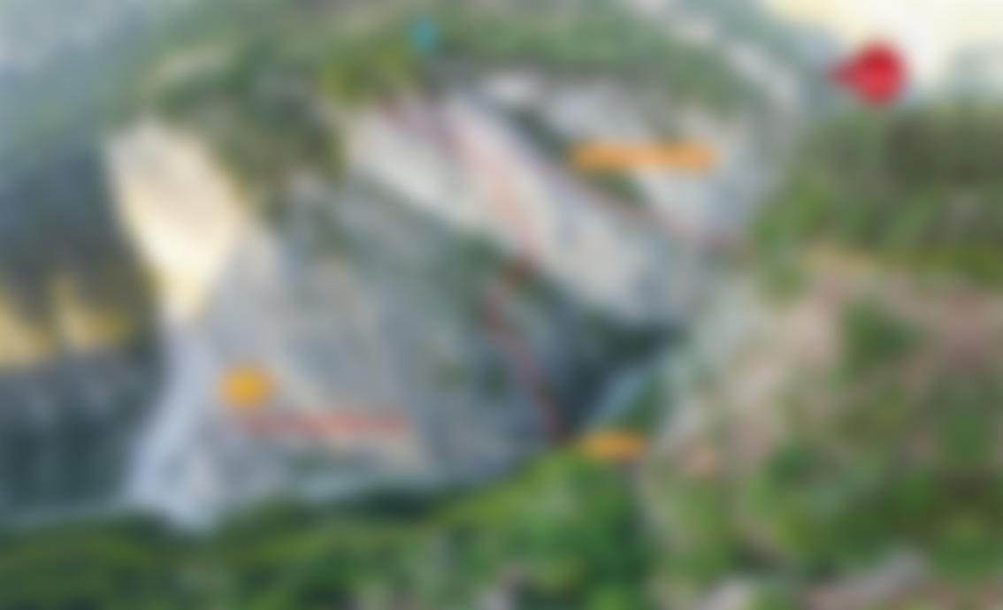 Siehe Topo. Die Schwierigkeiten liegen im unteren Mittelteil an der Hauptwand, dort sind längere C/D Passagen zu bewältigen.