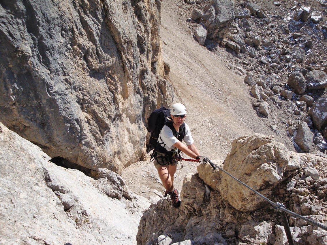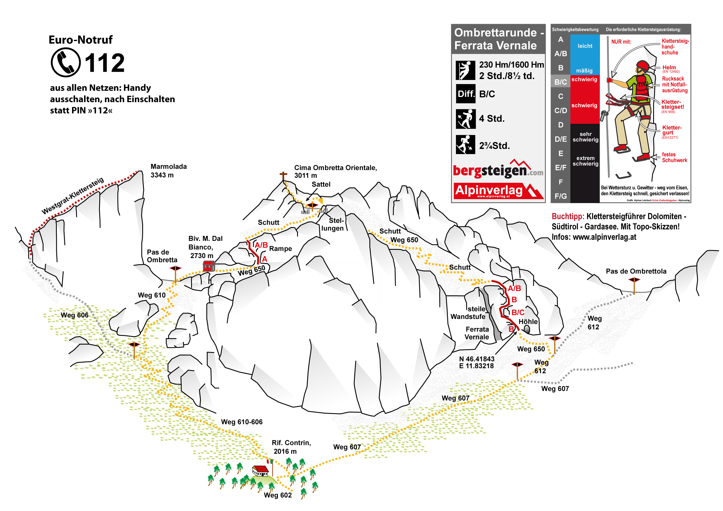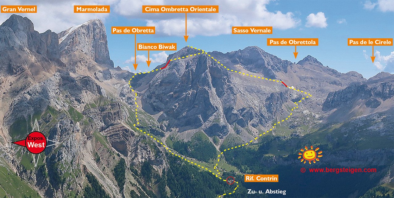 Zustieg und Route: Vom Parkplatz der Seilbahn steigt man auf dem Weg 602 anfangs sehr steil, dann durch ein schönes Hochtal zum Rif. Contrin (2016 m) auf. Von der Hütte folgt man dem Weg 606, dann dem Weg 610 durch das gewaltige Kar hinauf zum Passo de Ombretta (2702 m). Auf dem Pass rechts halten und auf dem Weg 650 zum Biv. M.D. Bianco, das etwas versteckt unweit der Passhöhe auf dem Zackengrat liegt. Am Biwak vorbei gelangt man nach ca. 10 Min. zu einer sperrenden Felsstufe (4 Std./1300 Hm). Gut gesichert und nicht allzu schwierig (A, dann A/B) erreicht man einen Absatz. Danach über Schutt auf den Sattel (viele alte Stellungen) zwischen Cima Mezzo und Cima Orienttale. Vom Sattel in ca. 15 Min. auf den höchsten Punkt (3011m) mit einem kleinen Holzkreuz. Zurück zum Sattel und in das große Schuttkar absteigen, unten hält man sich links (immer der Markierung folgen) und gelangt zu einem Abbruch (2680 m, Ferrata Vernale). Zuerst leicht (A/B und B), dann nach einer Ecke etwas steiler (B/C) abwärts und man steht auch schon am Fuß der Ferrata. (2 Std./230 Hm Aufst.). Weiter auf dem Weg, bis dieser auf den Weg 612 trifft, diesen absteigen und schlussendlich wieder auf dem Weg 607 vorbei an der Contrinalm zum Rifugio. Von dort steigt man auf dem Aufstiegsweg ins Tal (2¾ Std.).