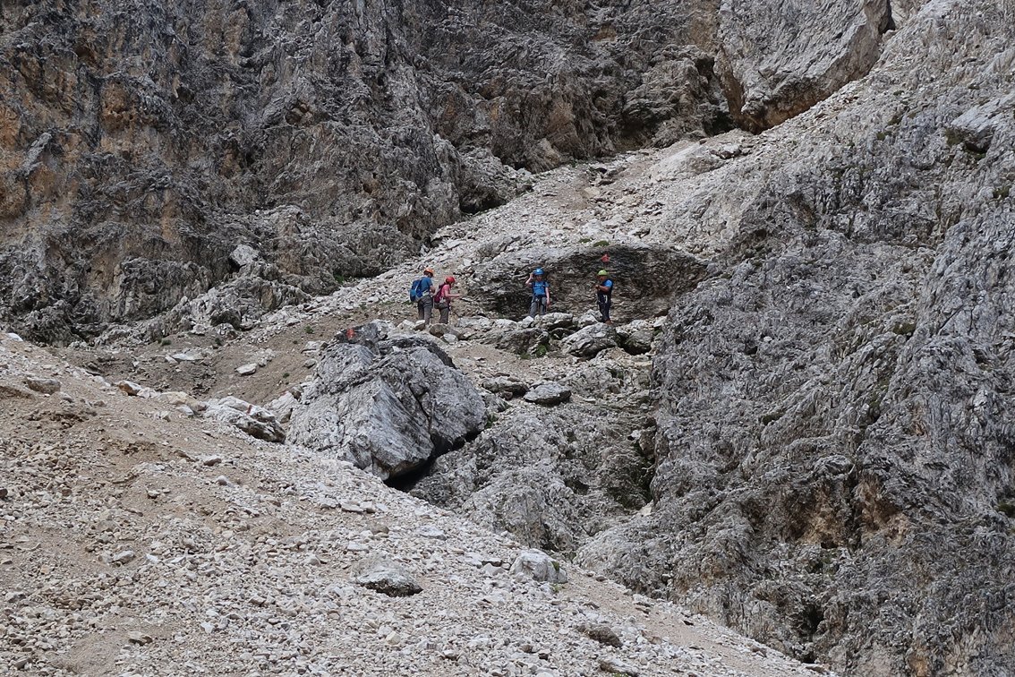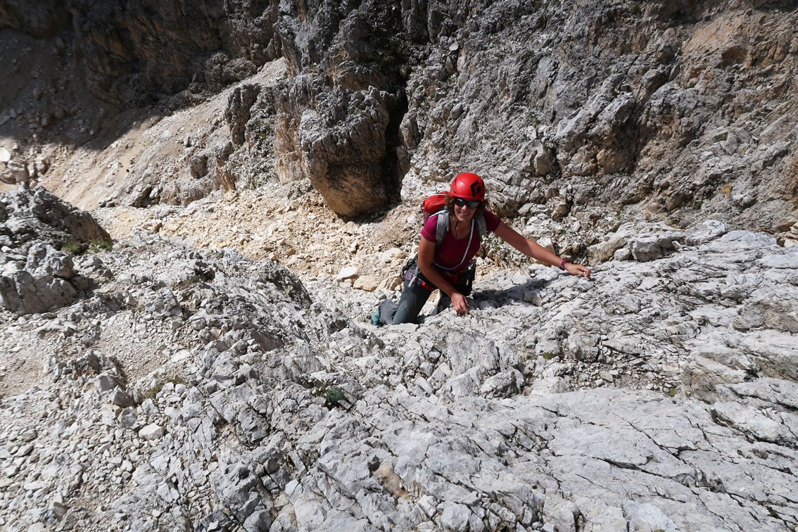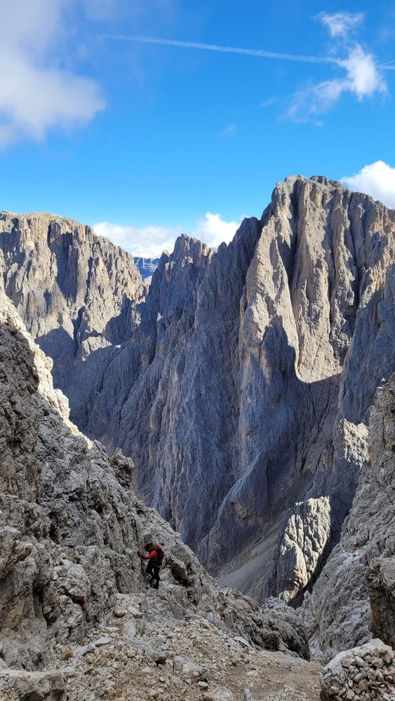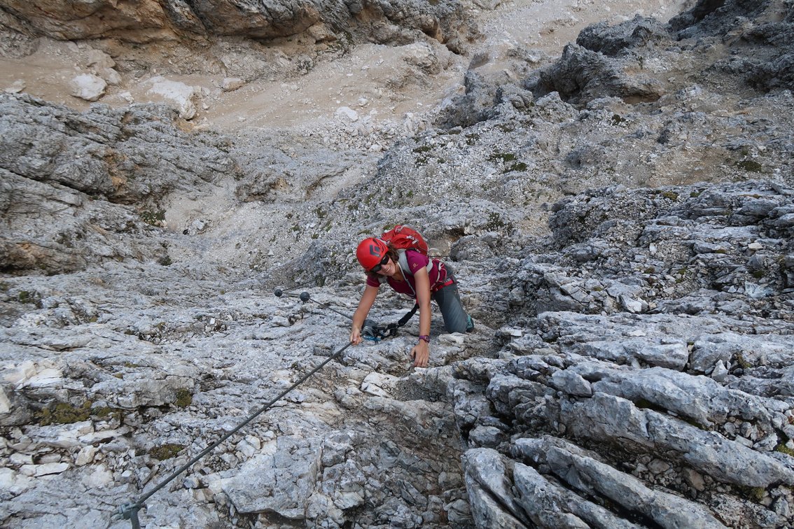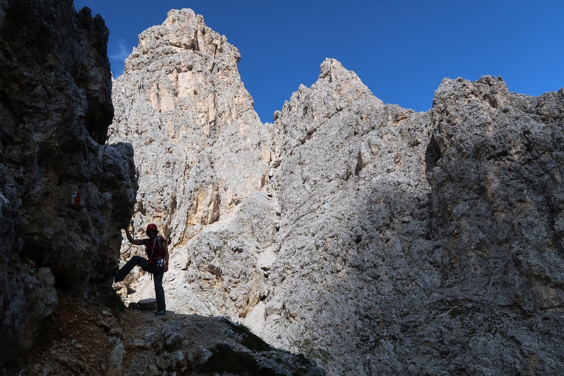 Konditionsstarke Bergsteiger können beim Zustieg die Ferrata Furcela de Saslonch (Klettersteig Langkofelscharte) als kurze Ferrata zum Aufwärmen in den Tourentag mit einbauen.