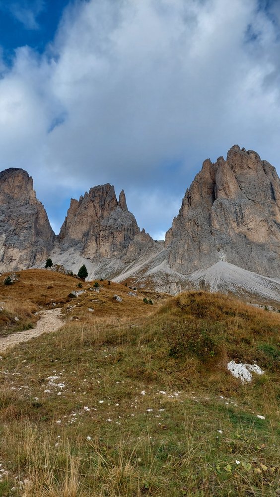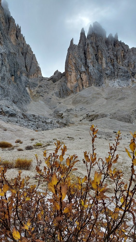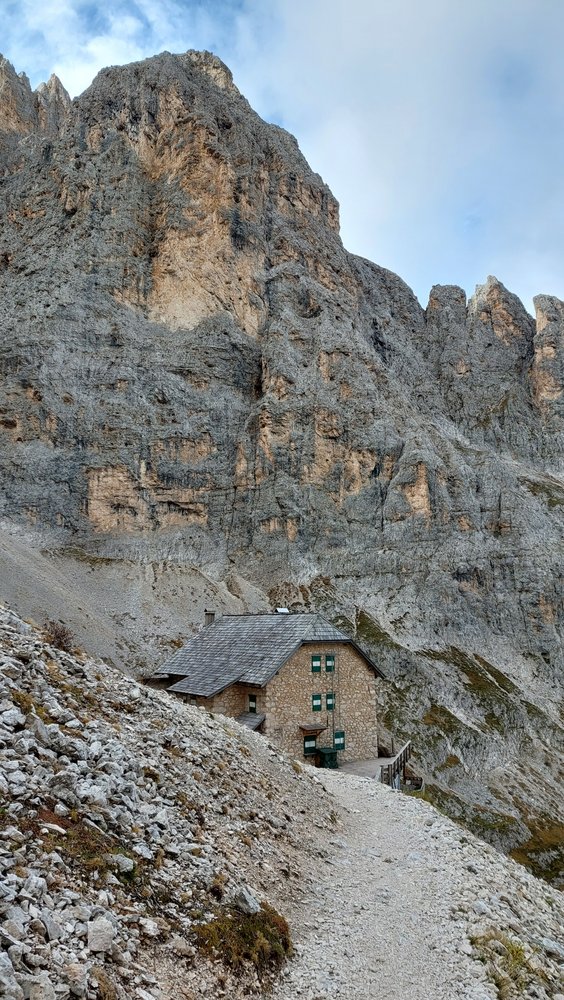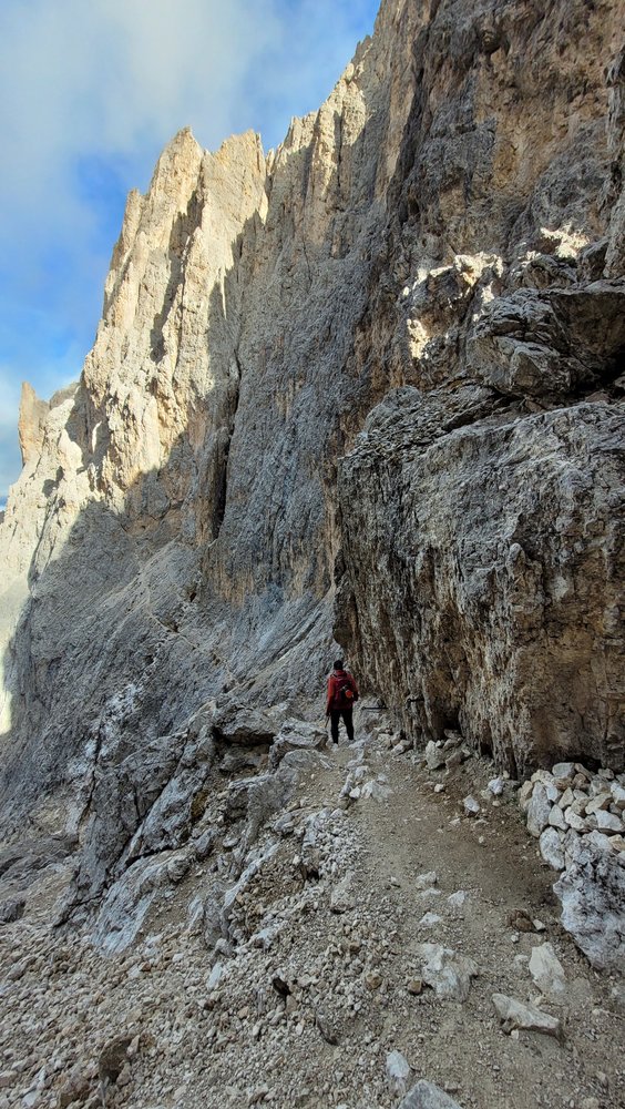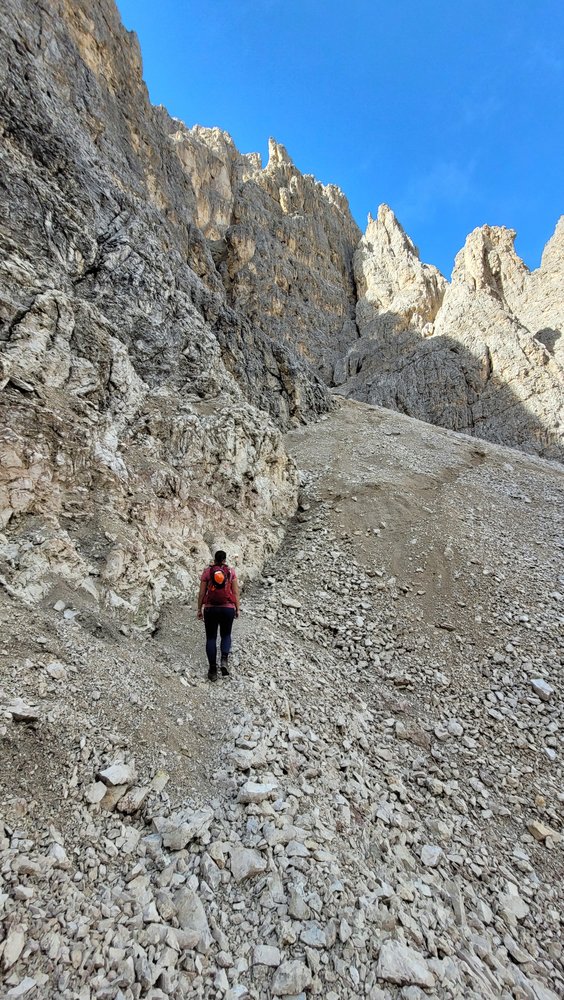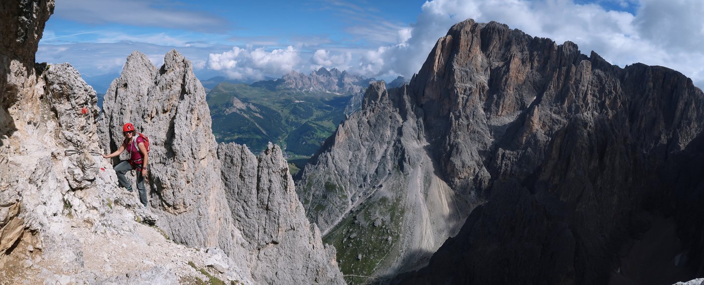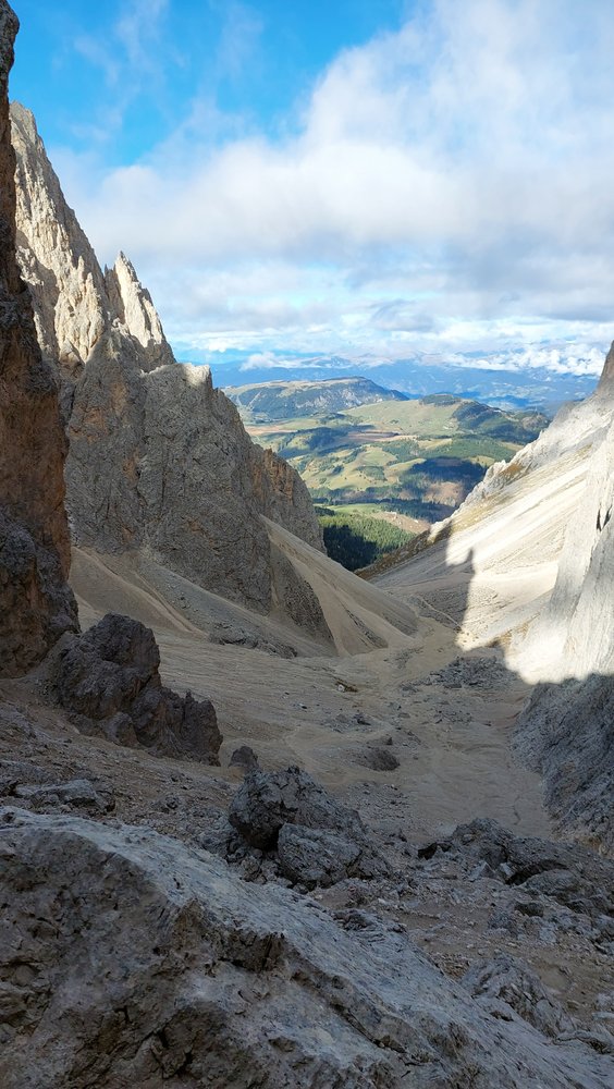 Konditionsstarke Bergsteiger können beim Zustieg die Ferrata Furcela de Saslonch (Klettersteig Langkofelscharte) als kurze Ferrata zum Aufwärmen in den Tourentag mit einbauen.