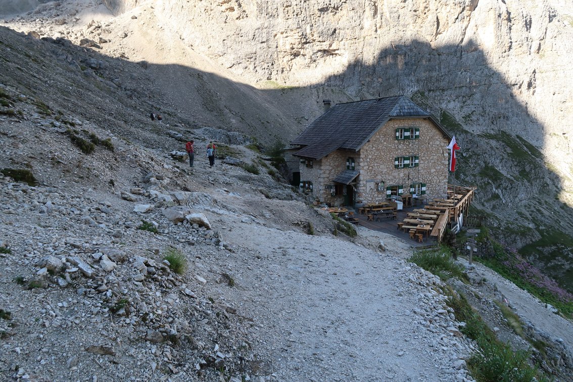 Anm.: Man erreicht die Langkofel Hütte auch ohne Gondelbahn vom Monte Pana, 1636 m, bei St. Christina auf dem Weg 525 über die Pian di Confì (3 Std.).