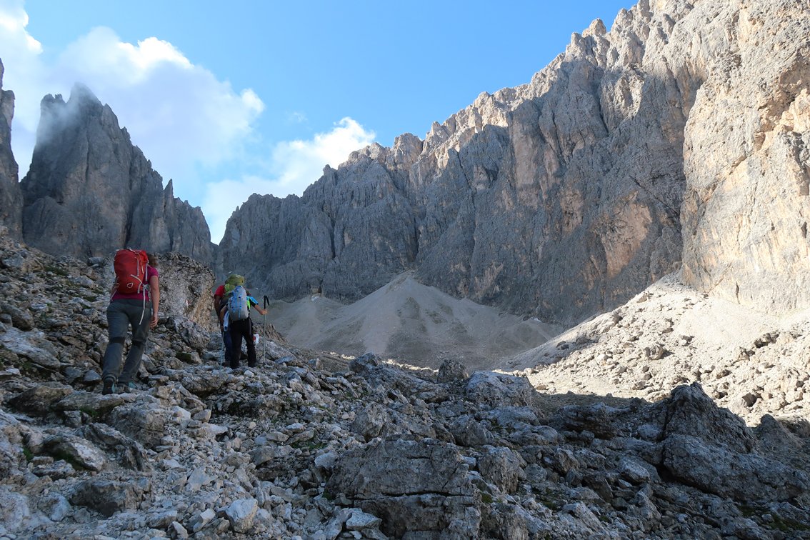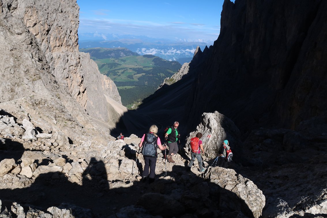 Über die riesige, mit Schotter und wenigen unschwierigen kleinen Felsstufen versehene Südwestflanke auf dem Weg 527 zur Plattkofelhütte bzw. noch davor, auf ca. 2485 m bereits links direkt zum Friedrich August Weg absteigen (Abkürzung, ca. ¼ Std. Zeitersparnis). Auf diesem, vorbei an den Hütten Rif. Sandro Pertini und Rif. Friedrich August, zurück zum Sella Joch.