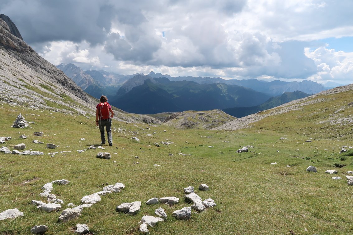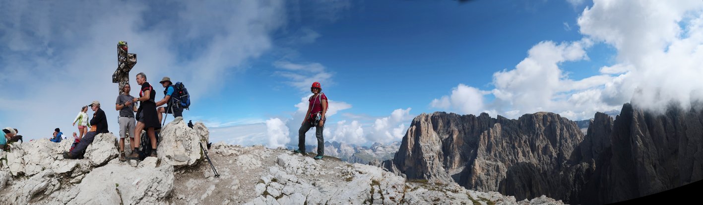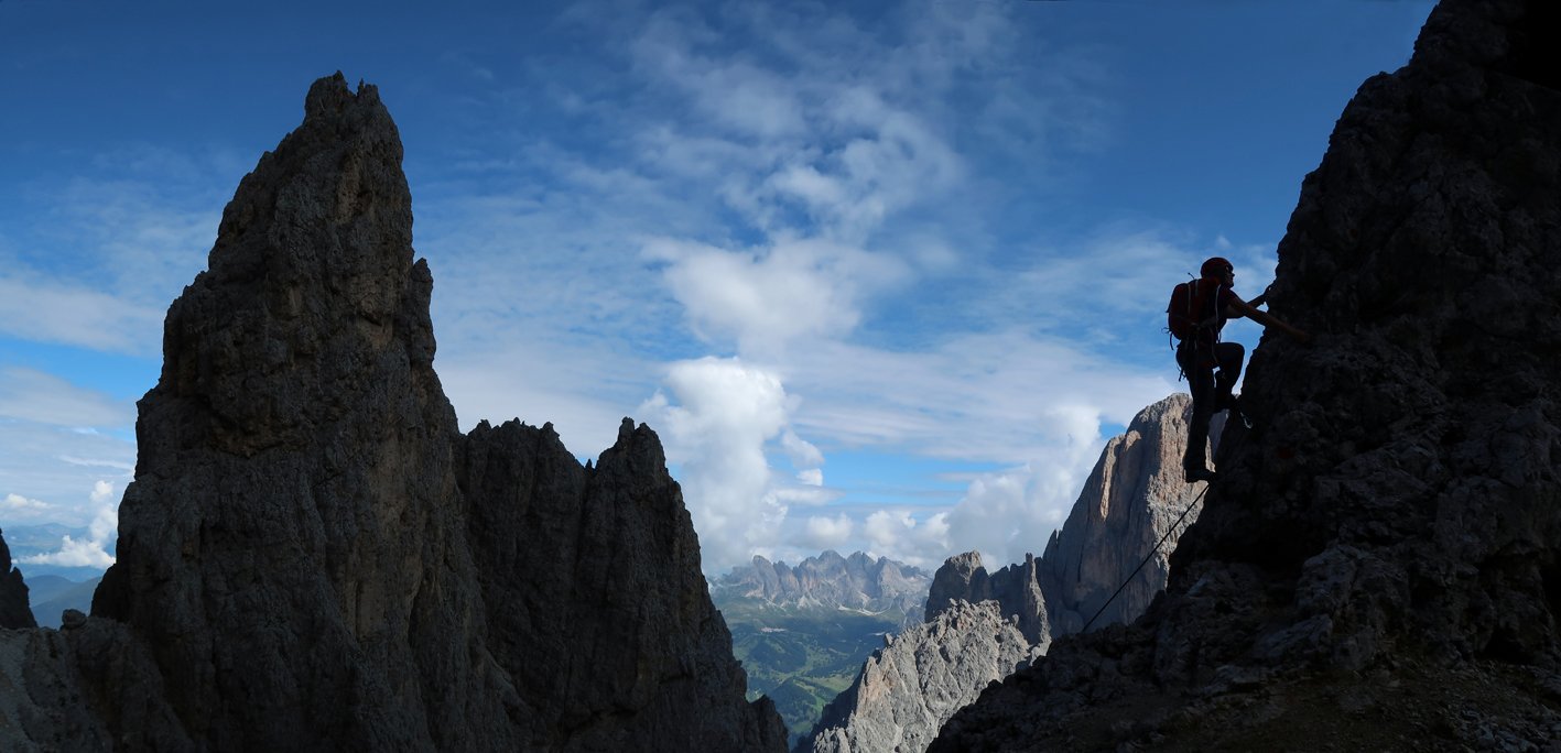 Der Plattkofel ist ein Berg der Gegensätze. Auf der Südwestseite – nomen est omen – zieht eine elendslange flache Schuttplatte hinauf bis zum Gipfel, dagegen fallen auf der Nordostseite die Wände senkrecht ins Plattkofelkar ab. Oskar Schuster, einer der deutschen Kletterpioniere in den Dolomiten, der auch Spuren in den Alpen, dem Kaukasus und vor allem im Elbsandsteingebirge in Sachsen hinterlassen hat, markierte 1895 entlang der Wände des Plattkofels einen kühnen Aufstieg, der heute, an den schwierigsten Stellen stahlseilversichert, ein beliebter Klettersteig ist. Der sächsischen Klettertradition folgend ist der Steig nicht komplett versichert und erfordert ein gewisses Maß an Trittsicherheit und alpiner Erfahrung. Belohnt wird der Aufstieg mit einem einzigartigen Ausblick in den Rachen des Plattkofel- und Langkofelkars, auf den Gletscher der Marmolada und die sanften Wiesen der Seiser Alm. Gegensätze, wie sie nur in den Dolomiten zu finden sind.