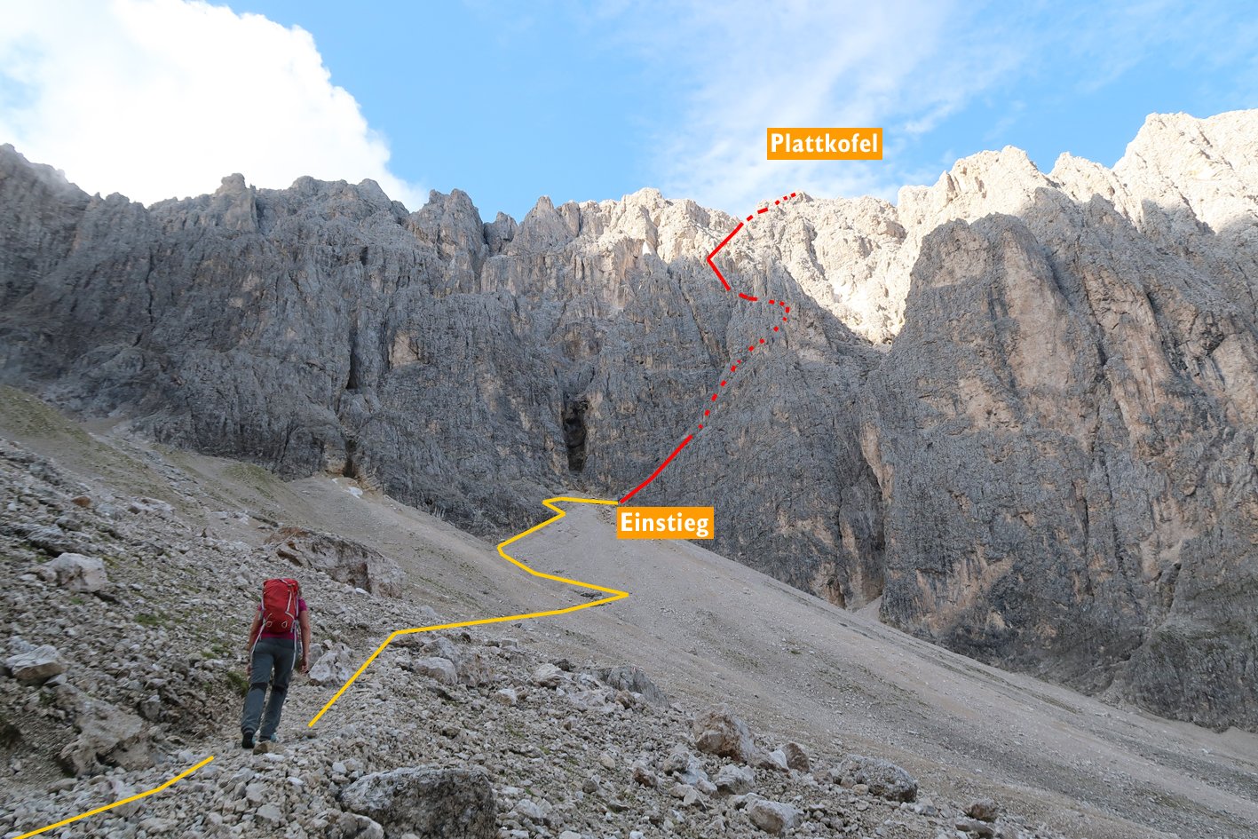 Auffahrt mit der Gondelbahn zur Langkofelscharte (erreichbar in 1-1½ Std. auf dem Wanderweg vom Sellapass). Von der Scharte auf dem Weg 525 ca. 350 Hm steil bis zur Langkofel Hütte absteigen. Links von der Hütte auf dem rot markierten Weg ins Plattkofelkar aufsteigen. Oben in der Schutthalde entlang der Punktmarkierung zum Einstieg. Der Einstieg ist im rechten Teil des Kares, davor ist fast immer ein Altschneefeld.