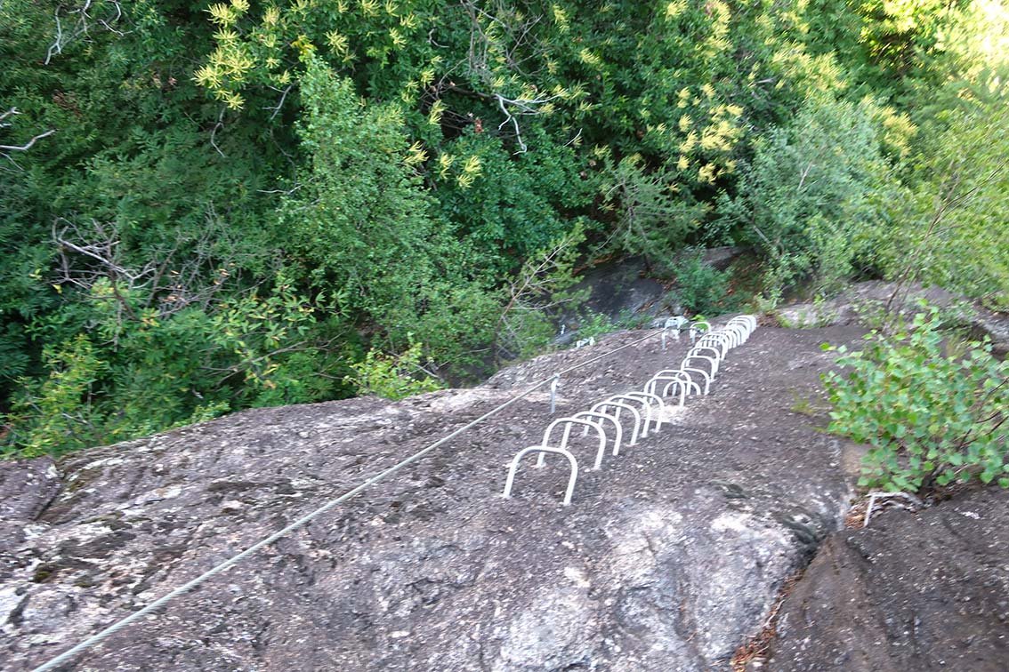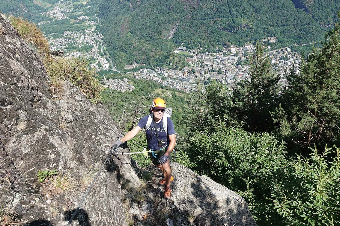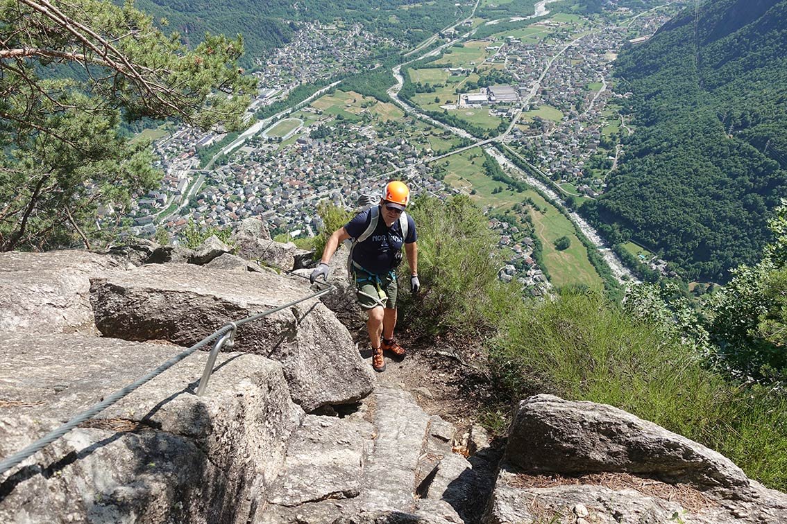 Der Percorso Attrezzato Daloo ist die deutlich einfachere Variante zur Ferrata Pietro Biasini. Über Rampen und kurze Steilstufe erreicht man das Plateau mit dem Bergdorf Daloo. Nach dem man etwas beim schönen Aussichtspunkt mit dem perfekten Bergell-Blick verweilt hat, steigt man auf dem Wanderweg wieder nach Pianazzola ab. Für Einsteiger und Kinder (der Steig ist aber lang; evtl. Sicherungsseil) ist diese Aufstiegsmöglichkeit sicher eine Alternative zur fordernden Ferrata links davon.