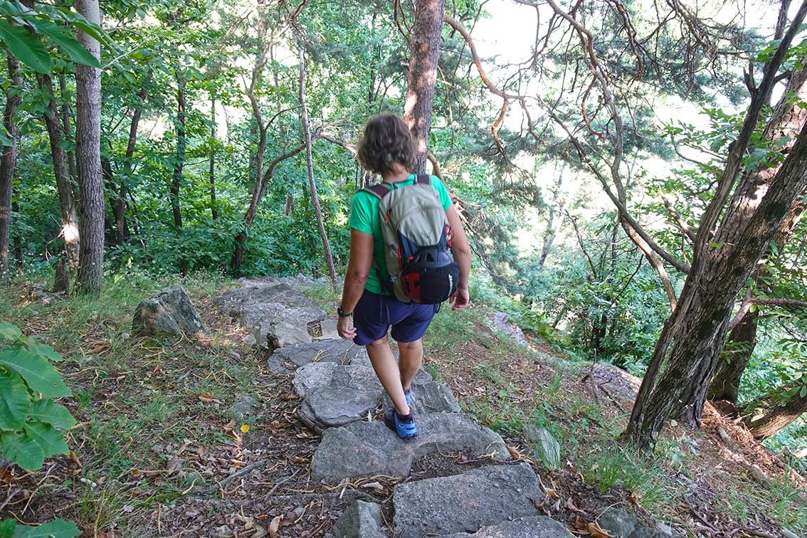 Vom Steigende hinauf zur Wiese neben dem Ort Daloo und nach rechts zum schon sichtbaren Aussichtspunkt. Beim Aussichtspunkt beginnt der Wanderweg zurück nach Pianazzola, auf dem man durch den Buschwald wieder bis zum Parkplatz absteigt.