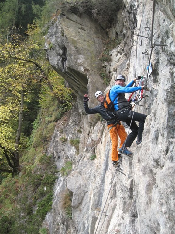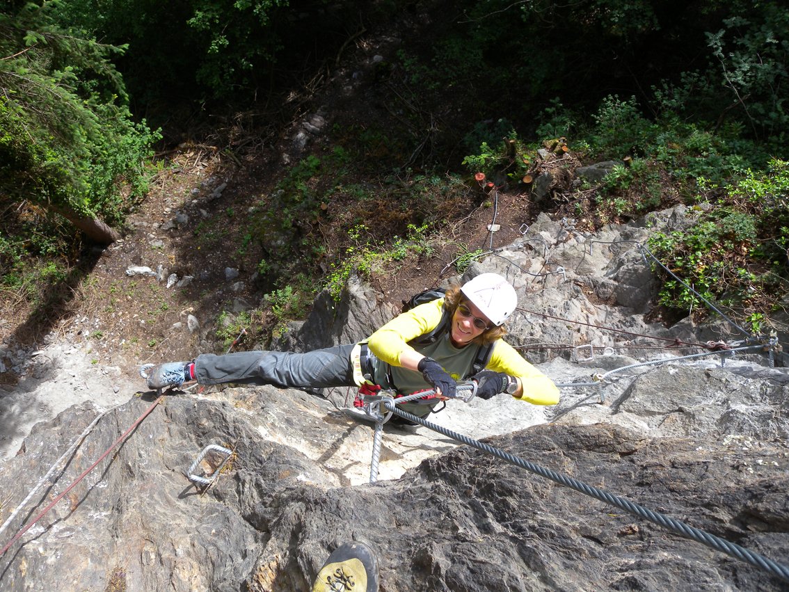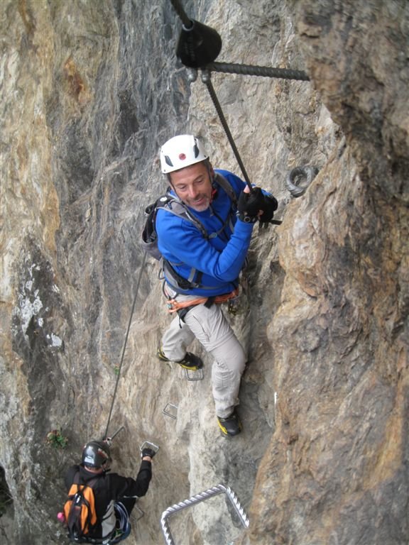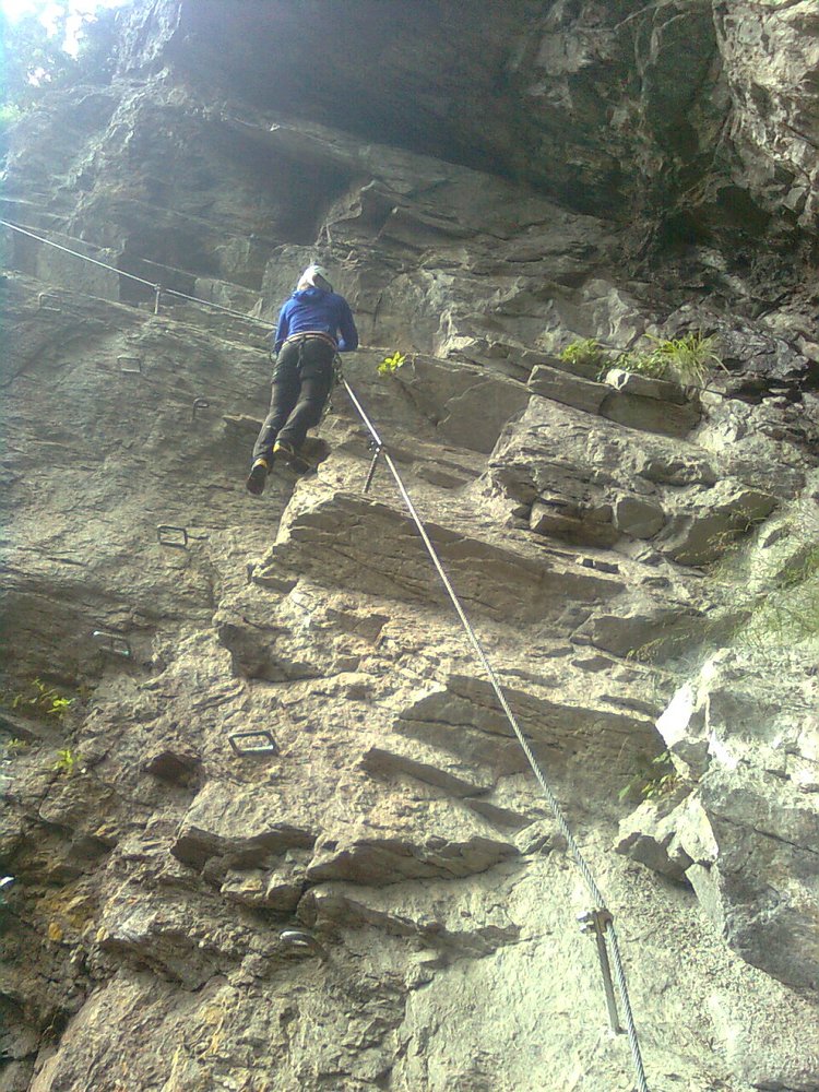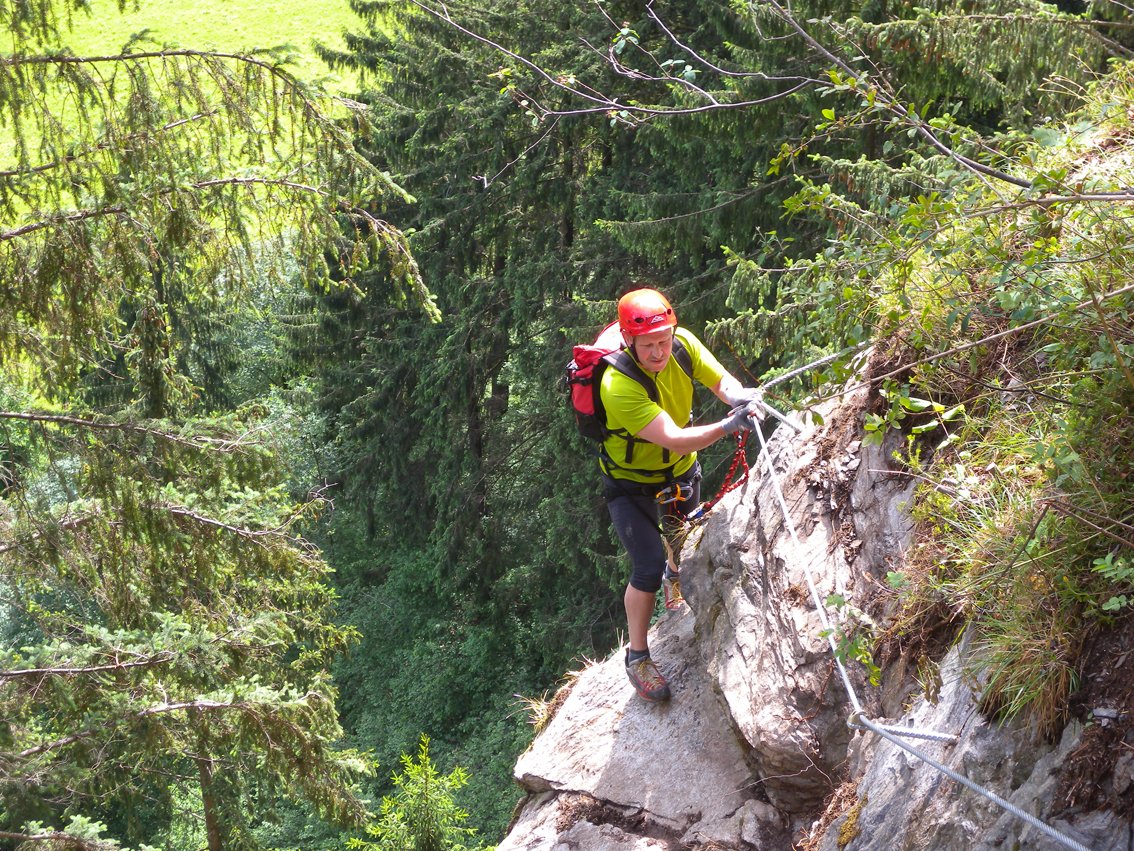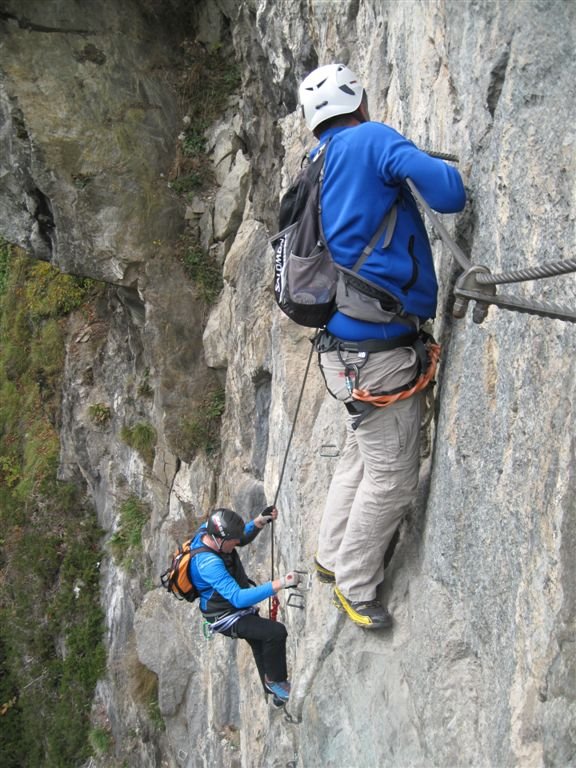 Komplette Klettersteigausrüstung; für Schwächere ein Sicherungsseil.