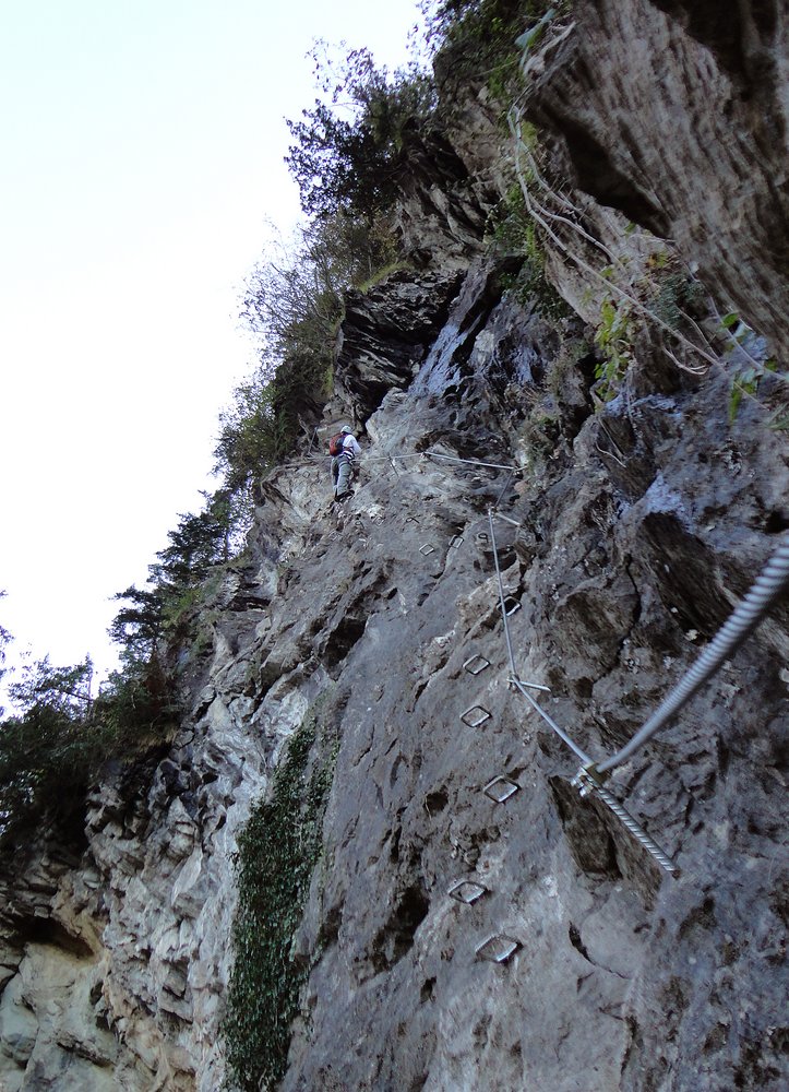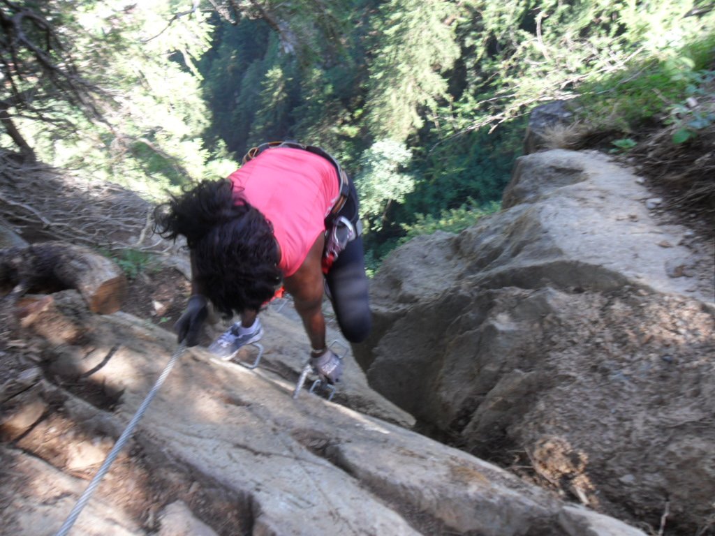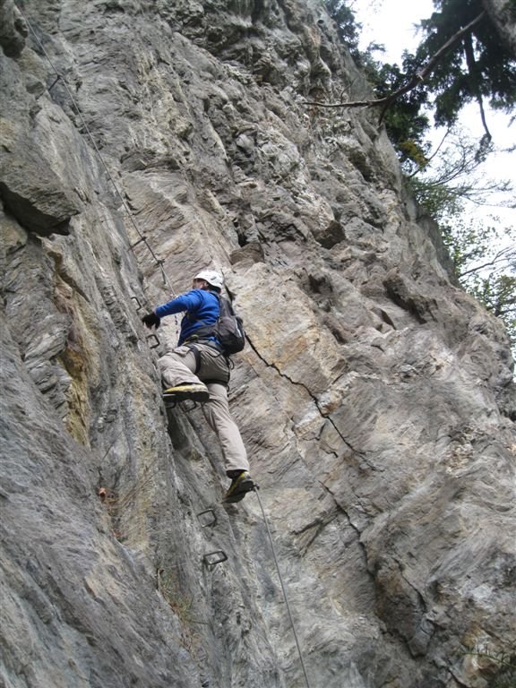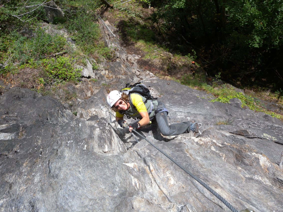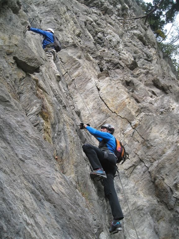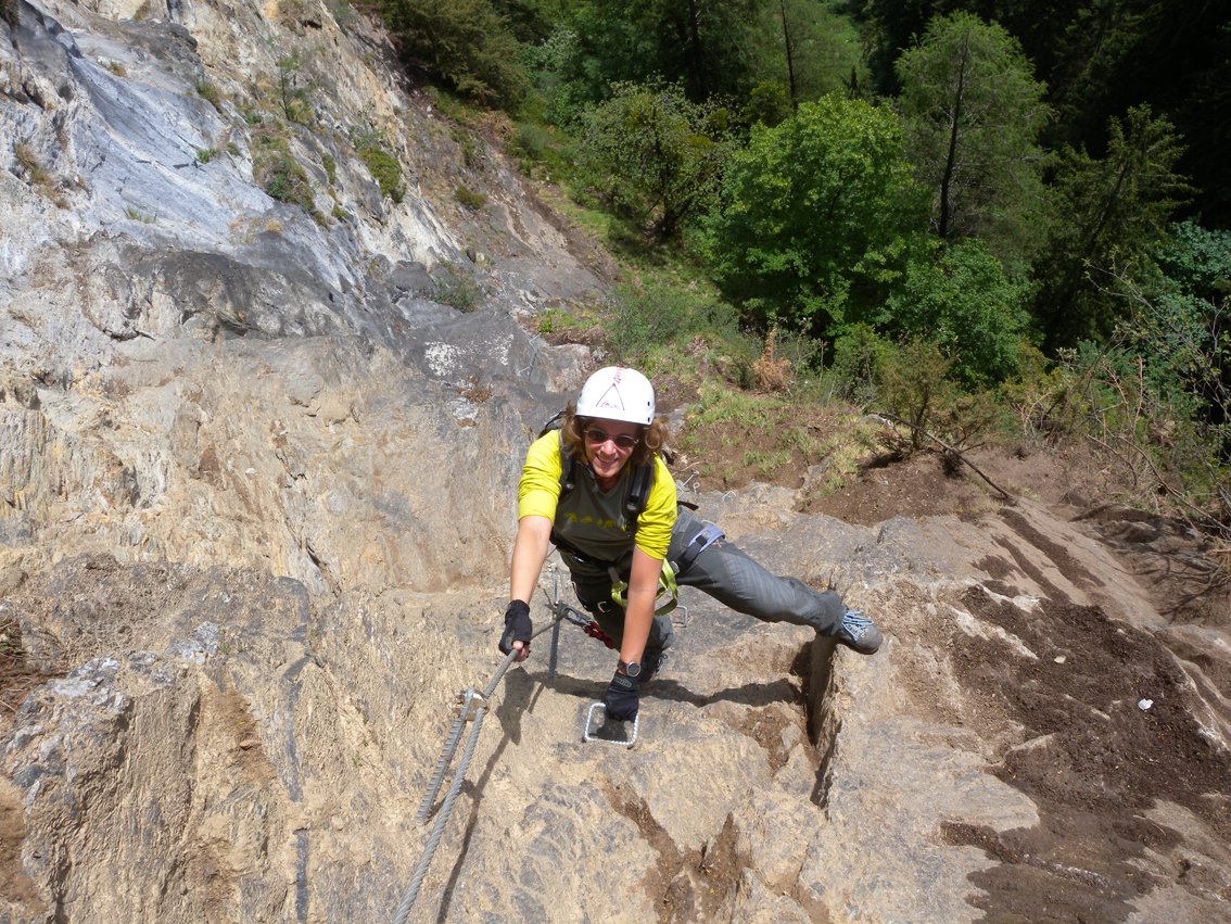 Komplette Klettersteigausrüstung; für Schwächere ein Sicherungsseil.