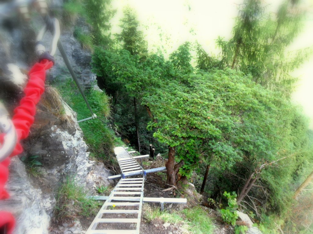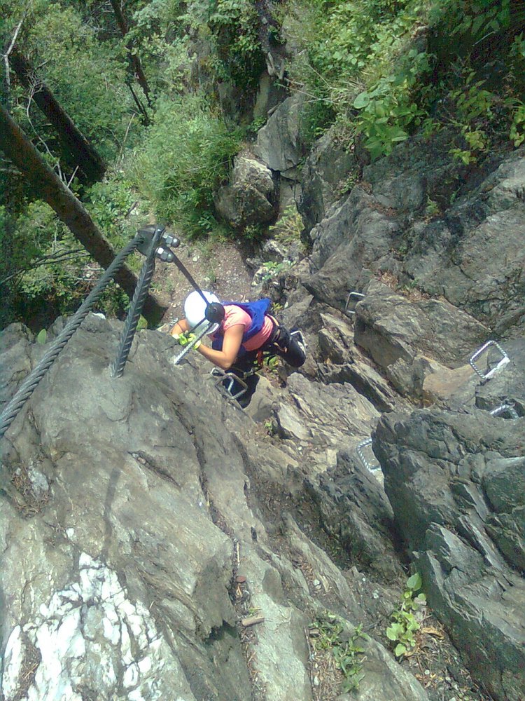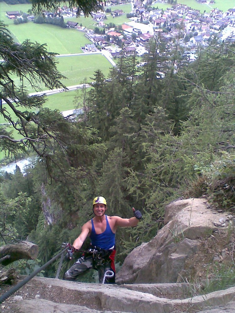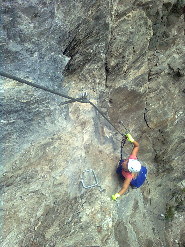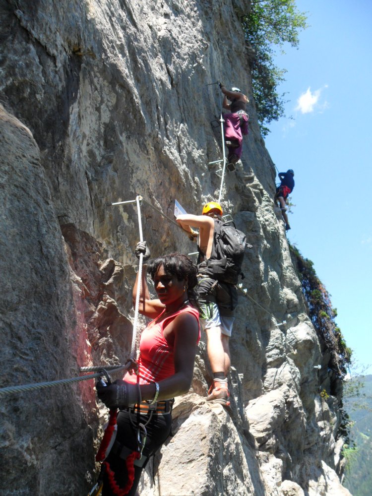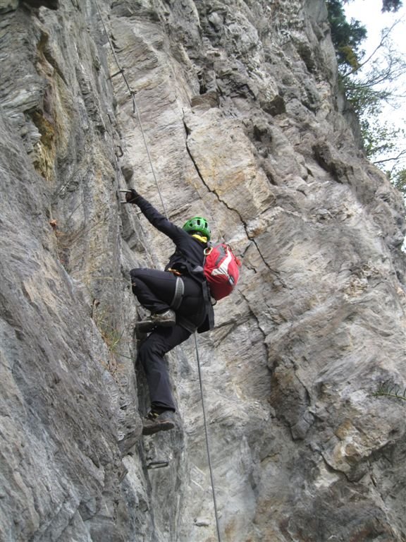 Komplette Klettersteigausrüstung; für Schwächere ein Sicherungsseil.