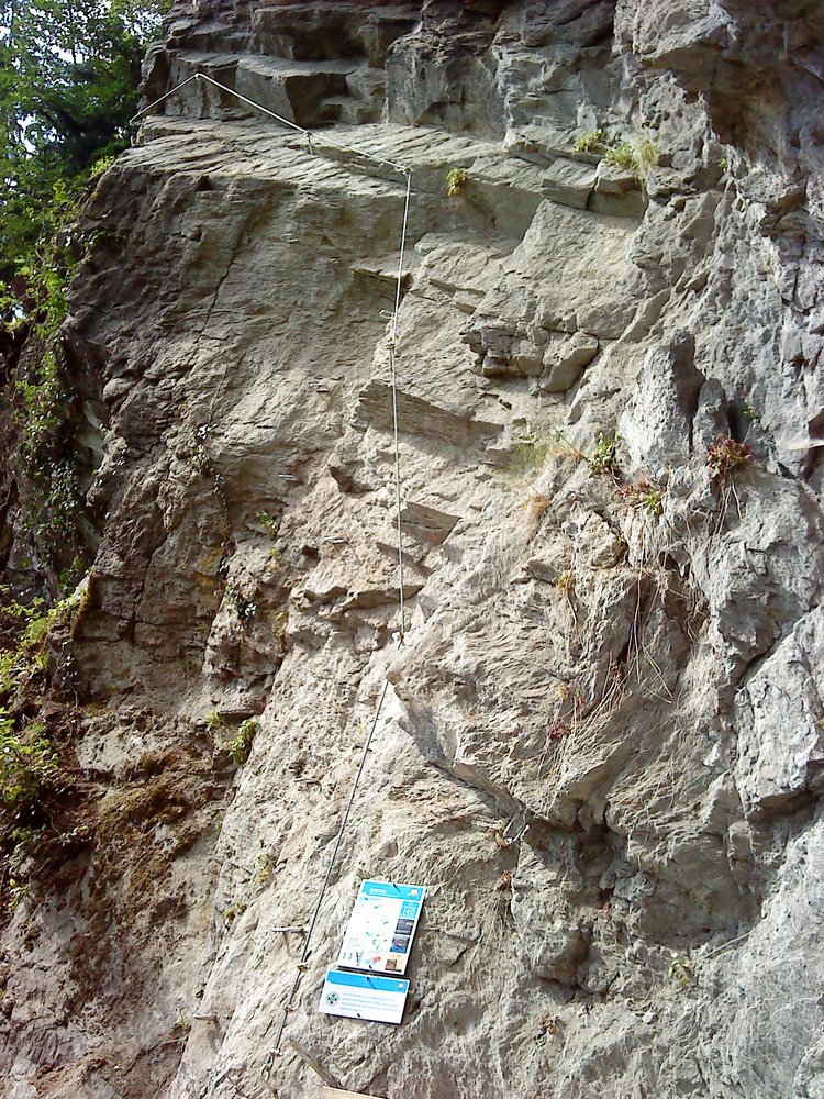Siehe Topo. Die schweren Passagen (C/D) sind recht gleichmäßig an der Wand verteilt, davor bzw. danach klettert man meist im Schwierigkeitsgrad C. Auf den Bändern geht es etwas leichter zu, auch leichte Gehpassagen und Aluleitern (A) sind vorhanden.