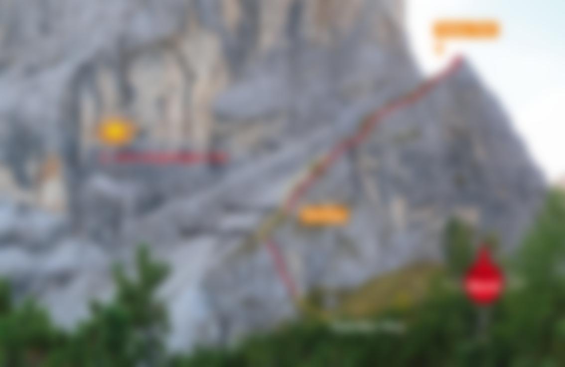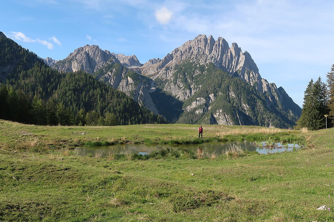 Links haltend über den Rudl-Eller-Weg zurück zum Ausgangspunkt, altrernativ auf dem Rudl-Eller Weg weiter unterhalb der Laserzwand entlang bis zum Fahrweg, dann auf diesem entweder zur Karlsbaderhütte aufsteigen oder zur Dolomitenhütte absteigen.