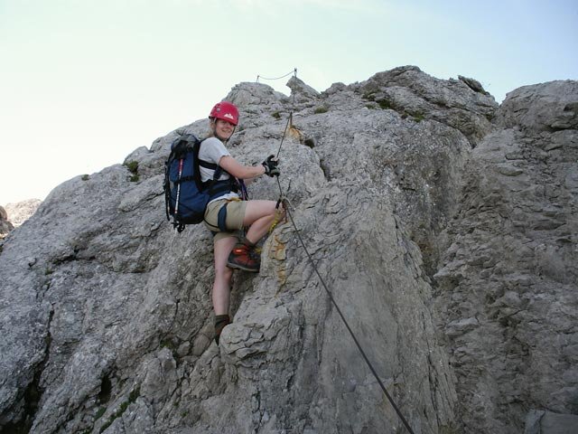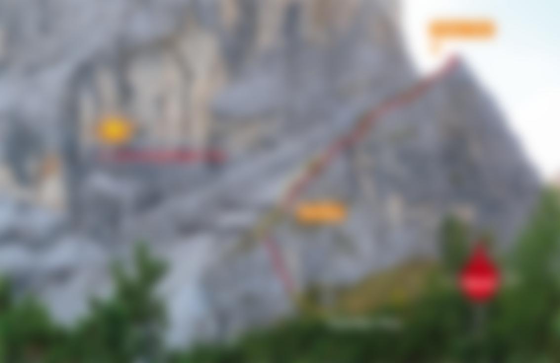Siehe Topo. Meist entlang der Kante in unterschiedlicher Schwierigkeit (max. B) empor. Ganz zum Schluss eine steile Wand (B/C) abklettern.