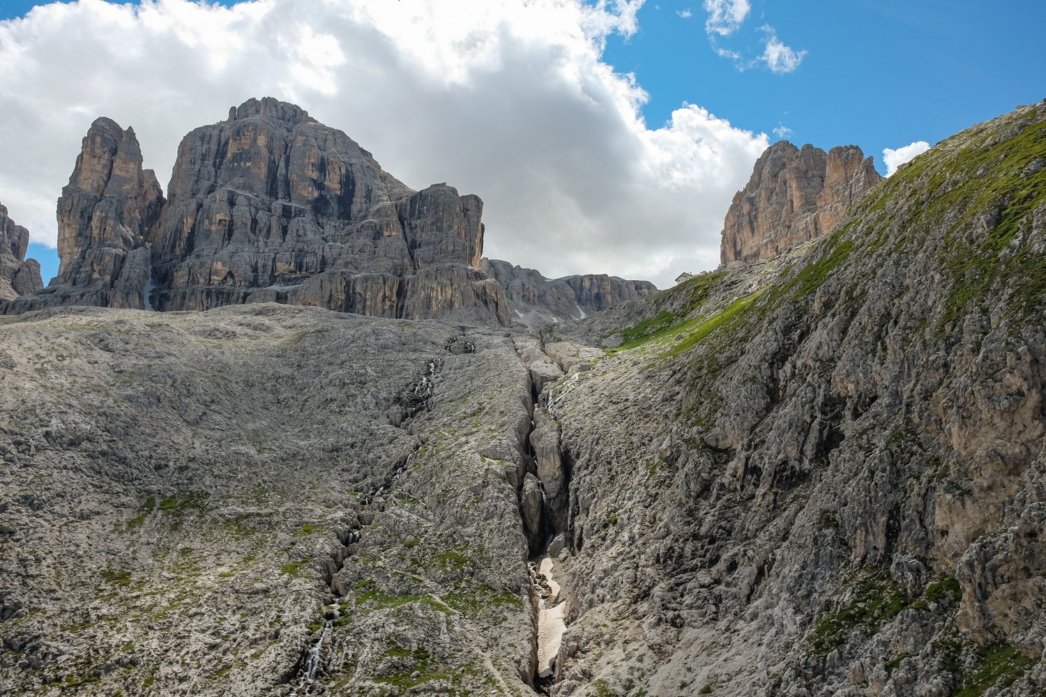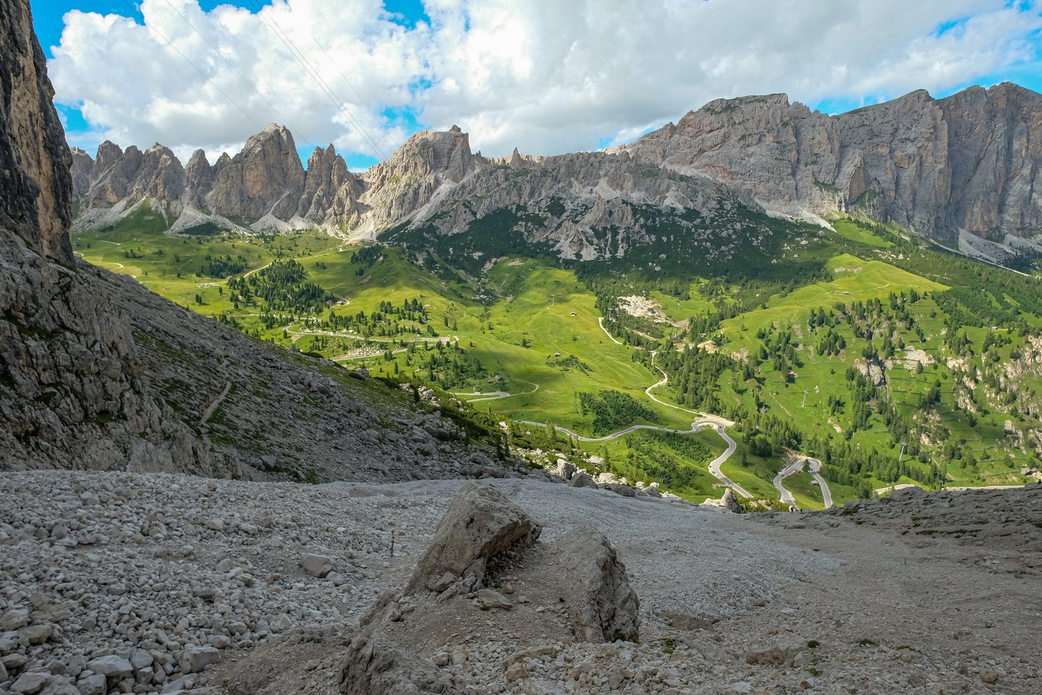 Auf der A22 Ausfahrt Klausen und auf der SS 242 ins Grödnertal bis Wolkenstein und auf der SS243 hinauf auf das Grödner Joch von der Passhöhe ca. 2,3 km Richtung Corvara zu einem Parkplatz (im Bereich einer Schottergrube), 1956 m, in einer Kehre. Dorthin kommt man auch von Corvara nach ca. 7 km.