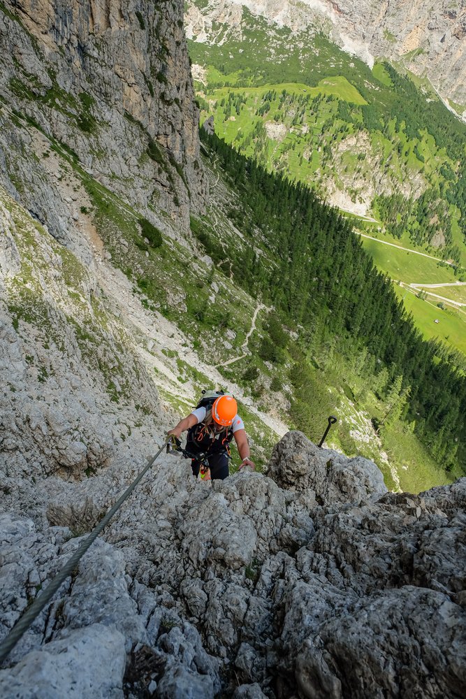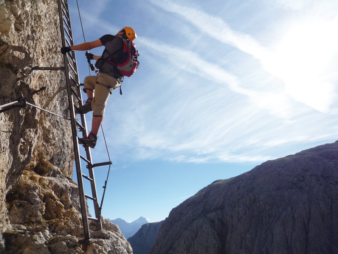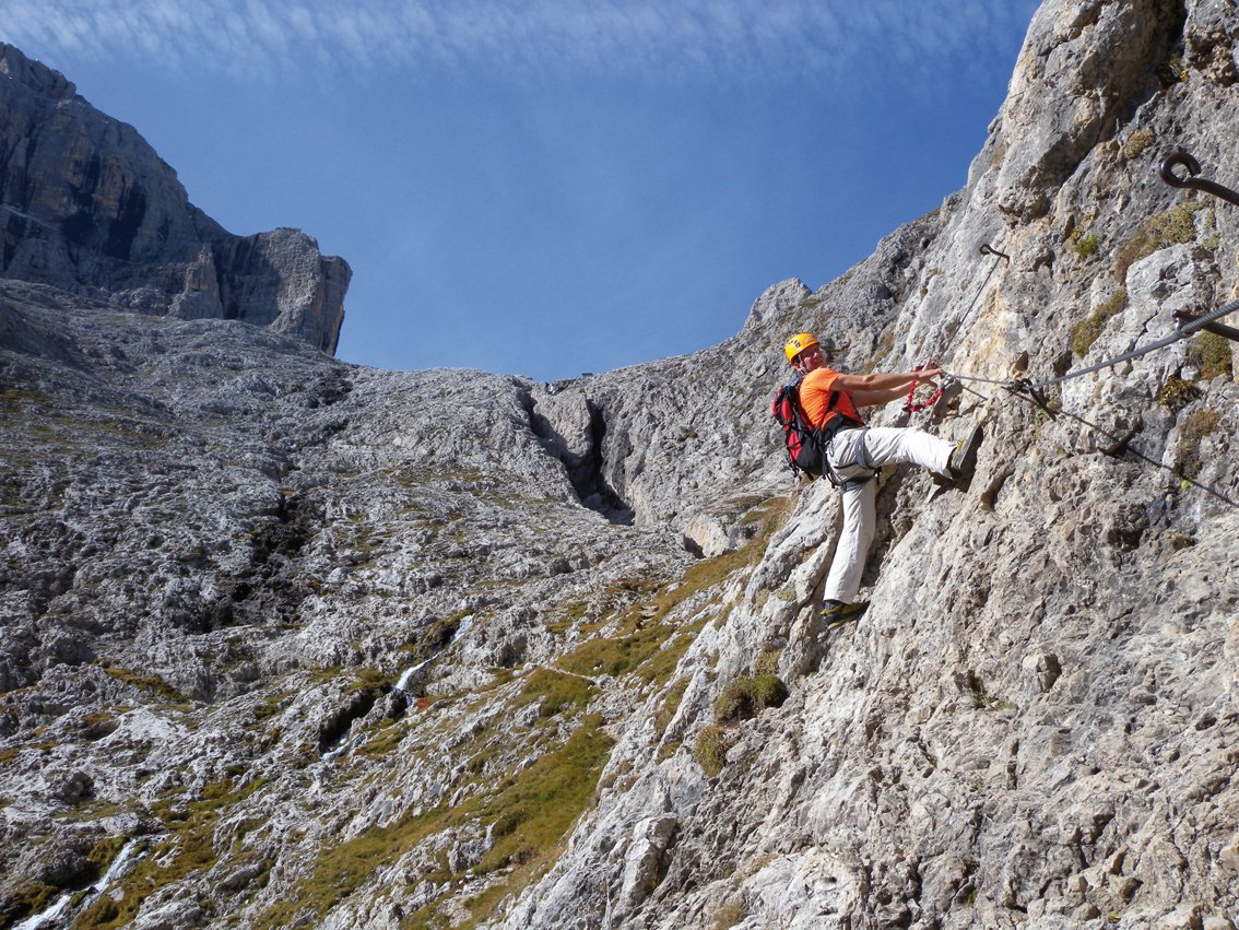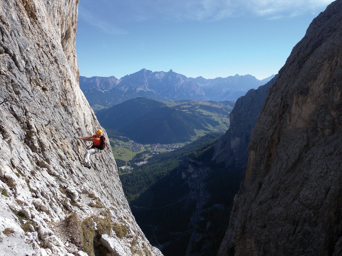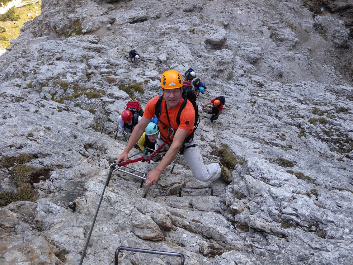 Der Pisciadu Klettersteig in der Sella Gruppe ist die meistbegangene Via ferrata in den Dolomiten, wobei die Berühmtheit vollkommen gerechtfertigt ist: Der Steig besitzt einen Parkplatz beim Einstieg, fordernde - aber niemals besonders schwierige - Passagen in einer Kulisse, die ihresgleichen sucht, imposante senkrechte Kletterpassagen am Exnerturm, eine Hängebrücke, eine bewirtschaftete Hütte mit Bergsee beim Ausstieg, ein lohnendes Gipfelziel (Cima Pisciadù, 2985 m) und nicht zuletzt den landschaftlich schönen Abstieg durch das Mittagstal. Gerade deshalb sollte man etwas Zeit mitbringen - Staugefahr ist an Wochenenden meist vorprogrammiert. Der Klettersteig ist der Auftakt für die Sella-Durchquerung, große Gruppen machen das Überholen fast unmöglich - wer es genießen will kommt an einem Wochentag oder steigt später ein.