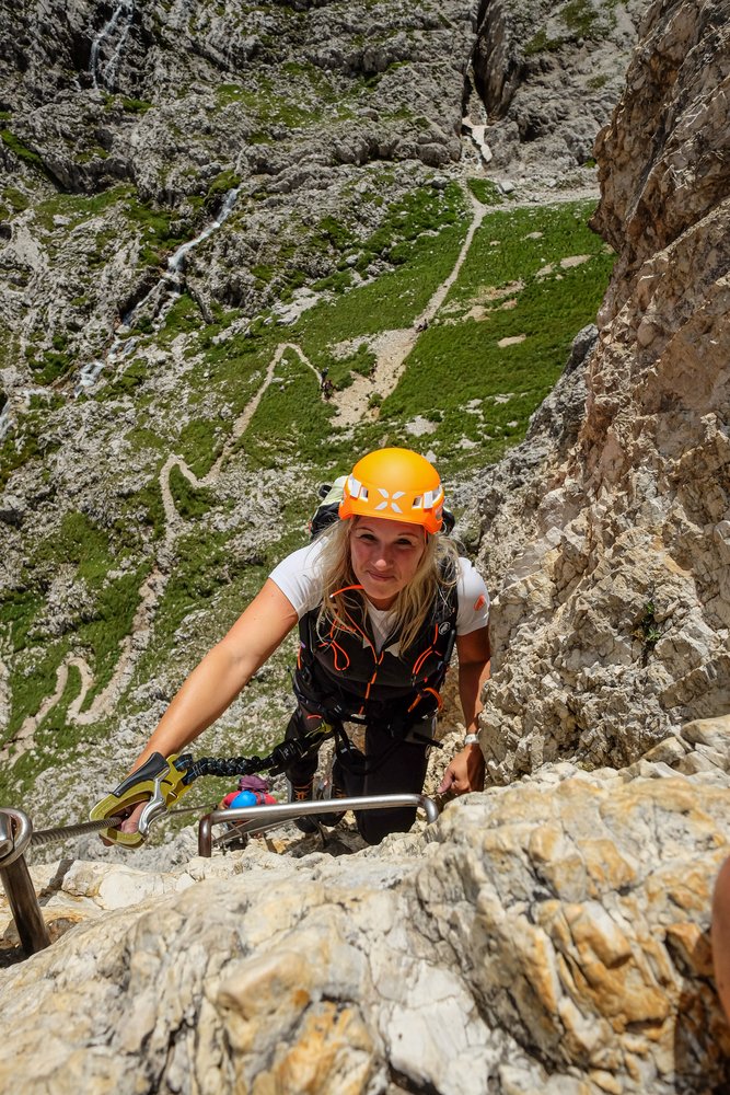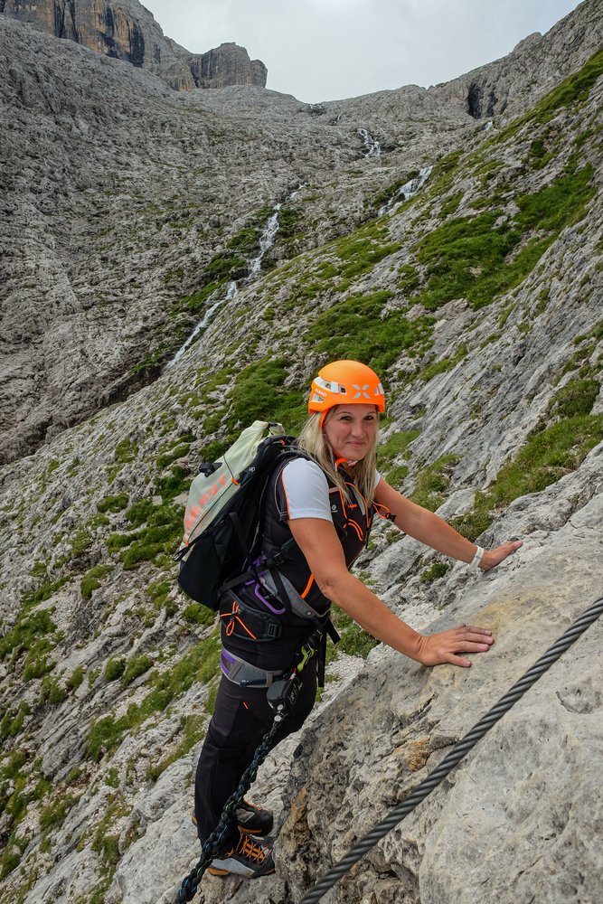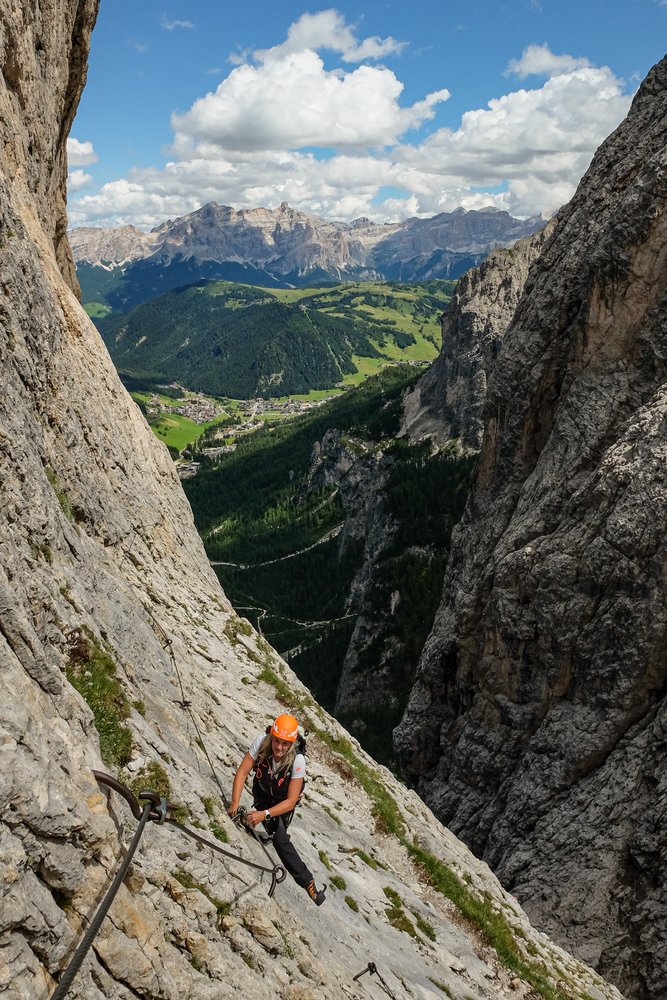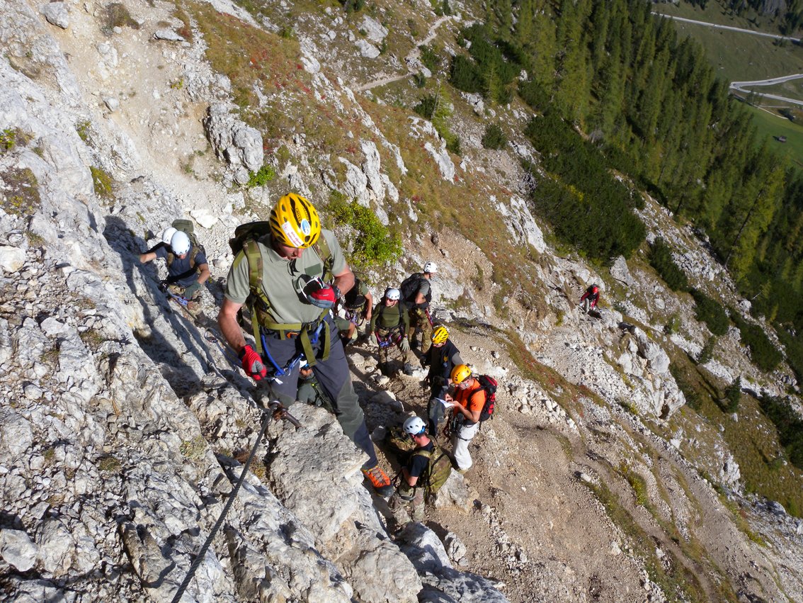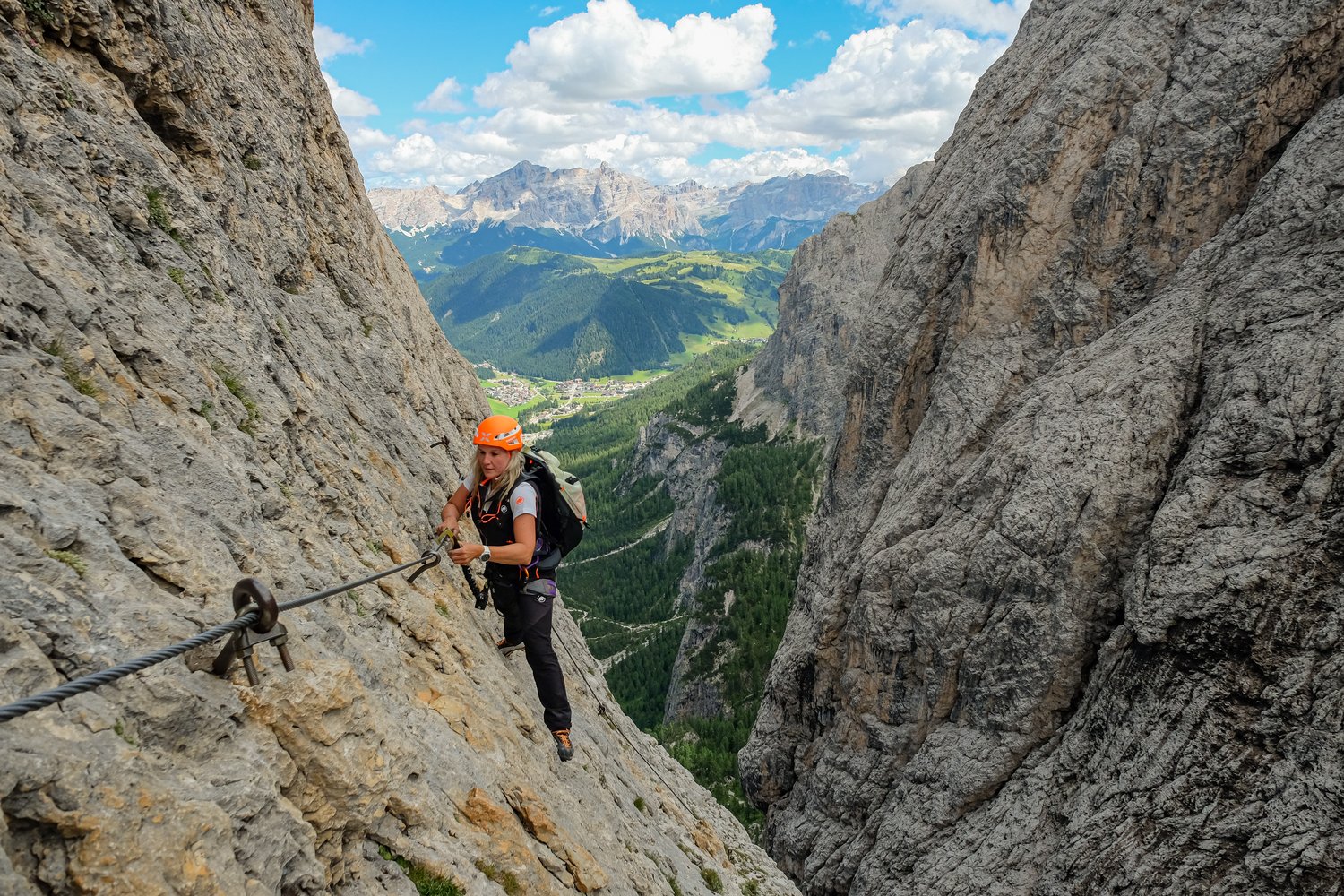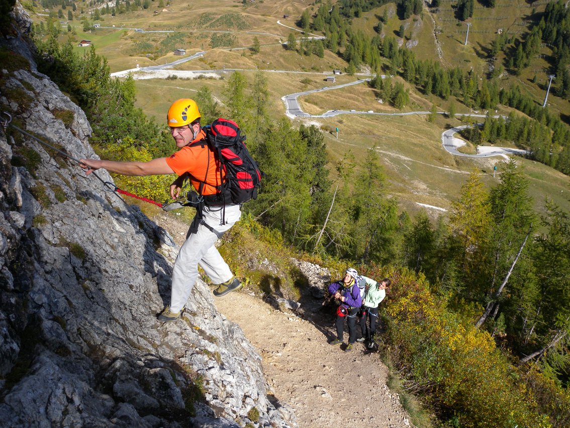 Der Pisciadu Klettersteig in der Sella Gruppe ist die meistbegangene Via ferrata in den Dolomiten, wobei die Berühmtheit vollkommen gerechtfertigt ist: Der Steig besitzt einen Parkplatz beim Einstieg, fordernde - aber niemals besonders schwierige - Passagen in einer Kulisse, die ihresgleichen sucht, imposante senkrechte Kletterpassagen am Exnerturm, eine Hängebrücke, eine bewirtschaftete Hütte mit Bergsee beim Ausstieg, ein lohnendes Gipfelziel (Cima Pisciadù, 2985 m) und nicht zuletzt den landschaftlich schönen Abstieg durch das Mittagstal. Gerade deshalb sollte man etwas Zeit mitbringen - Staugefahr ist an Wochenenden meist vorprogrammiert. Der Klettersteig ist der Auftakt für die Sella-Durchquerung, große Gruppen machen das Überholen fast unmöglich - wer es genießen will kommt an einem Wochentag oder steigt später ein.