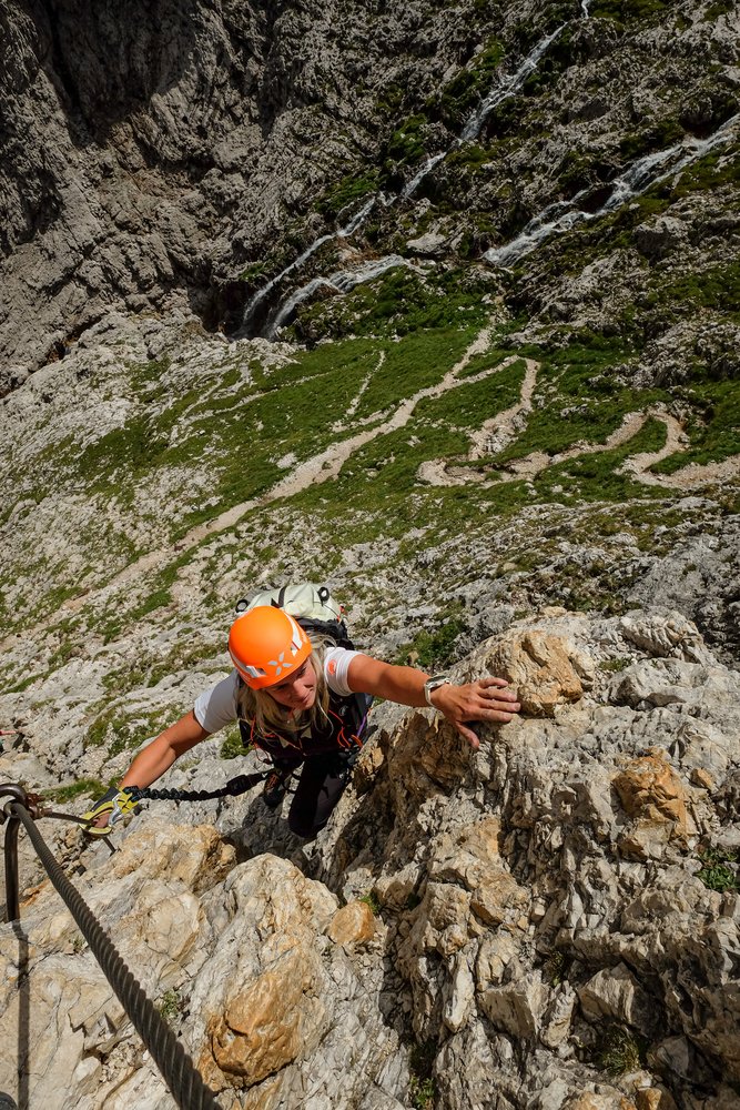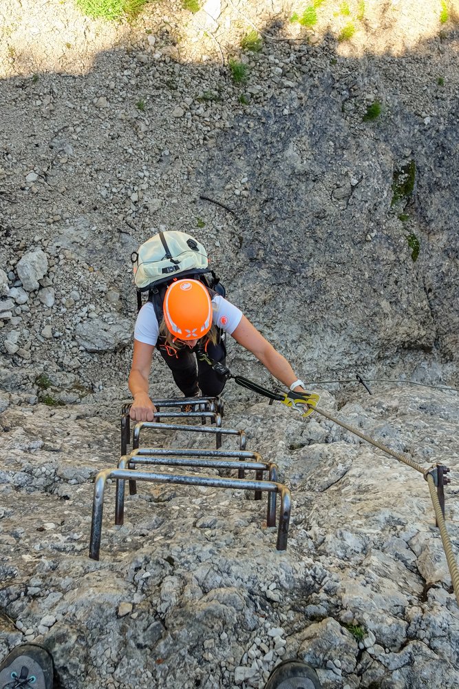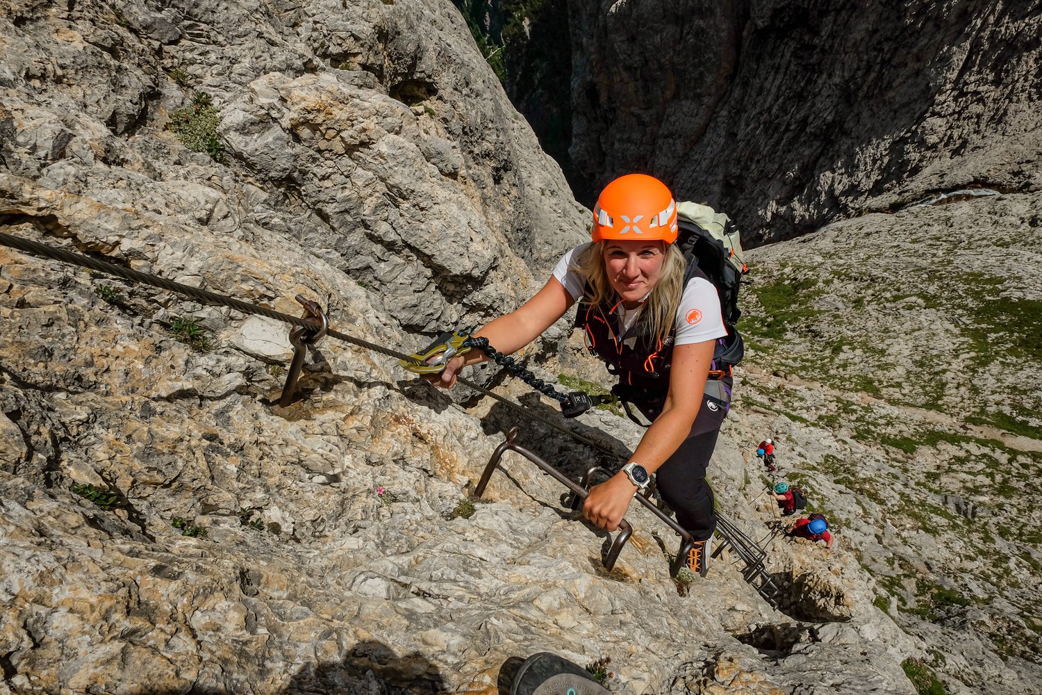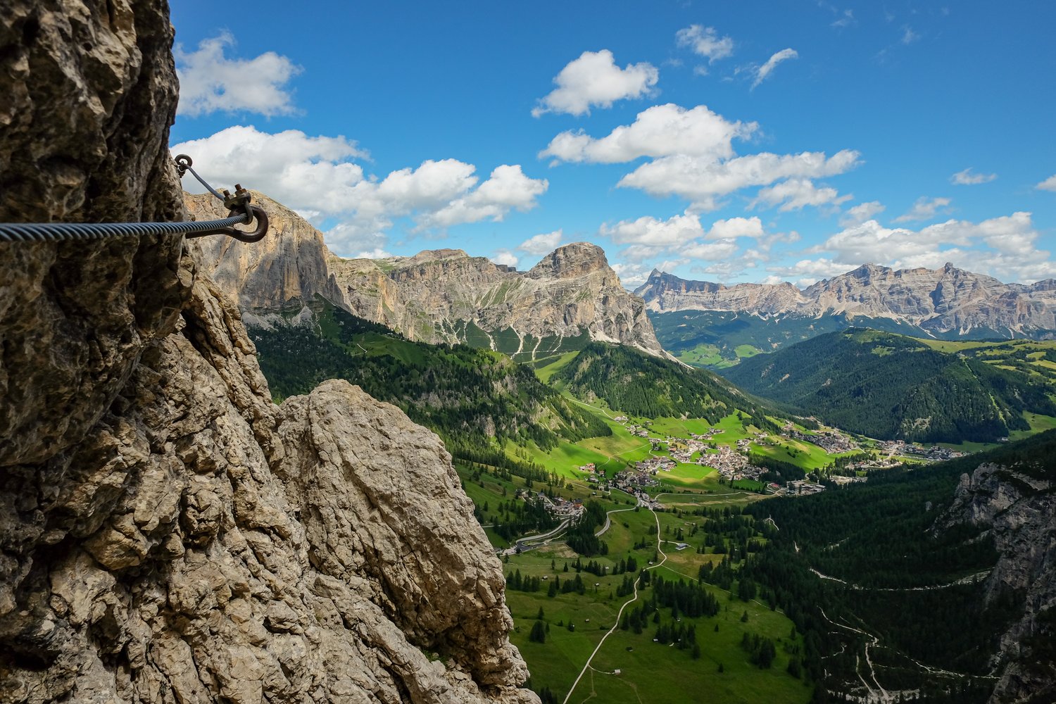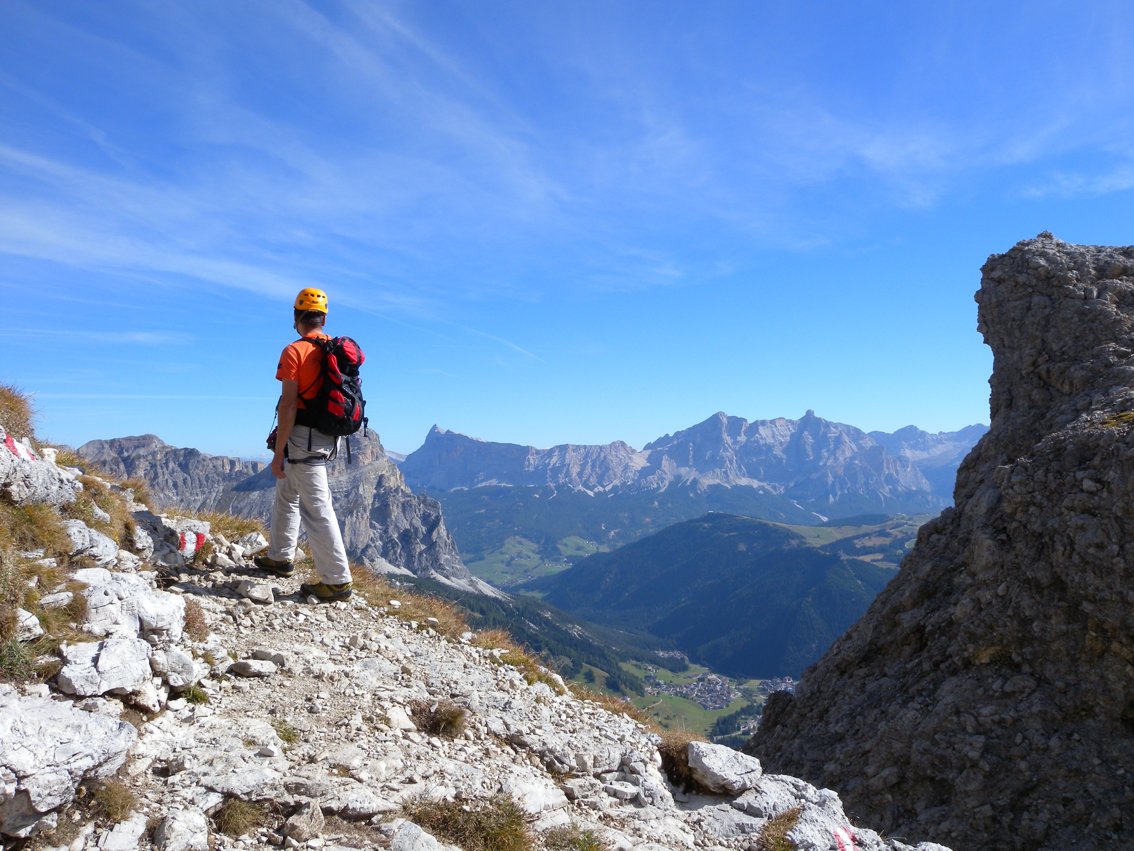 Der Pisciadu Klettersteig in der Sella Gruppe ist die meistbegangene Via ferrata in den Dolomiten, wobei die Berühmtheit vollkommen gerechtfertigt ist: Der Steig besitzt einen Parkplatz beim Einstieg, fordernde - aber niemals besonders schwierige - Passagen in einer Kulisse, die ihresgleichen sucht, imposante senkrechte Kletterpassagen am Exnerturm, eine Hängebrücke, eine bewirtschaftete Hütte mit Bergsee beim Ausstieg, ein lohnendes Gipfelziel (Cima Pisciadù, 2985 m) und nicht zuletzt den landschaftlich schönen Abstieg durch das Mittagstal. Gerade deshalb sollte man etwas Zeit mitbringen - Staugefahr ist an Wochenenden meist vorprogrammiert. Der Klettersteig ist der Auftakt für die Sella-Durchquerung, große Gruppen machen das Überholen fast unmöglich - wer es genießen will kommt an einem Wochentag oder steigt später ein.