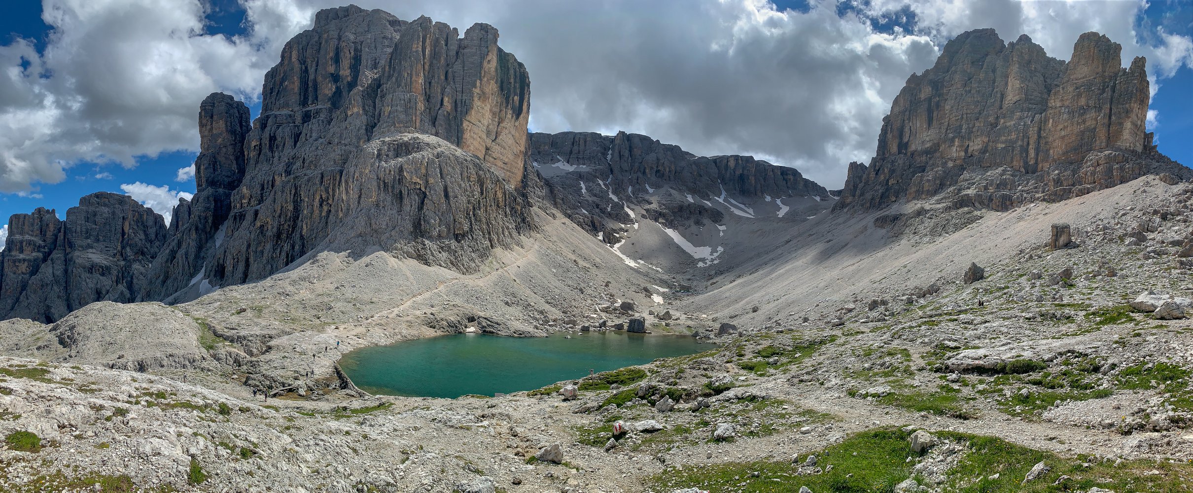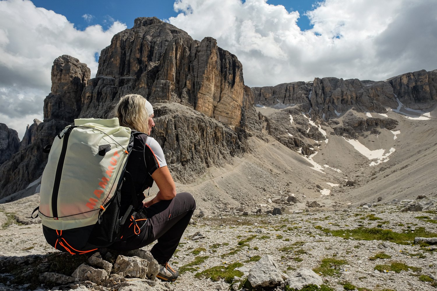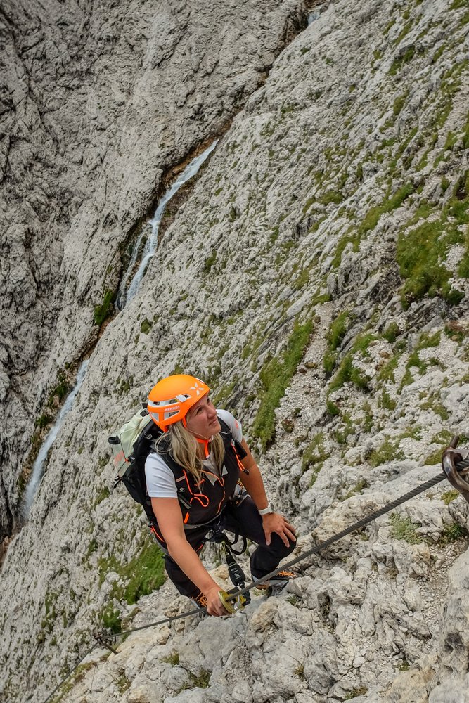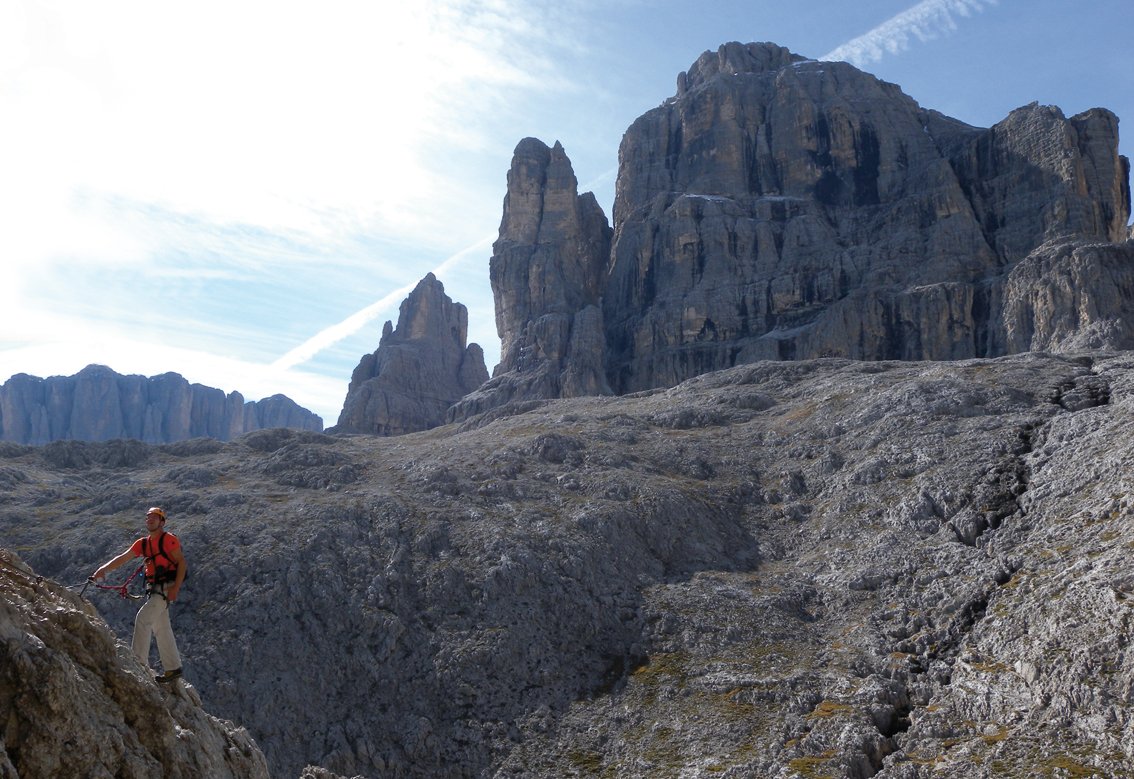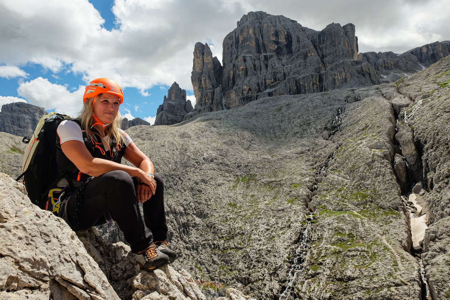 Der Pisciadu Klettersteig in der Sella Gruppe ist die meistbegangene Via ferrata in den Dolomiten, wobei die Berühmtheit vollkommen gerechtfertigt ist: Der Steig besitzt einen Parkplatz beim Einstieg, fordernde - aber niemals besonders schwierige - Passagen in einer Kulisse, die ihresgleichen sucht, imposante senkrechte Kletterpassagen am Exnerturm, eine Hängebrücke, eine bewirtschaftete Hütte mit Bergsee beim Ausstieg, ein lohnendes Gipfelziel (Cima Pisciadù, 2985 m) und nicht zuletzt den landschaftlich schönen Abstieg durch das Mittagstal. Gerade deshalb sollte man etwas Zeit mitbringen - Staugefahr ist an Wochenenden meist vorprogrammiert. Der Klettersteig ist der Auftakt für die Sella-Durchquerung, große Gruppen machen das Überholen fast unmöglich - wer es genießen will kommt an einem Wochentag oder steigt später ein.