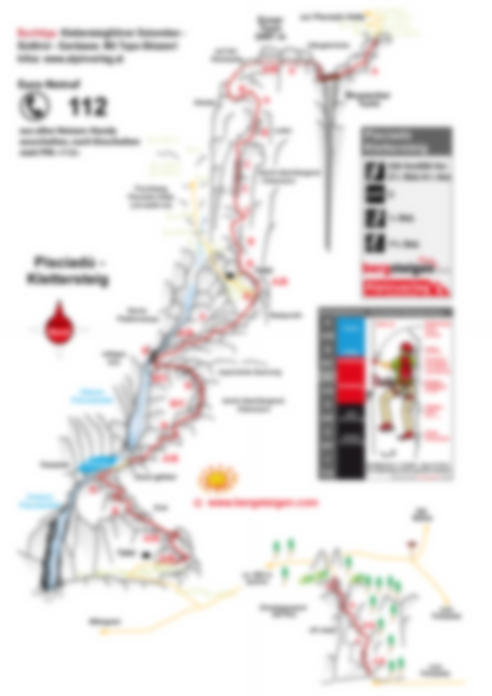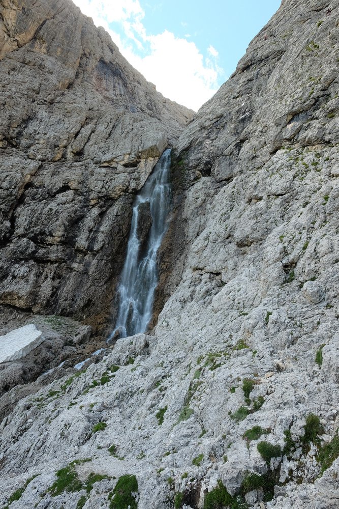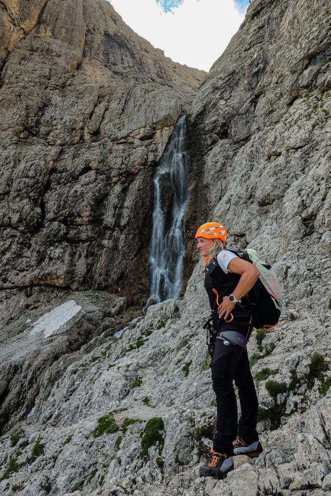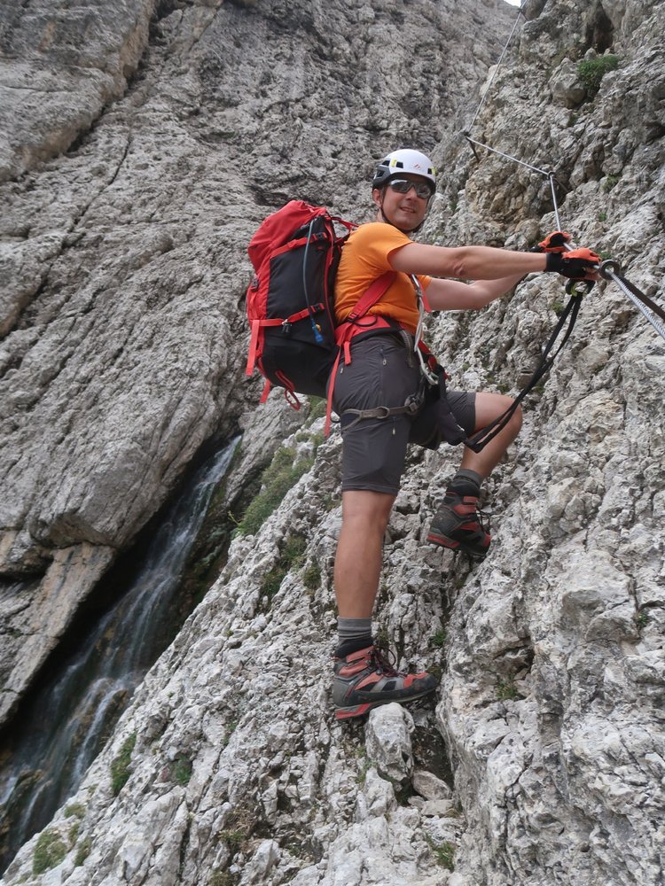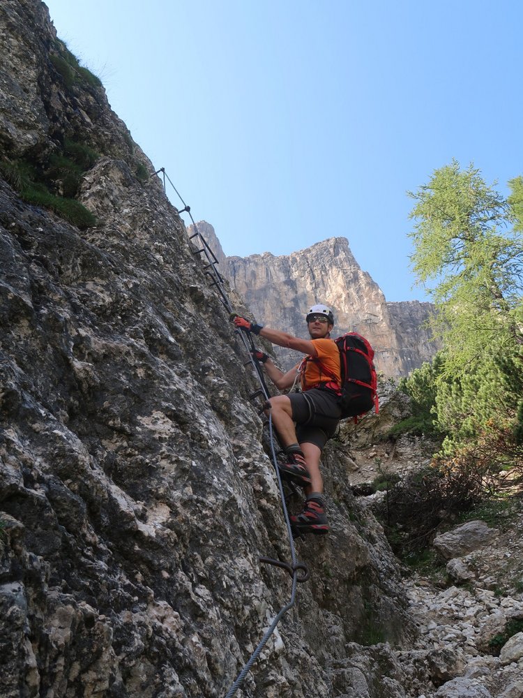 Die oft nasse, 50 m hohe Einstiegswand (Schwierigkeit bis B) wird mittels Klammern überwunden und kann weit rechts (beim Parkplatz dir. hinauf) umgangen werden. Es folgt eine lange Linkquerung, dann rechts zum Einstieg, rechts des Unteren Pisciadù Wasserfalls. Über eine gestufte Rampe (max. B) nach links zu einem schönen Rastplatz zwischen den Pisciadù Fällen. In einer Rechtsschleife wird der Obere Wasserfall überwunden, wobei die Schwierigkeiten ab der Mitte auf B/C an Klammern ansteigen. Bei einem ausgesetzten Eck kommt man wieder an den Wasserfall, und verlässt diesen leicht (A/B) über gestuften Fels zu einem weiteren Rastpunkt. Dort geht der Notausstieg (Tafel) links ab. Dieser mündet in einen normalen Wanderpfad. Es folgt eine Wand ohne Stifte (B), eine kurze Rechtsschleife und eine leicht überhängende Wand mit Trittstiften (C). Danach rechts zu einer Leiter (B), diese führt auf einen Absatz (Ende der Hauptschwierigkeiten). Weiter hinauf zum Grat (bis B) und zur Hängebrücke queren. Nach der Brücke noch wenige leichte (A) Meter bis zum Ausstieg und in gut 10 Minuten zur bereits sichtbaren Pisciadù Hütte auf 2585 m.