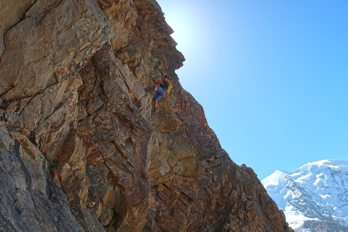 Siehe Topo. Über den Vorbau (A) hinauf zum Westgrat mit einer Leiter (B), stets dem gestuften Westgrat (immer A und B, einmal kurz B/C) bis zu einem markanten Block folgen. Dort beginnt das Cambrena-Band, dem man leicht (A) nach rechts zu Abzweigung von Nr. II folgt (Tafel). Bei der Tafel über Platten und Schotter (kurz B/C, meist leichter) absteigen und um die Kante herum zur Tyrolienne, die zur Südwestwand führt. Dort beginnt der lange Quergang (Stellen C und leichter) zur Bizeps-Wall. Der Steig führt über Überhänge (kurz D/E, größtenteils D) hinauf zu einem Absatz. Dann geht es zuerst steil (C und D) weiter, es folgt eine Passage ohne Trittstifte (C/D) vor einer plattigen Kante (B und C) aufwärts, bis die Tour links von einer Rinne an einer Kante zum Gipfel ausläuft (bis max. B).