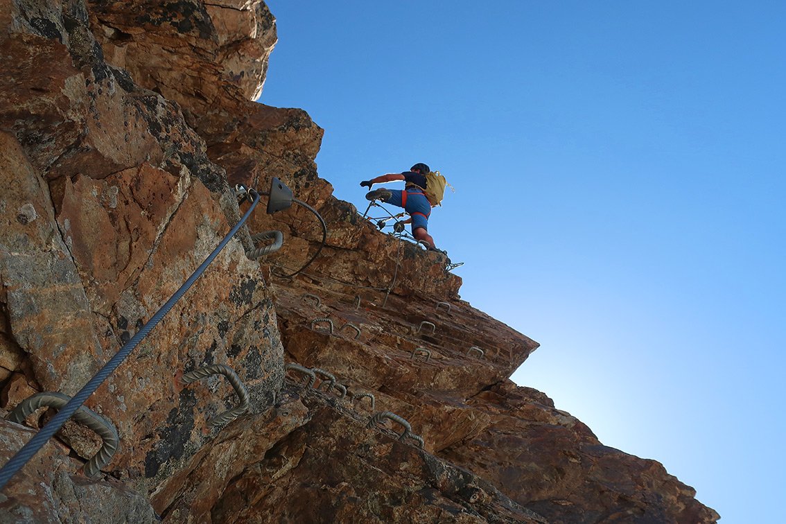 Piz Trovat II ist anstrengend und kräfteraubend, man kann auch nach der Tyrolienne NICHT mehr zurück! Die Mindestgröße des Begehers sollte 1,60 Meter betragen, da die Griffe sonst zu weit auseinander liegen.