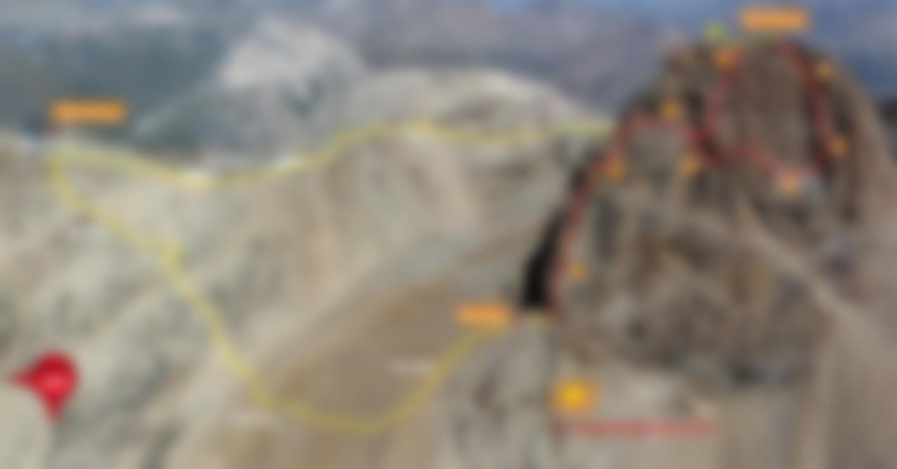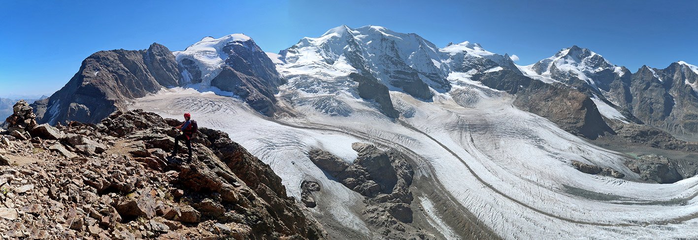 Auf dem Nordostgrat über viel Schotter (Steinmänner und weiß/blau/weiße Markierungen) hinunter in eine Scharte auf 3008 m. Dann eben an einem Lift vorbei nach Norden zur Bergstation der Diavolezza.