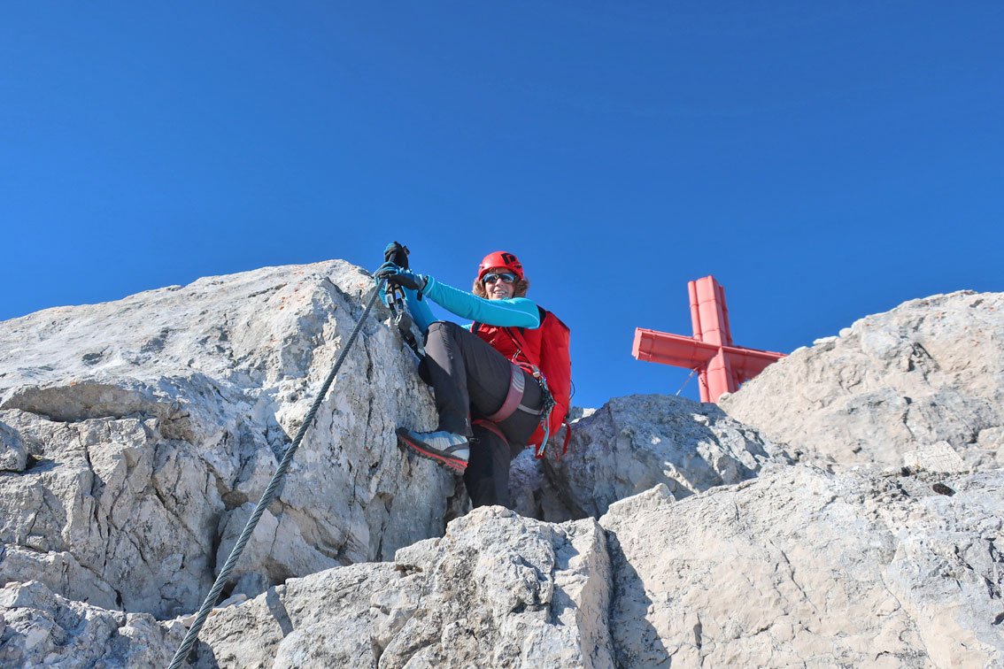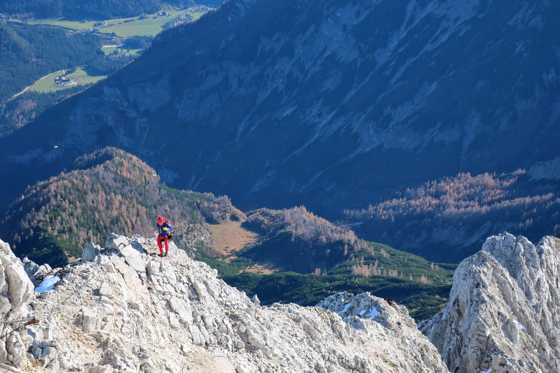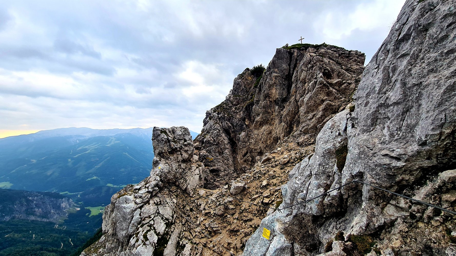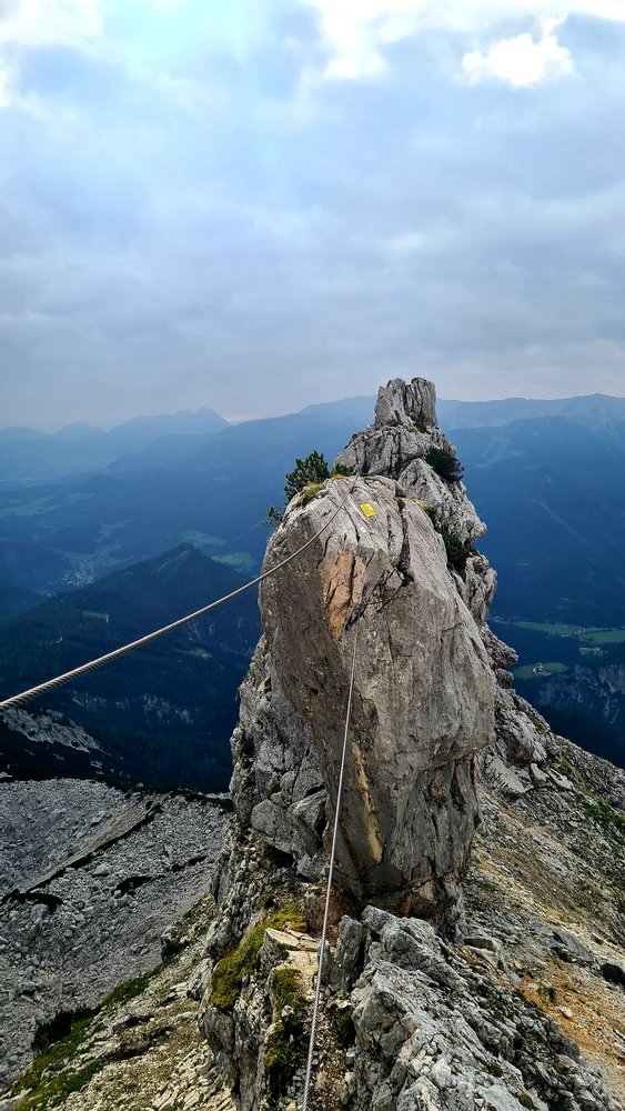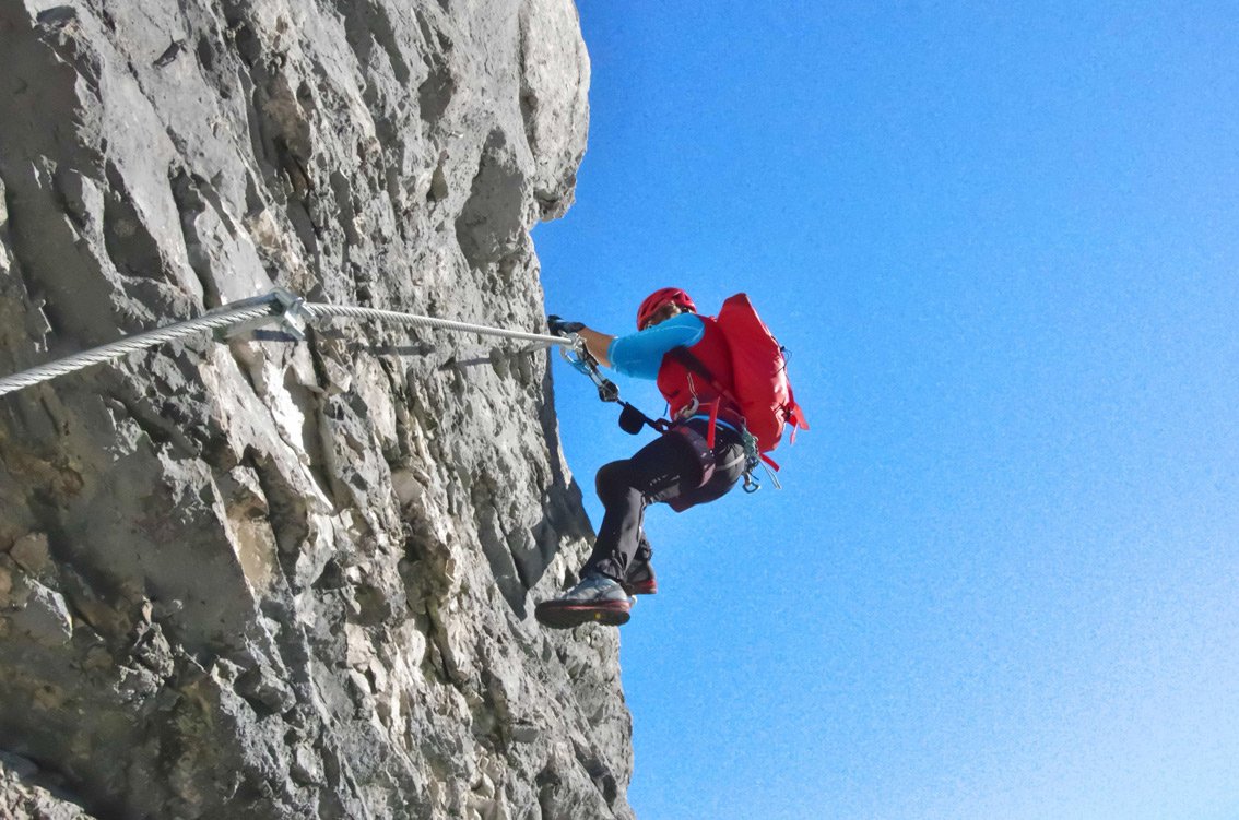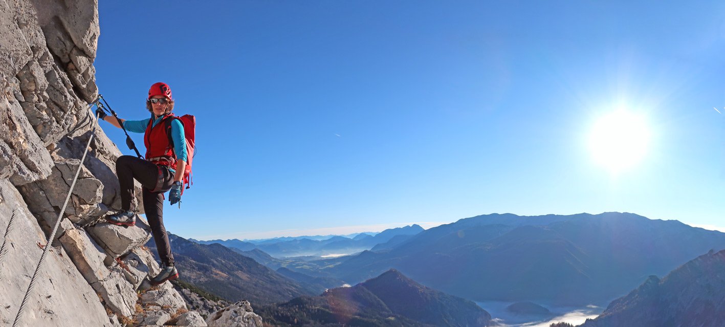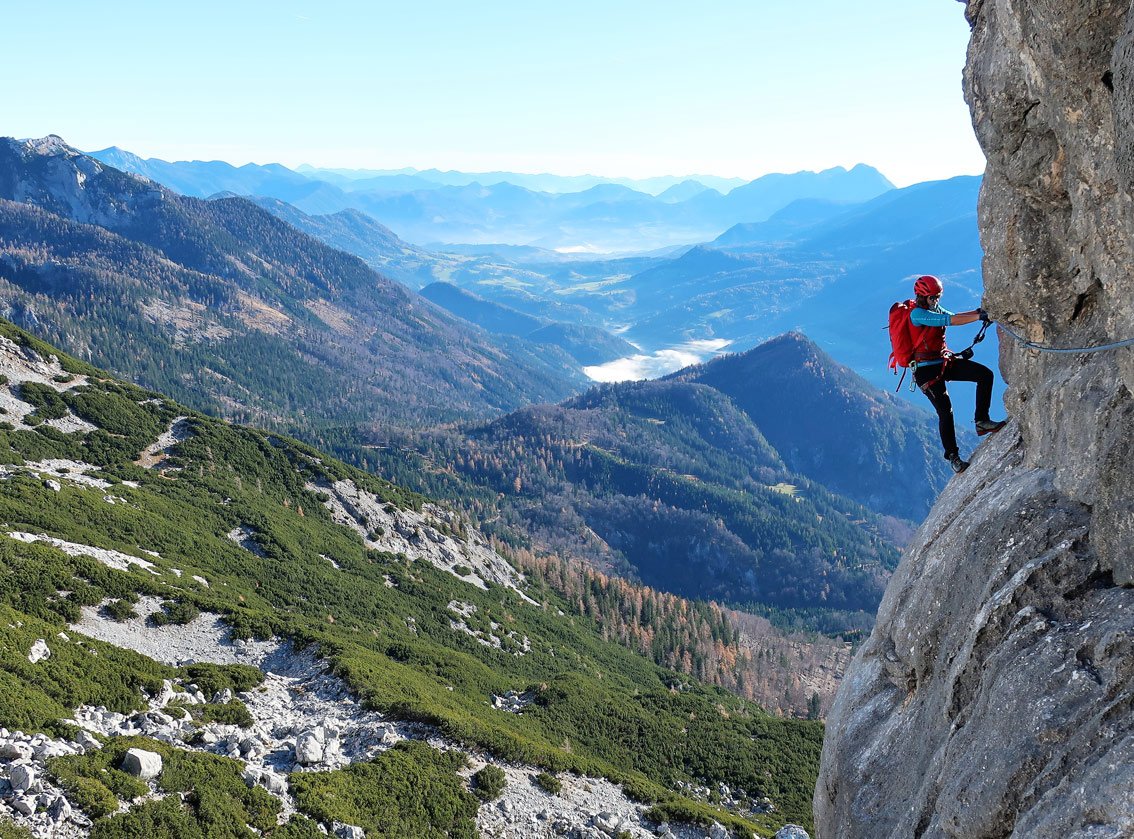 Wenn man 900 Hm am durchgehenden, 2130 m langen (!!!) Stahlseil hängt, sich dabei immer im oberen und mittleren Schwierigkeitsbereich bewegt, dann ist das Durchhaltevermögen fast bis zum Ende ausgereizt. Mit der Errichtung der langen und schwierigen Verbindung zwischen dem SO-Sporn-Klettersteig und Bert-Rinesch-Klettersteig wurde ein tolles „Gesamtwerk“ geschaffen, welches zu den Mega-Klettersteigen in Österreich gehört. Die lange Ferrata ist ein Mix aus Actionsteig (unten gibt es Seilbrücken, ausgesetzte Traversen und Höhlen) und langem alpinen Klettersteig mit Gipfelgrat. Das Stahlseil endet direkt beim mächtigen roten Gipfelkreuz des Gr. Priel, der höchsten Erhebung des Toten Gebirges - perfekter könnte man eine Klettersteigtour nicht abschließen!