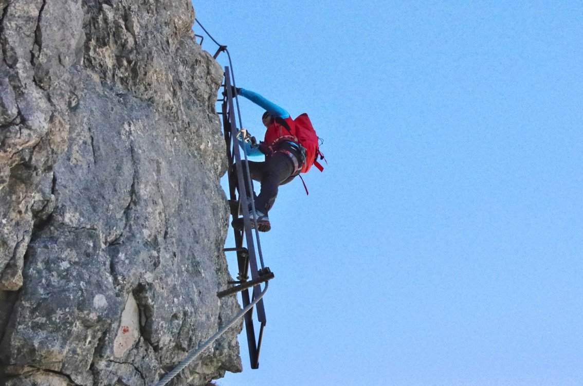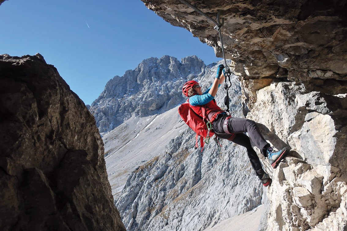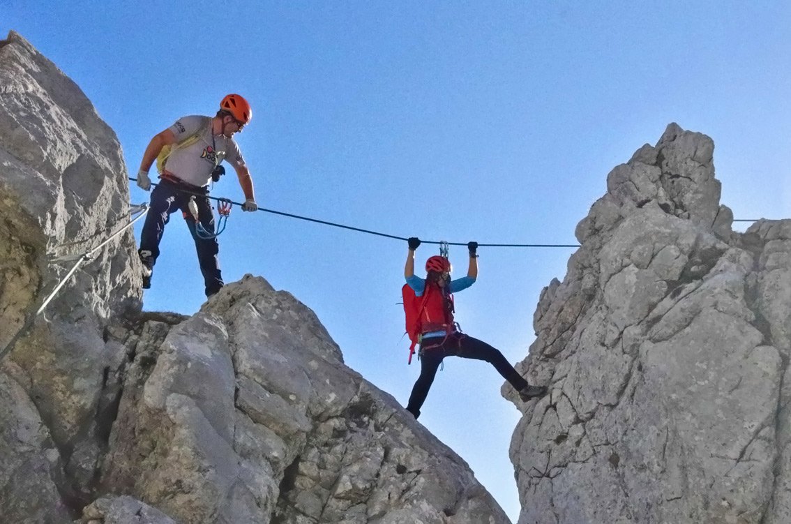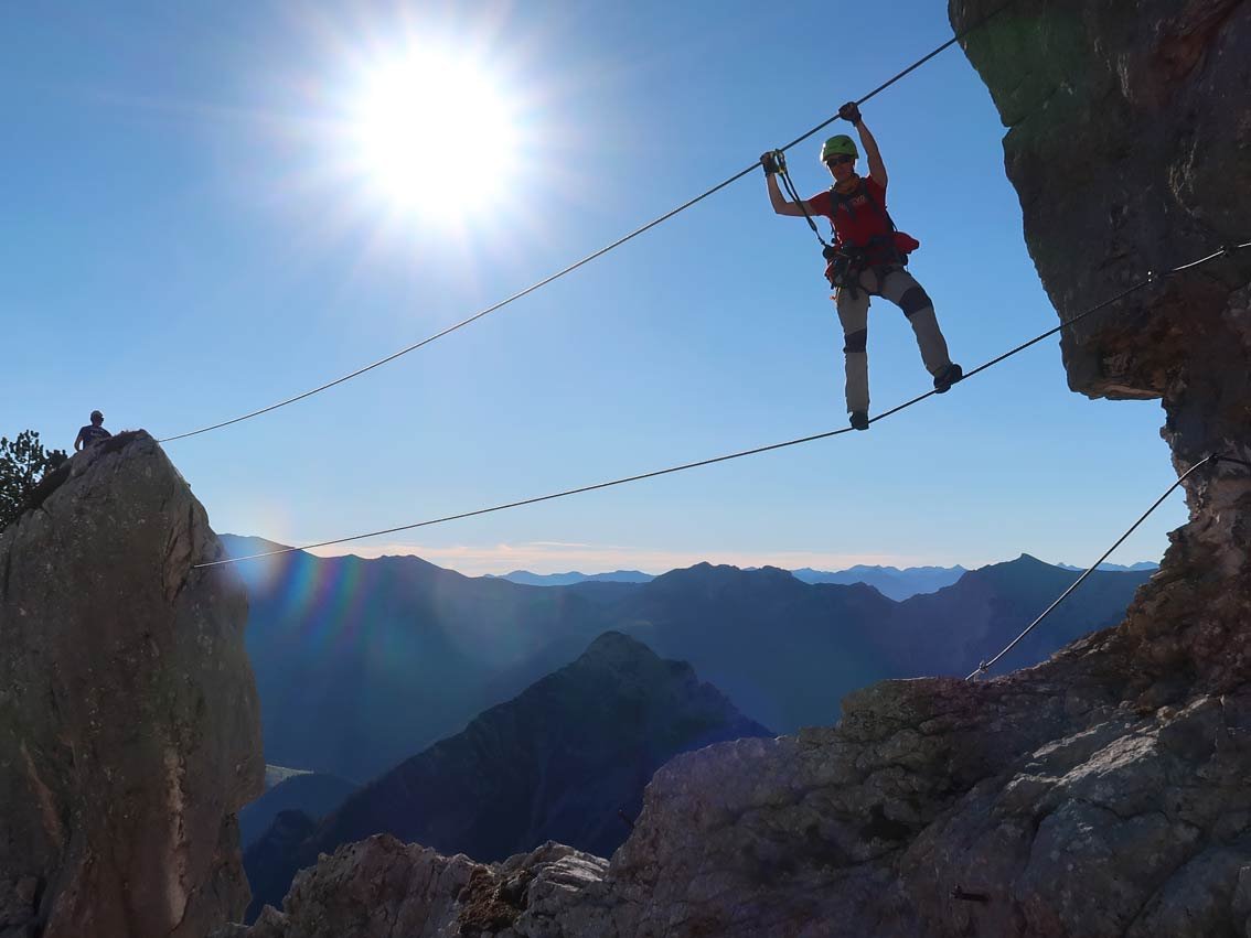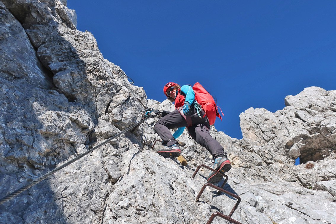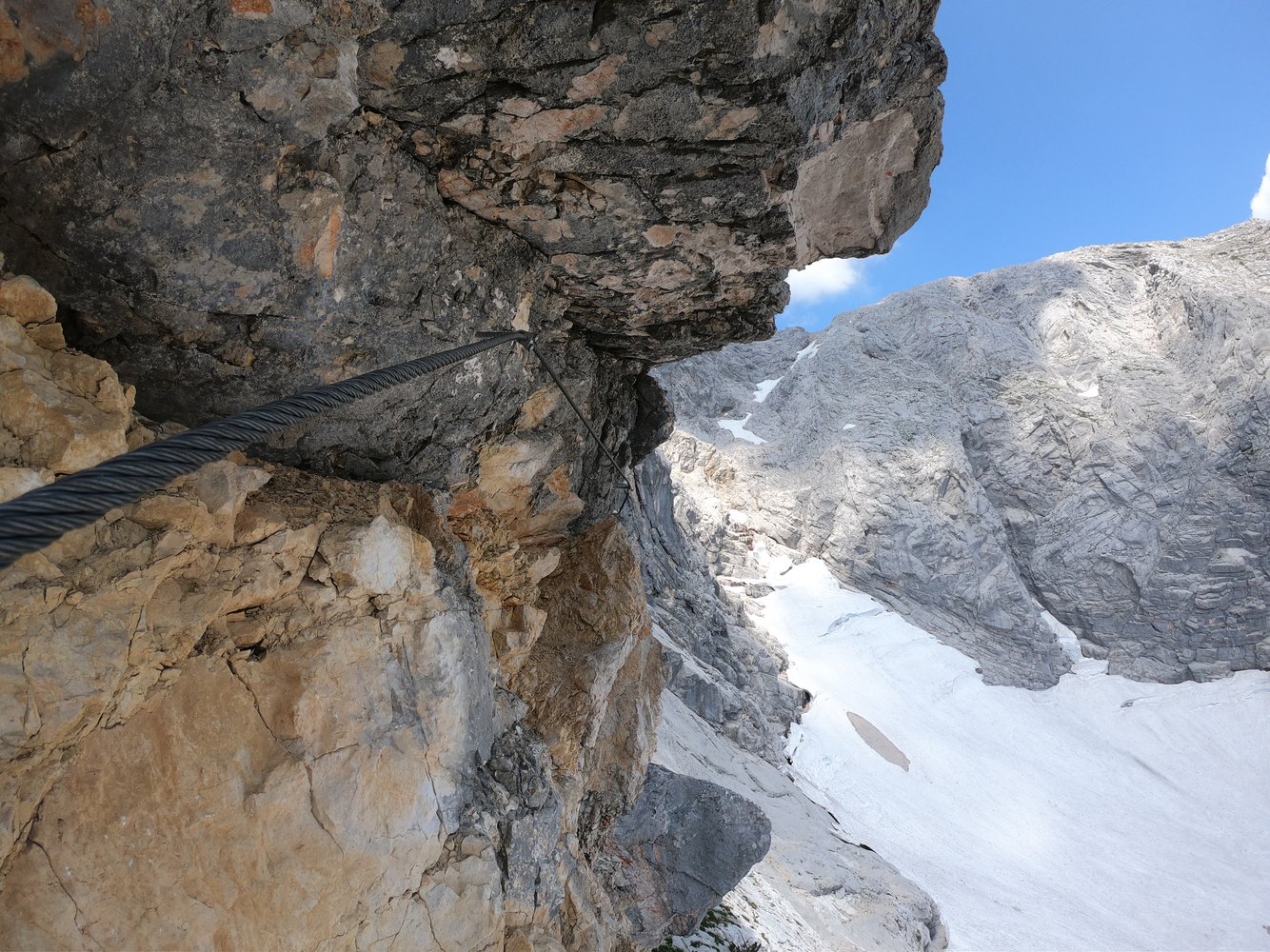 Wenn man 900 Hm am durchgehenden, 2130 m langen (!!!) Stahlseil hängt, sich dabei immer im oberen und mittleren Schwierigkeitsbereich bewegt, dann ist das Durchhaltevermögen fast bis zum Ende ausgereizt. Mit der Errichtung der langen und schwierigen Verbindung zwischen dem SO-Sporn-Klettersteig und Bert-Rinesch-Klettersteig wurde ein tolles „Gesamtwerk“ geschaffen, welches zu den Mega-Klettersteigen in Österreich gehört. Die lange Ferrata ist ein Mix aus Actionsteig (unten gibt es Seilbrücken, ausgesetzte Traversen und Höhlen) und langem alpinen Klettersteig mit Gipfelgrat. Das Stahlseil endet direkt beim mächtigen roten Gipfelkreuz des Gr. Priel, der höchsten Erhebung des Toten Gebirges - perfekter könnte man eine Klettersteigtour nicht abschließen!