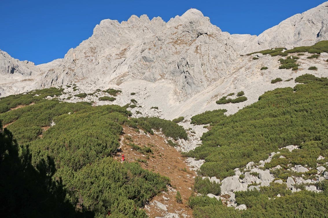 Auf dem markierten Normalweg entlang des Westgrates zur Brotfallscharte. Dort ins Kühkar und zum Prielschutzhaus (1100 Hm). Achtung, unterhalb der Brotfallscharte (Unterstandshöhle) teilweise versicherte Steilstücke (A/B) und steile Schneereste bis in den Frühsommer!