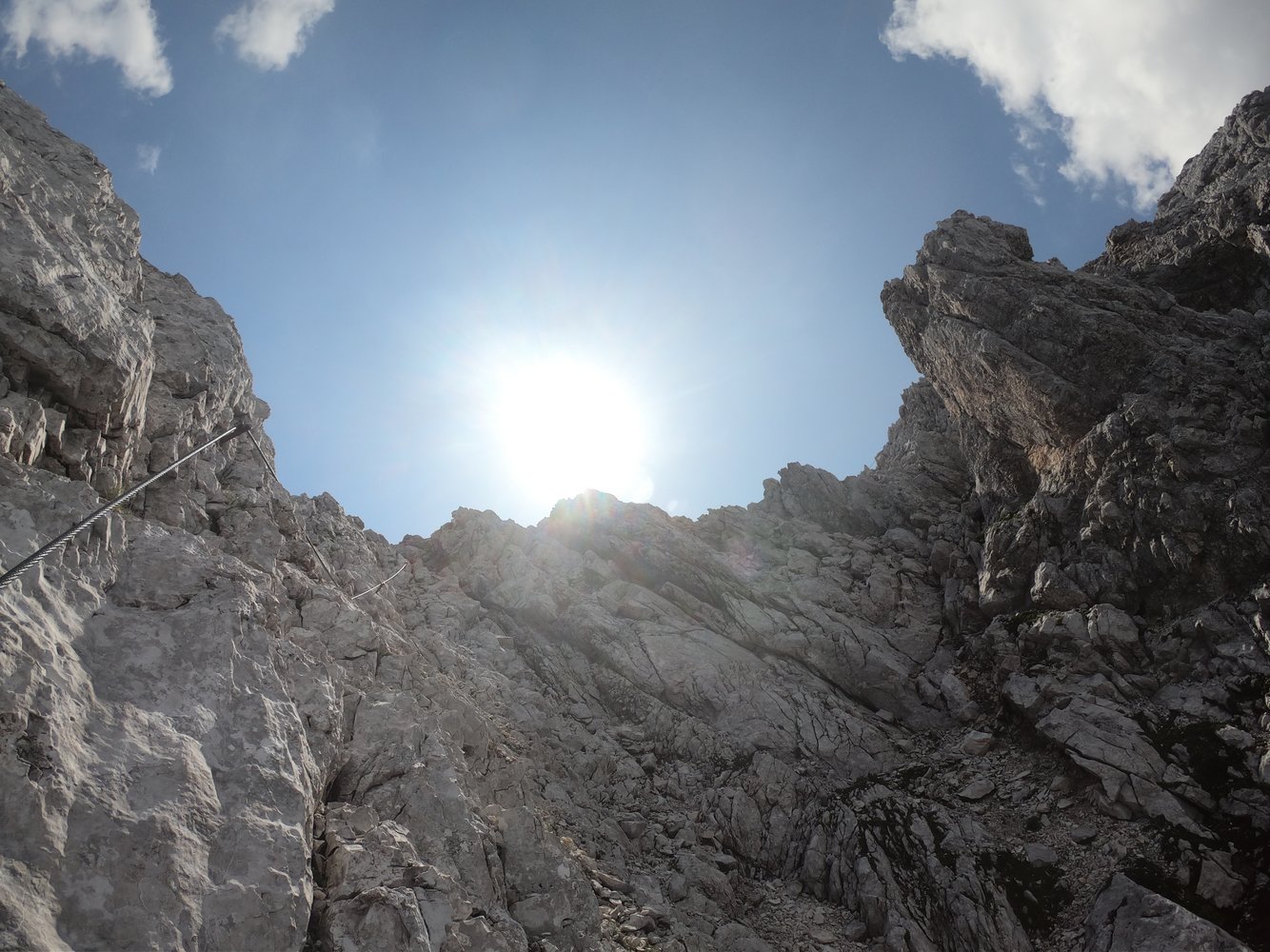 Extrem langer und ausgesetzter Klettersteig, der viel Ausdauer und alpine Erfahrung erfordert. Man kann den Steig auch in zwei Etappen klettern - einmal bis zum Südostsporn und am zweiten Tag von dort weiter zum Gipfel (dazwischen absteigen und im Prielschutzhaus nächtigen). Nach Regenfällen lange nass; bis zum Frühsommer gefährliche Schneereste. Rückzug ist in der oberen Wandhälfte problematisch; genau auf die Wetterverhältnisse achten!