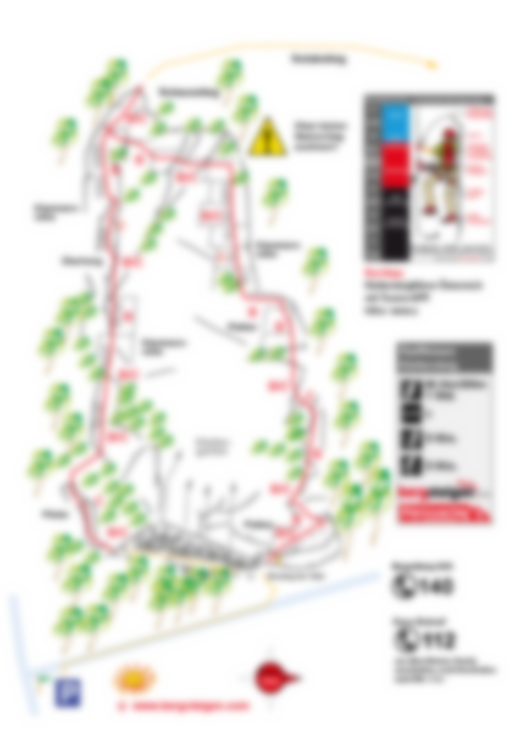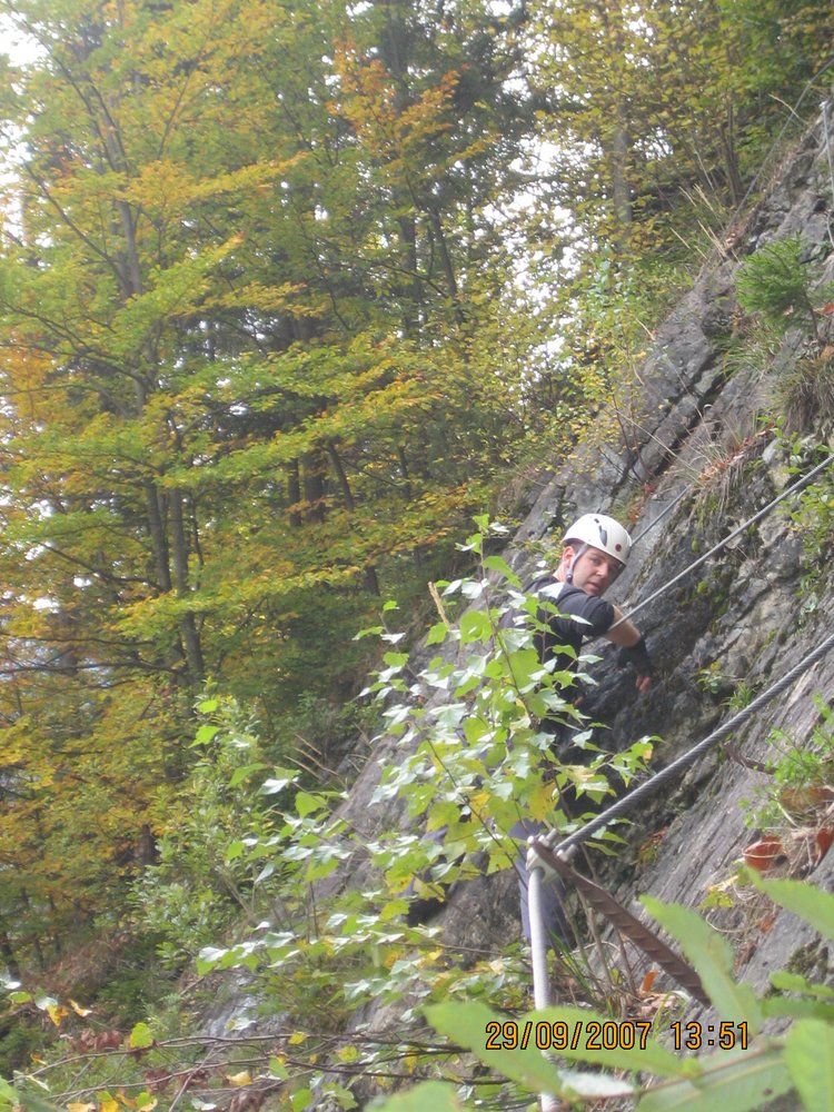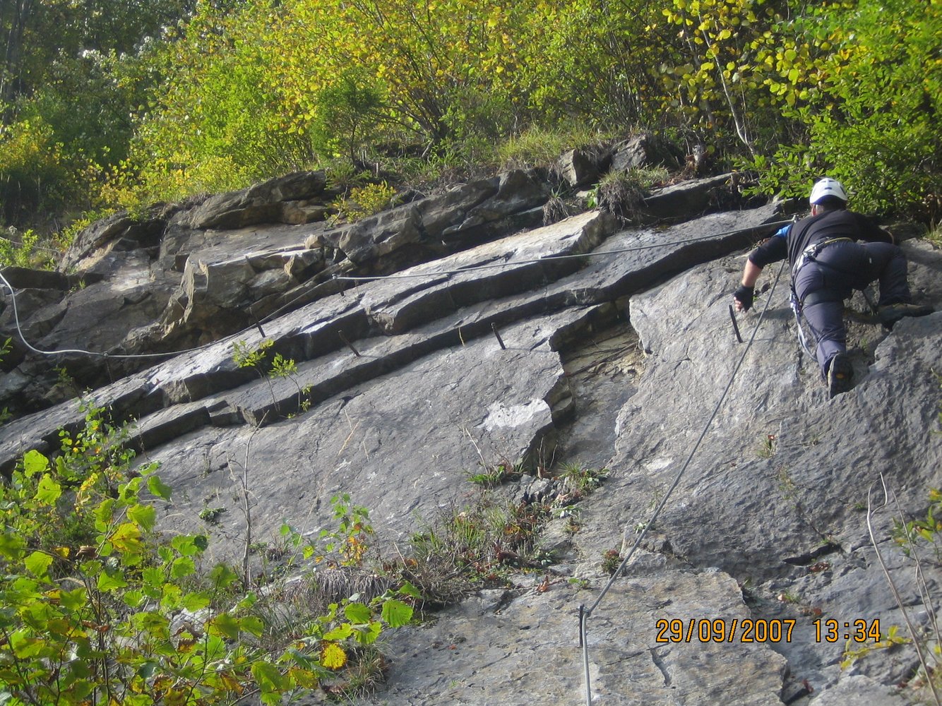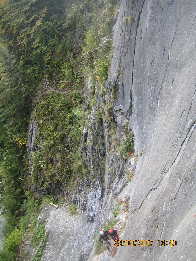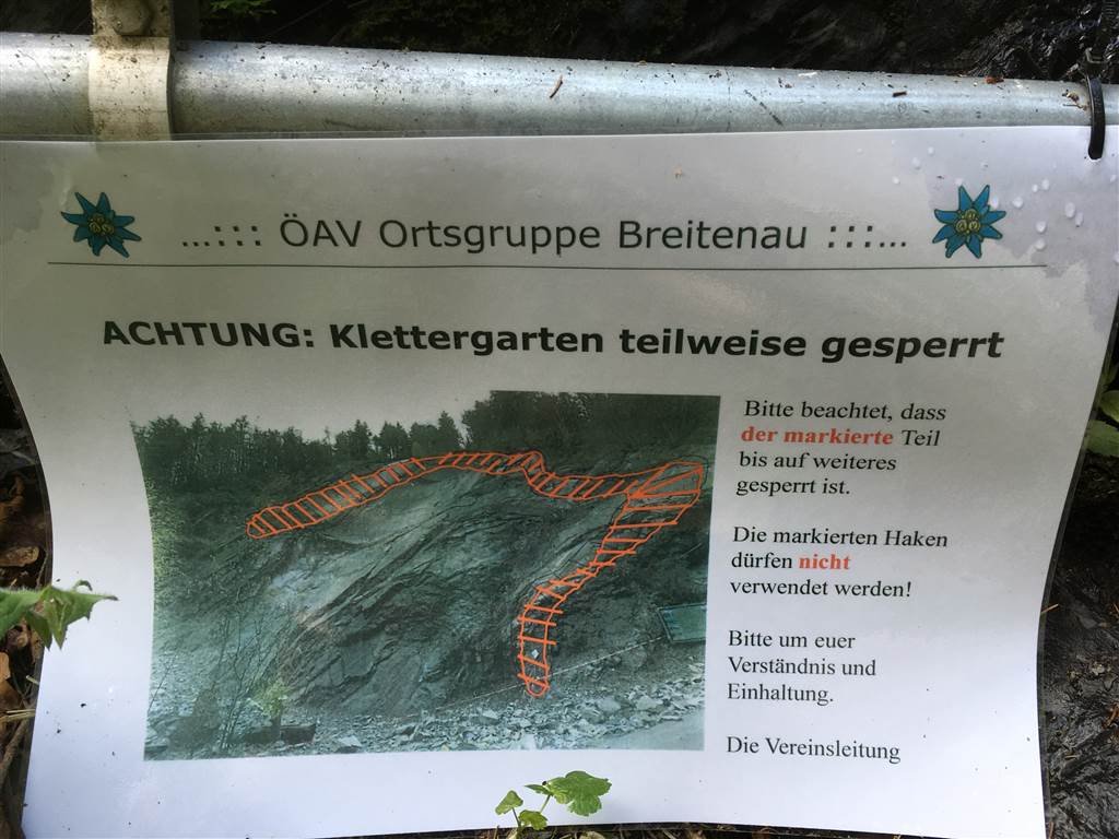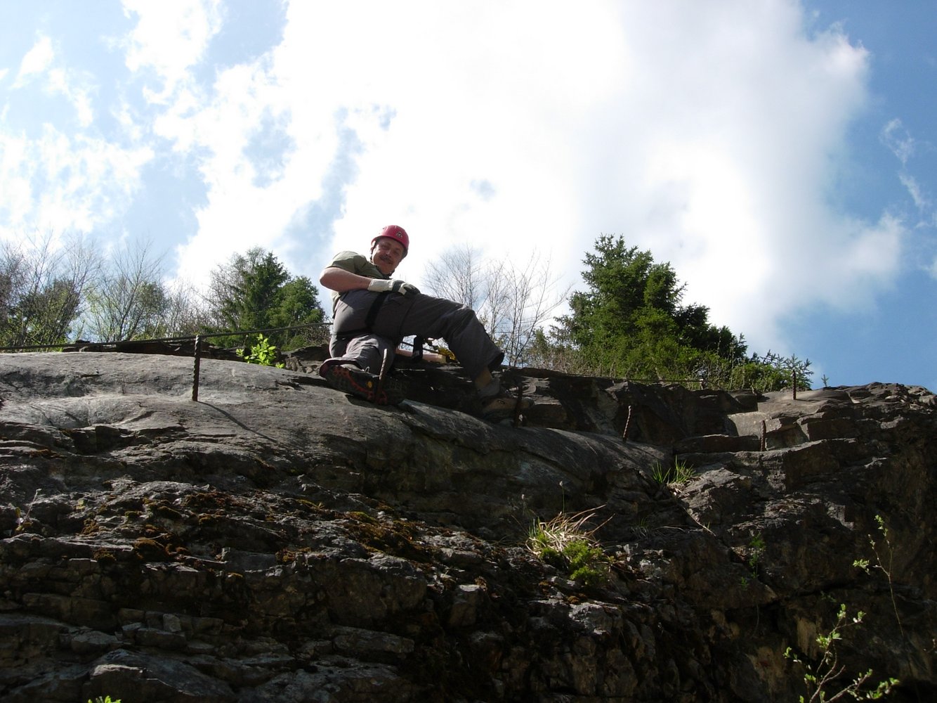 Wenn sich im darunter liegenden Klettergarten Leute befinden, bitte um besondere Vorsicht, da auf den Bändern oft lose Steine liegen.