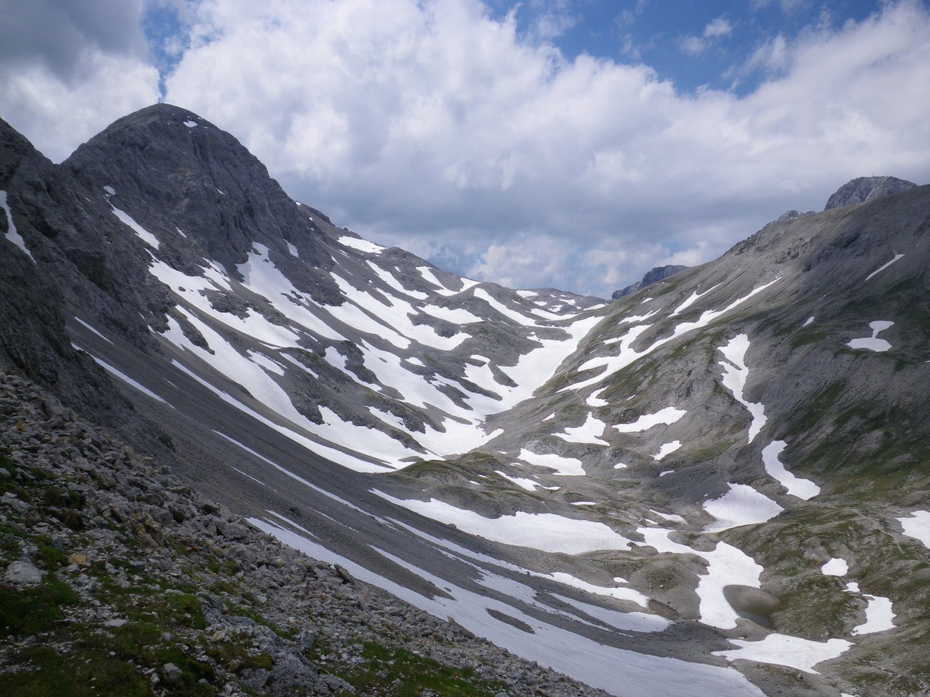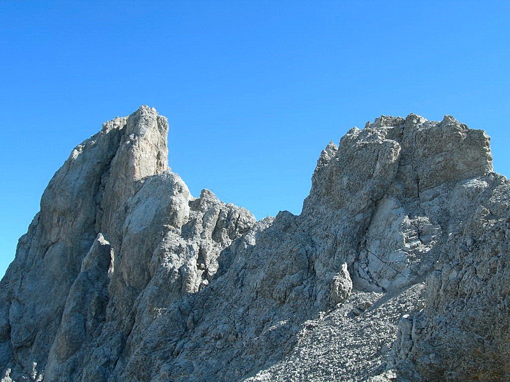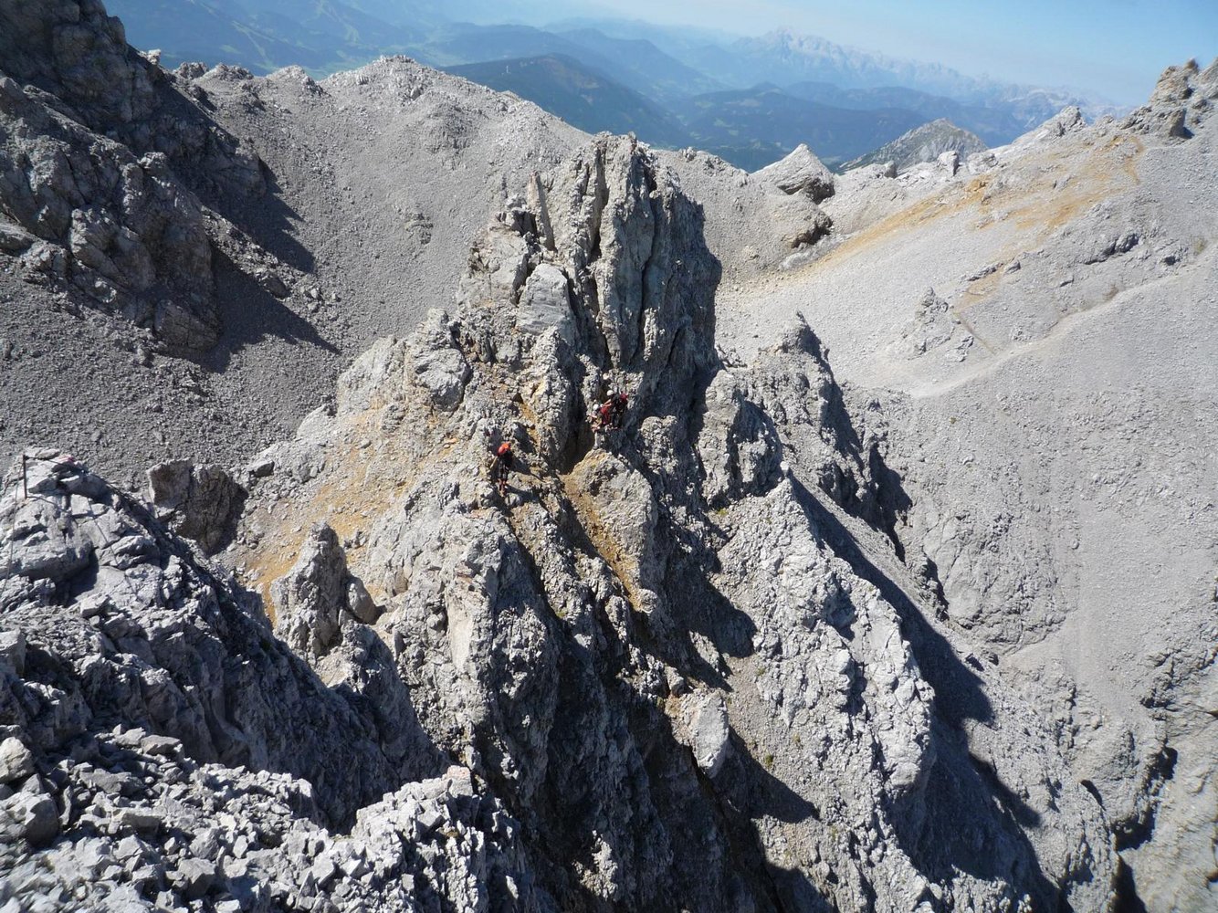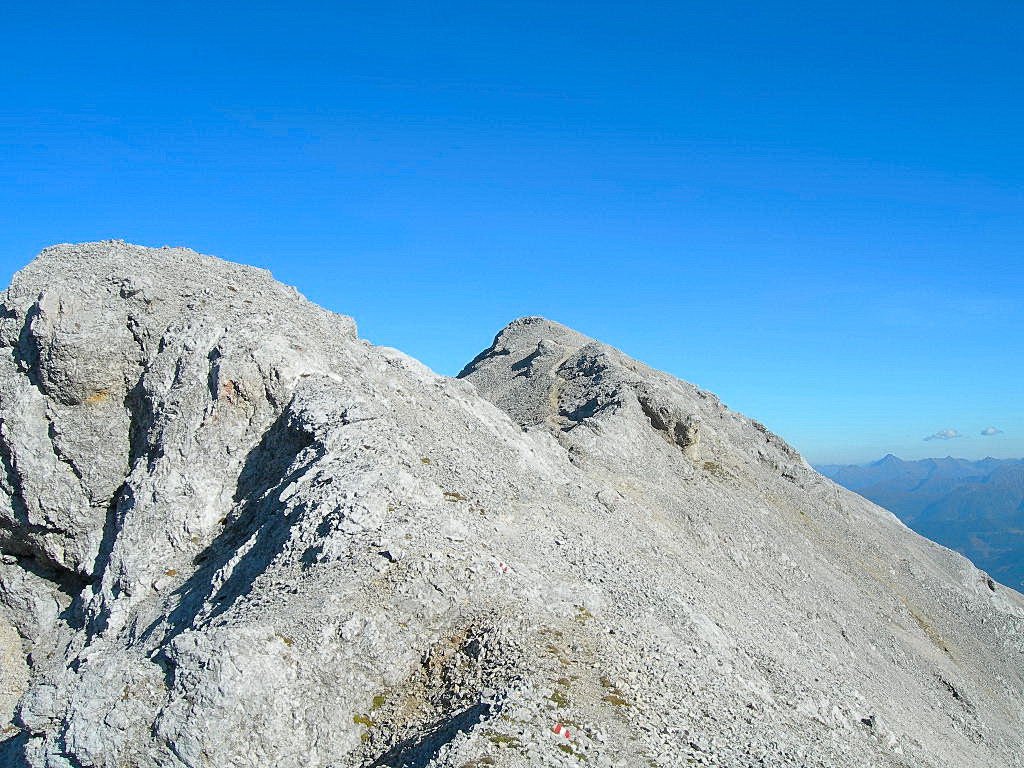 Über Geröllkante zur Niederen Gamsfeldspitze aufsteigen, nun an den Versicherungen entlang, auf- und absteigend und nach einer Scharte steil zur Hohen Gamsfeldspitze aufsteigen. Auf der anderen Seite steil hinunter, der nächste kl. Gipfel wird südlich umgangen, und über eine rampenförmige Rinne wieder auf den Kamm und weiter zum Gipfel der Scheichenspitze. Nun absteigend (meist Geröll, aber auch teilweise versichert) bis zum Hohen Rams, von diesem über Versicherungen und Schutt zur Gruberscharte absteigen.