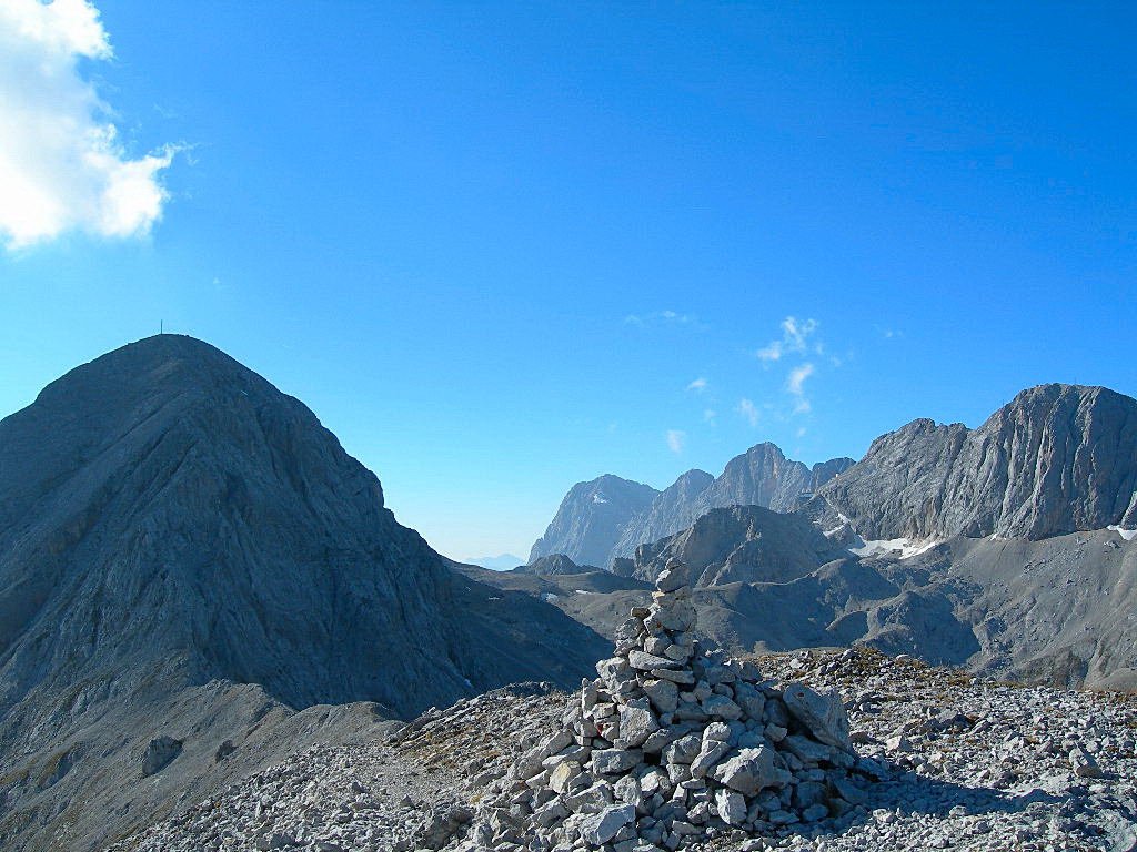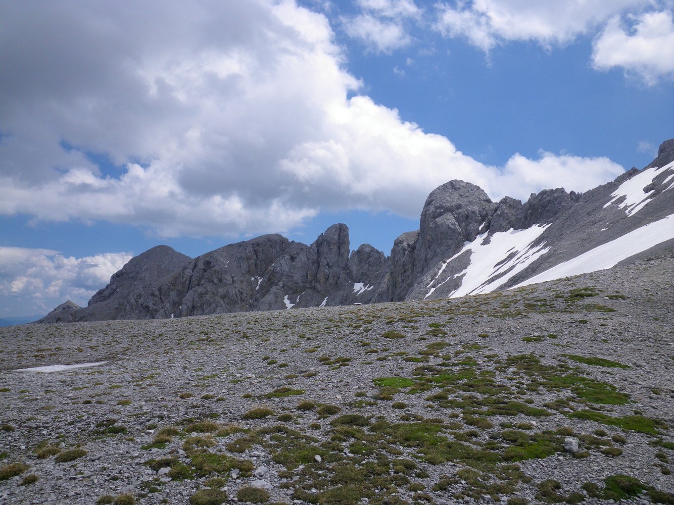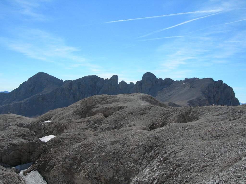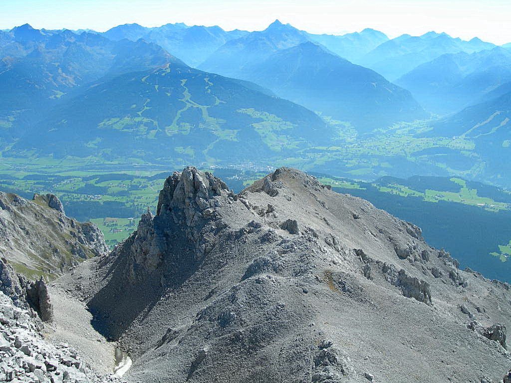 Über Geröllkante zur Niederen Gamsfeldspitze aufsteigen, nun an den Versicherungen entlang, auf- und absteigend und nach einer Scharte steil zur Hohen Gamsfeldspitze aufsteigen. Auf der anderen Seite steil hinunter, der nächste kl. Gipfel wird südlich umgangen, und über eine rampenförmige Rinne wieder auf den Kamm und weiter zum Gipfel der Scheichenspitze. Nun absteigend (meist Geröll, aber auch teilweise versichert) bis zum Hohen Rams, von diesem über Versicherungen und Schutt zur Gruberscharte absteigen.
