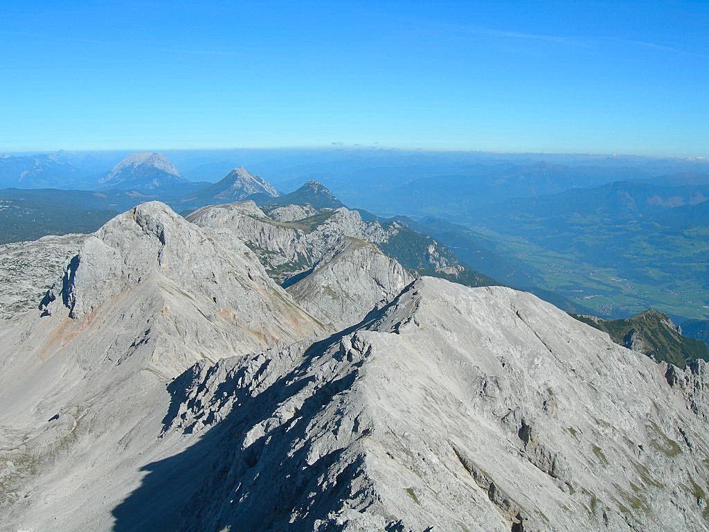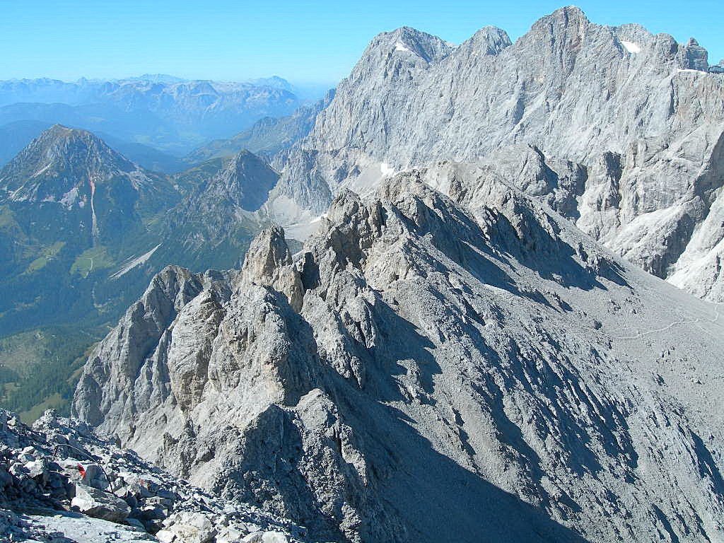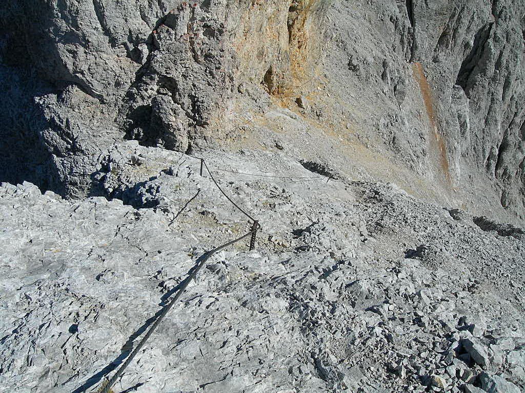 Der Klassiker schlechthin im Dachsteingebiet wird auch gerne als Eingehtour für den Hohen Dachstein vom Guttenberghaus aus gemacht (dann Nächtigung auf der Seethalerhütte). Sonst von der Edelgrieshöhe aus beginnend, zieht dieser eindrucksvolle Eisenweg über Gipfel und Türme bis zur Gruberscharte hinüber. Landschaftlich einzigartiges Erlebnis, aber auch an sportlicher Betätigung wird einiges geboten (somit ist dieser Steig nicht zu unterschätzen, für nicht schwindelfreie Geher überhaupt nicht zu empfehlen...). Wer von den doch recht zahlreichen ausgesetzten Stellen noch nicht genug hat, kann wenn noch Zeit ist, den Jubiläumsklettersteig (C/D) auf dem Weg zum Guttenberghaus "mitnehmen". Ein anstrengender Tag ist einem mit dieser Kombination sicher!.