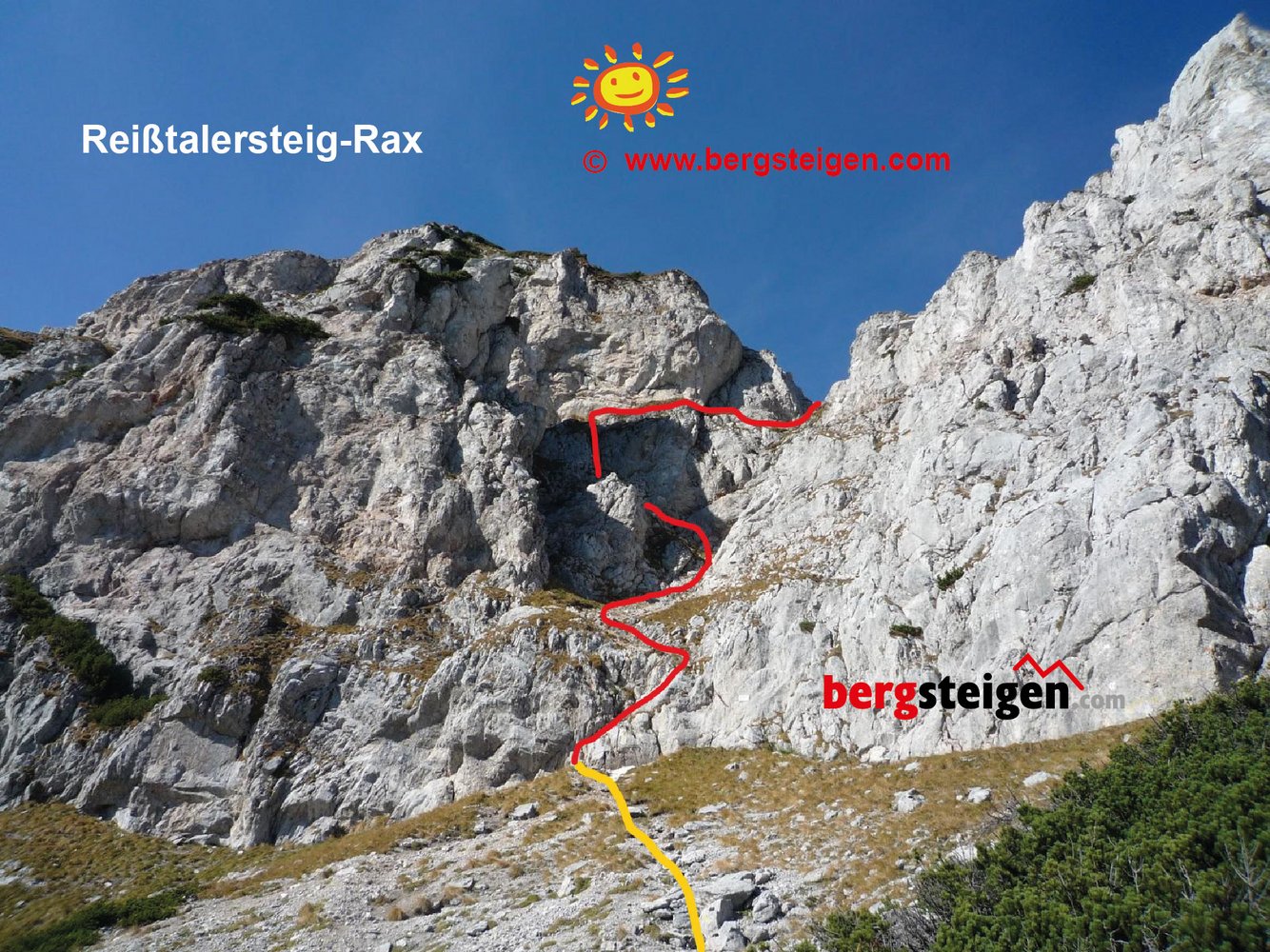 Vom Preiner Gscheid (1070 m) über gelb markierten Weg zur Reisstalerhütte (Privat), hinter dieser weiter (gelb) bis zum Wandfuß. Einstieg bei einem großem gelben Pfeil.