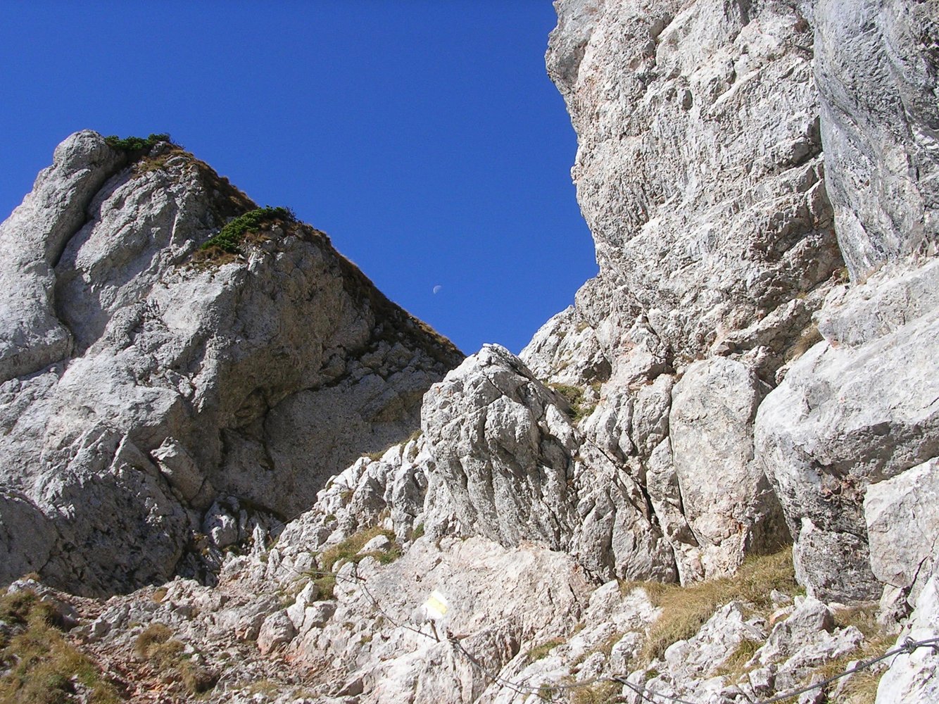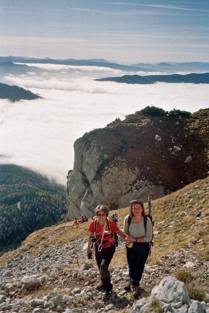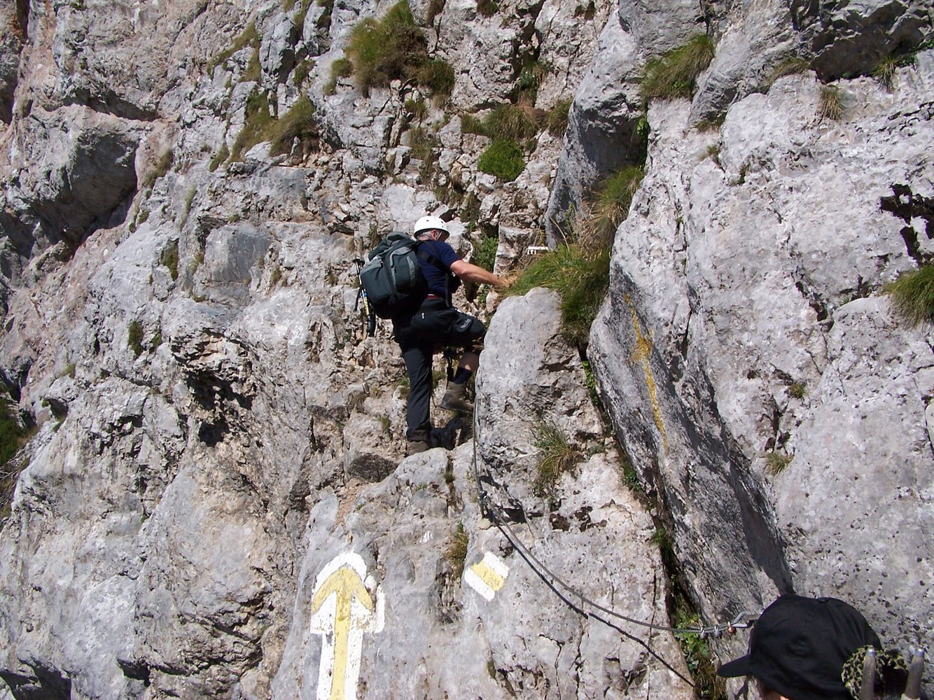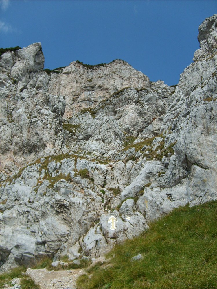 Bei großem gelben Pfeil über die Einstiegsplatte hinweg und in einer Schleife zur Eisenleiter. Danach Gehgelände, leicht rechts zu markantem Block mit Kreuz (Steigbuch), um diesen links herum den Steigspuren zum Raxplateau folgen. Es kann in der Höhe des Steigbuches auch zum Gretchensteig bzw. Karl-Ludwig-Haus gequert werden. Auf dem Raxplateau angelangt sind es noch ca. 20 bis 30 min zur Heukuppe 2007 m.