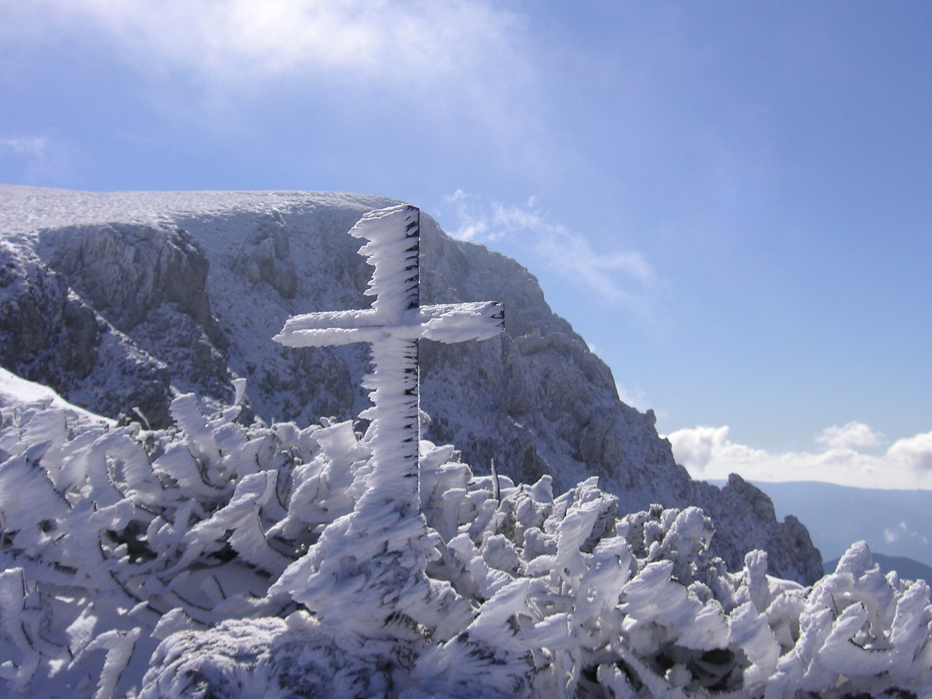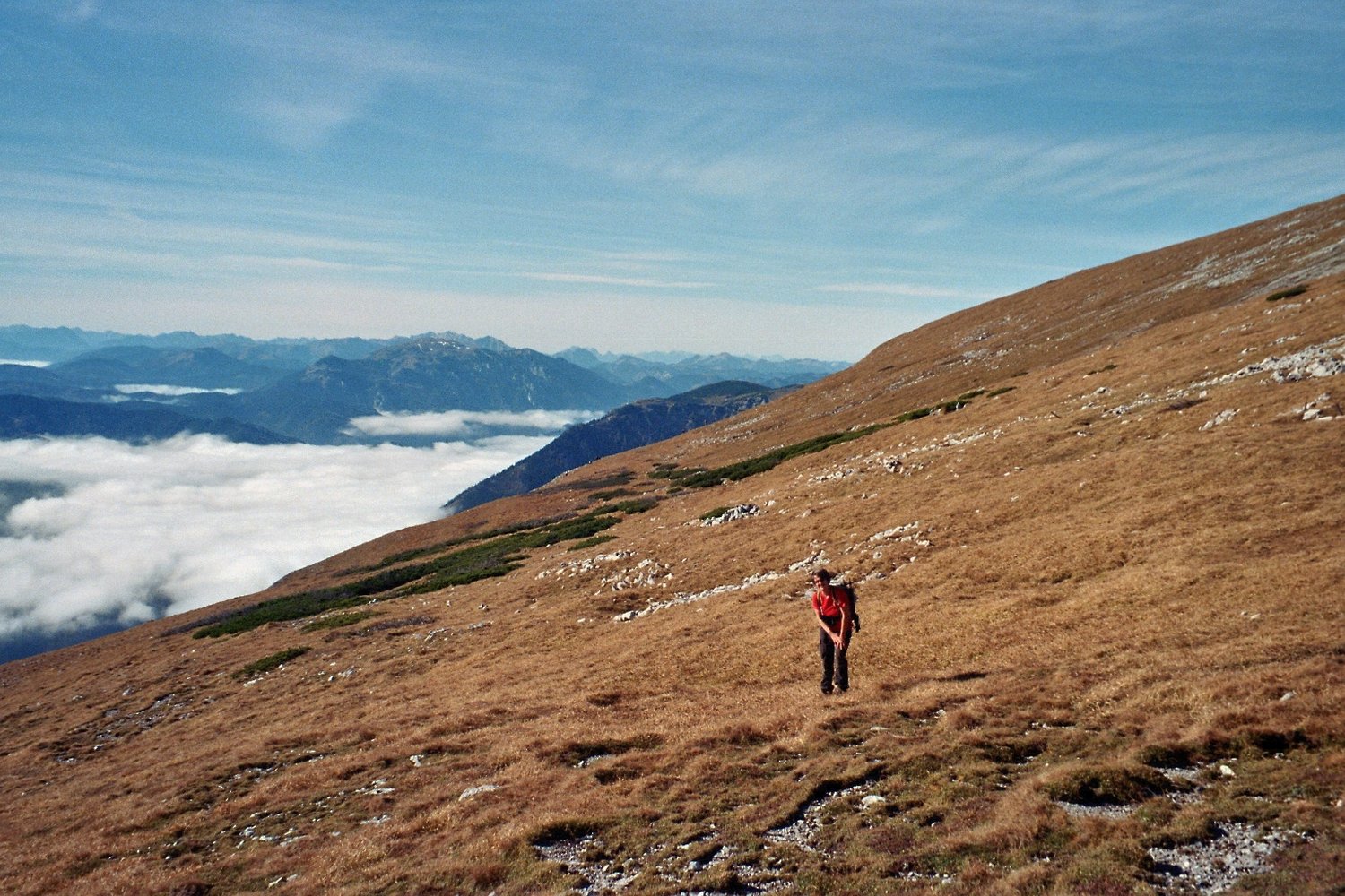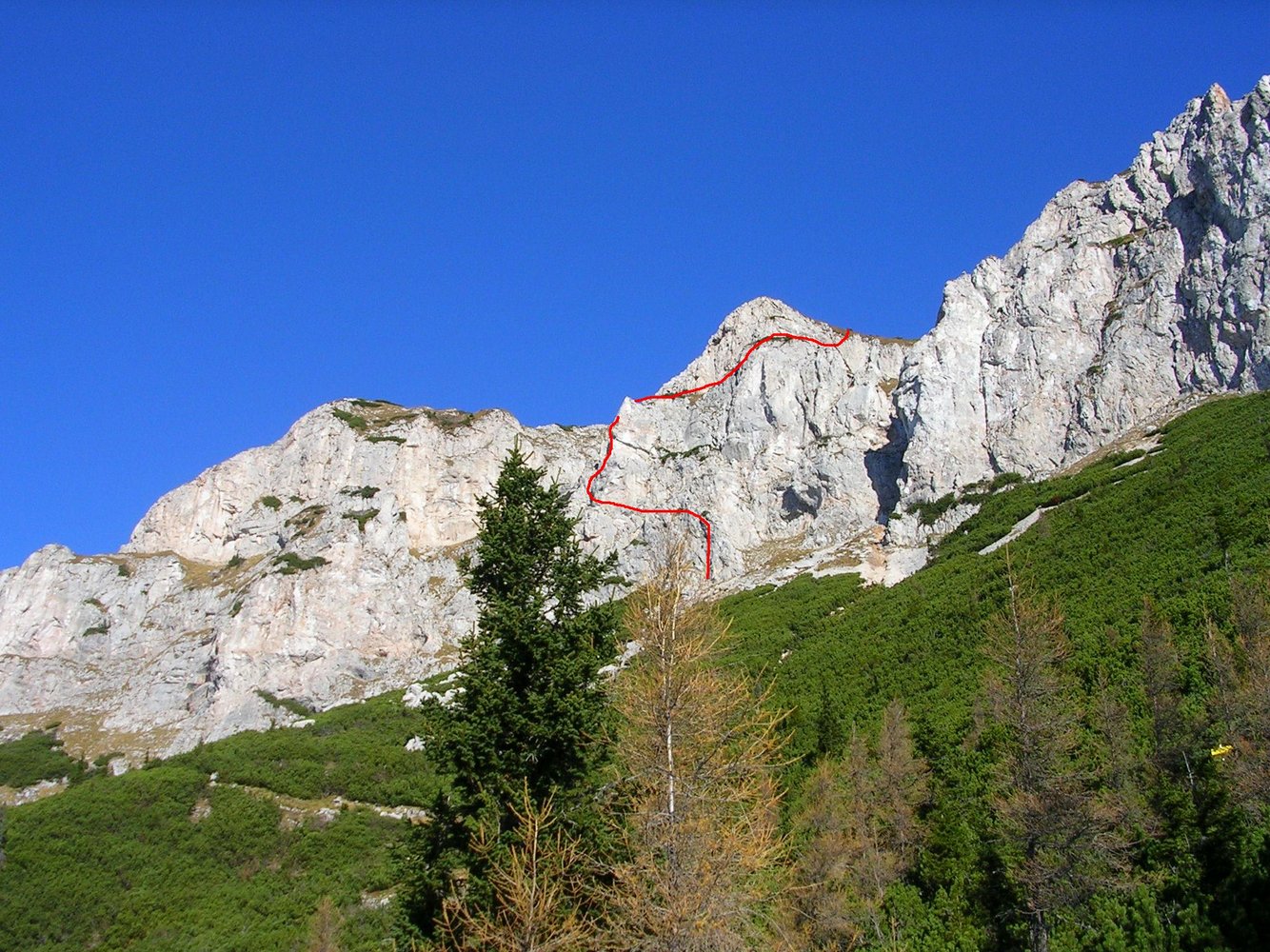 Bei großem gelben Pfeil über die Einstiegsplatte hinweg und in einer Schleife zur Eisenleiter. Danach Gehgelände, leicht rechts zu markantem Block mit Kreuz (Steigbuch), um diesen links herum den Steigspuren zum Raxplateau folgen. Es kann in der Höhe des Steigbuches auch zum Gretchensteig bzw. Karl-Ludwig-Haus gequert werden. Auf dem Raxplateau angelangt sind es noch ca. 20 bis 30 min zur Heukuppe 2007 m.