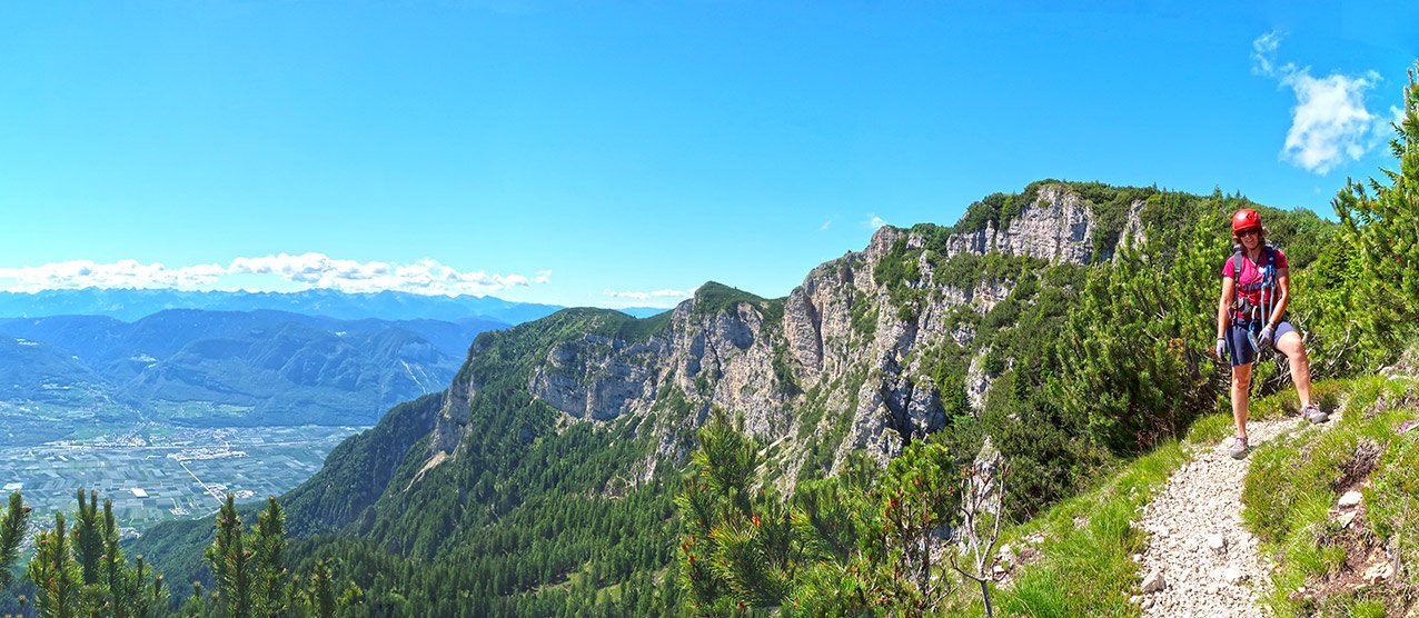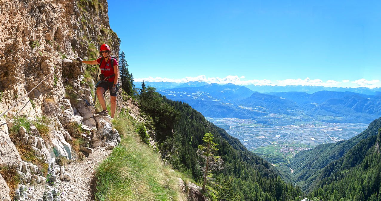 Der Monte Roen steht genau zwischen den Dolomiten und dem Brenta Gebirge, hoch über dem Etschtal. Der plateauartige Gipfel bietet eine der eindrucksvollsten Aussichten in Südtirol! An der Ostseite führt eine nicht allzu schwere Ferrata hinauf auf den Gipfelkamm, die man gut im Zuge einer Wanderung oder Biketour klettern kann.