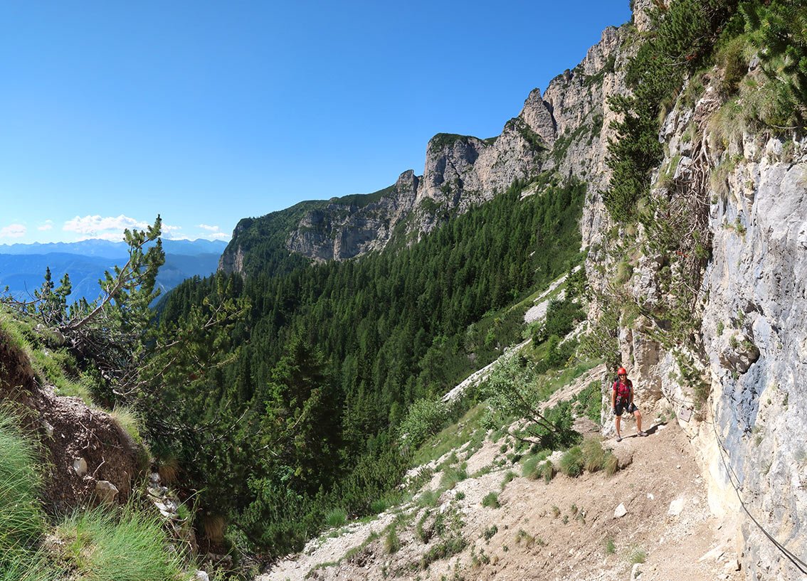 Man kann diese leichte Ferrata auch gut mit einer MTB-Tour kombinieren, das Fahrrad lässt man am besten bei der Malga Roen stehen.