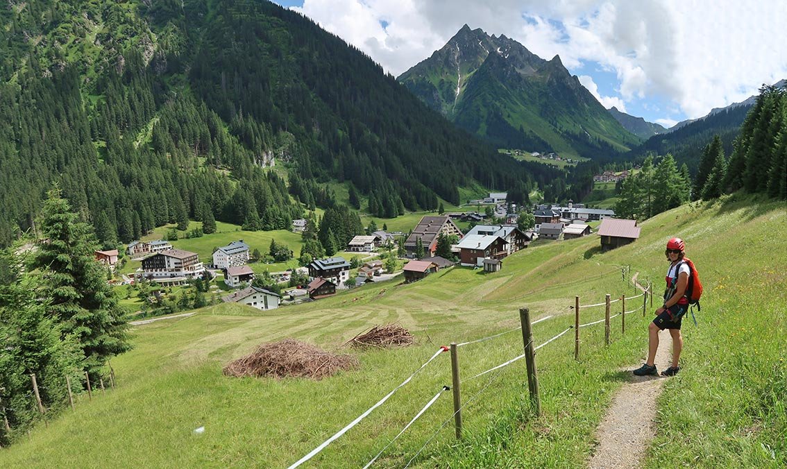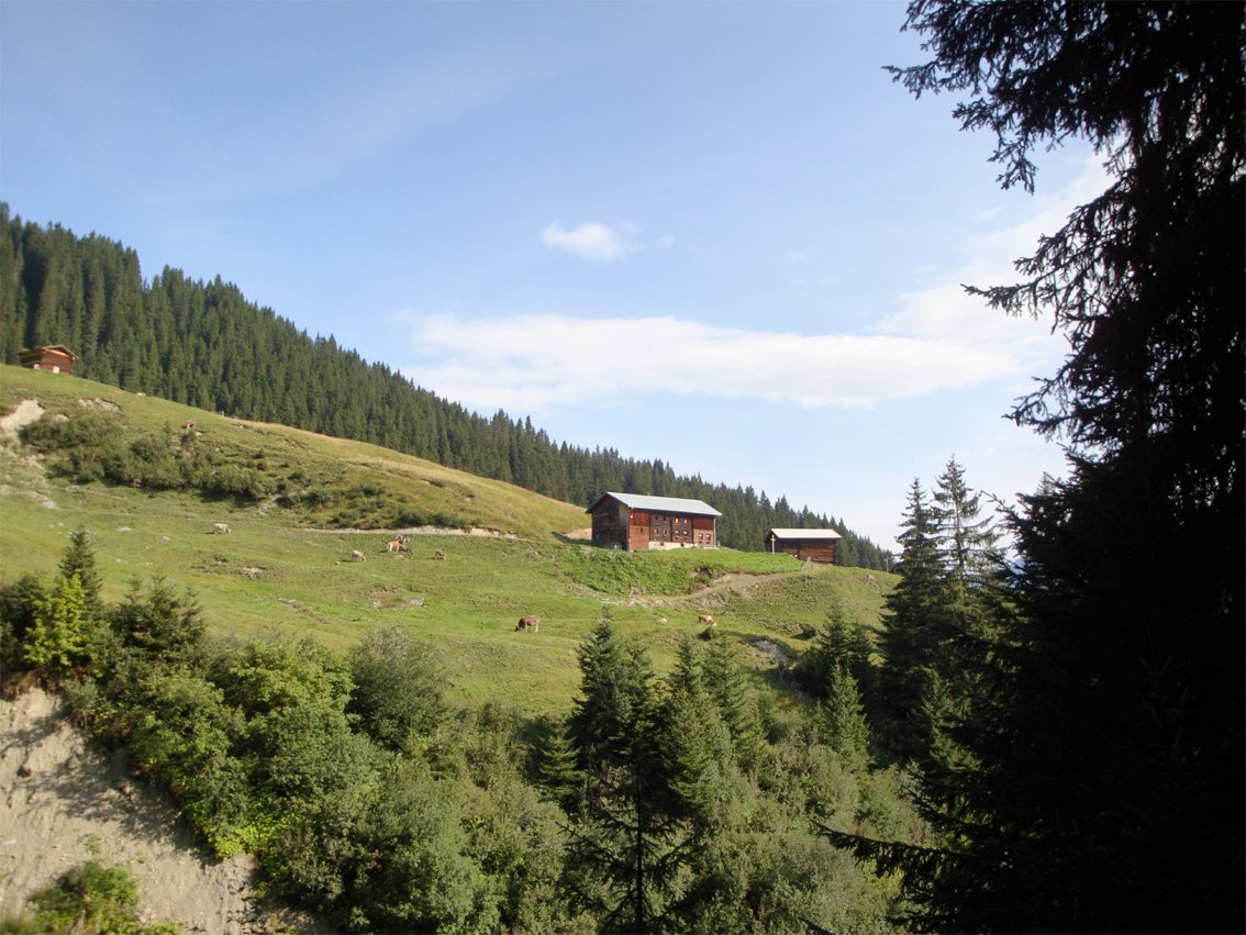 Vom Dorfzentrum auf dem Wanderweg Richtung Ronggalpe. Der Einstieg befindet sich direkt bei der Brücke über den Ronggbach.