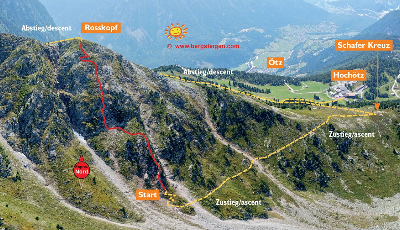 Der Rosskopf Klettersteig mitten im Skigebiet Hochötz ist eine nordseitige Ferrata auf die sogenannten Rossköpfe. Der Klettersteig wurde mehr oder weniger ausgegraben und so eine mit 300 m Stahlseil gesicherte Spur durch die Nordwand des Rosskopfes gelegt. Oft an gestuften Gratpassagen und ganz kurzen, steileren Abschnitten steigt man in Richtung Gipfelkreuz. Der Klettersteig an sich ist kein Meisterstück unter den Klettersteigen, im Gesamtpaket, mit sehr schönem Inntalblick und schneller Erreichbarkeit mit der Seilbahn aber durchaus einen Ausflug wert.