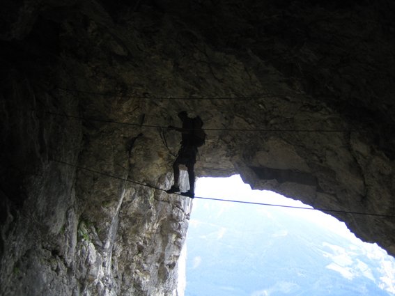 Großartiger und eindrucksvoller Klettersteig durch eine 70 m lange Höhle. Der Steig wurde sehr gut angelegt, nach dem steilen Abstieg (D) gelangt man zum Höhleneingang, durch die Höhle dann wieder aufwärts. Der Steig läßt sich - sofern man genug Kraft hat - sehr gut mit dem Kaiser-Franz-Joseph-Klettersteig kombinieren.