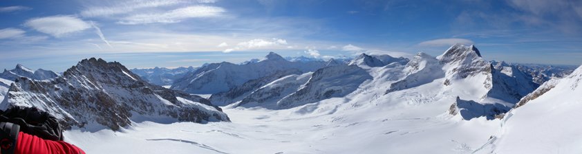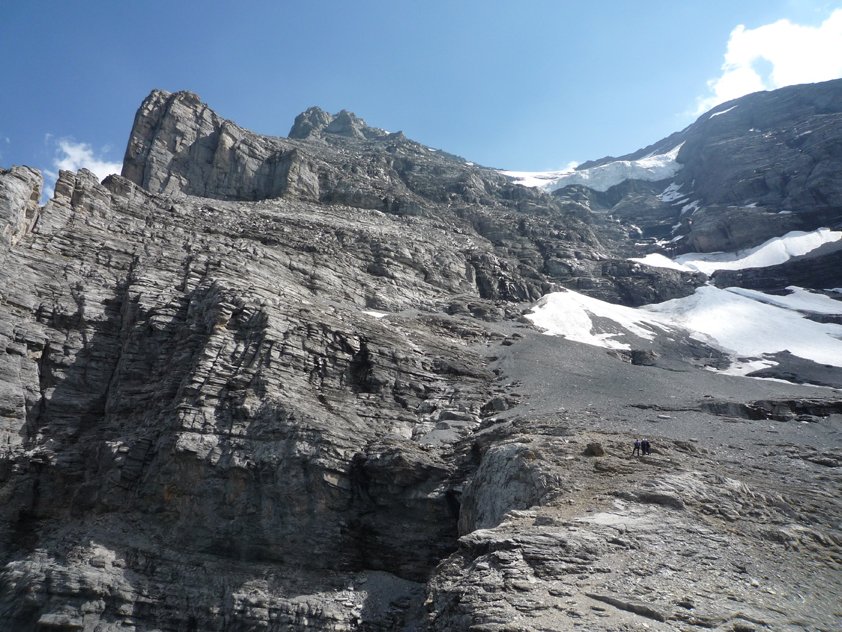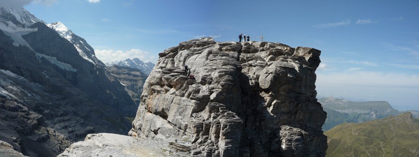 Über den Abstiegsweg am Gipfelgrat bis zur Leiter zurück zum Rotstocksattel. Dort nach Süden absteigen und entlang der Westflanke (weiß/blau) markiert über Platten nach Westen zur Station Eigergletscher hinunter. Die Platten sind stellenweise sehr glatt, man muss bis 1+ klettern und sich an Kletterseilen hinunterhanteln. Ohne Zusatzseil ist an dieser Stelle keine vernünftige Sicherung möglich. Bei Nässe und Schnee sehr gefährlich!