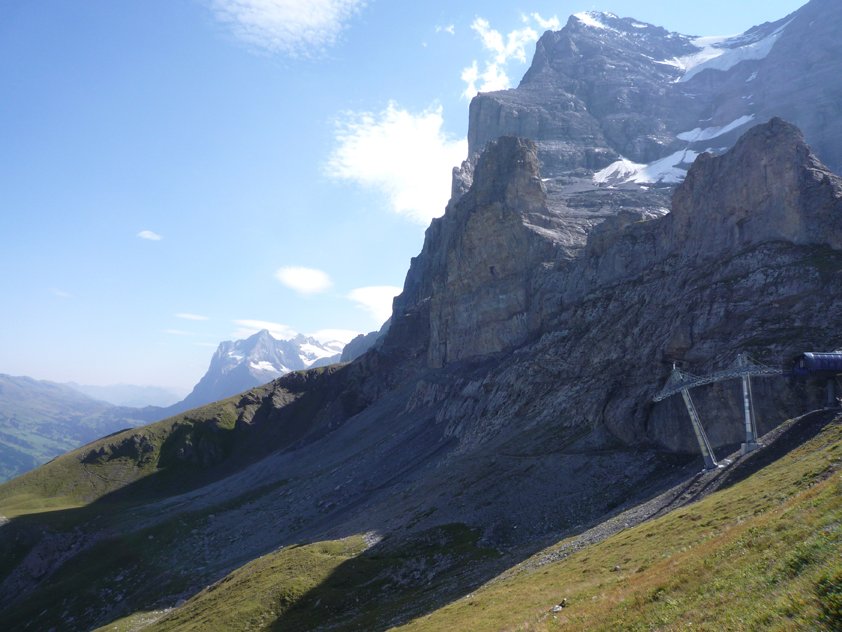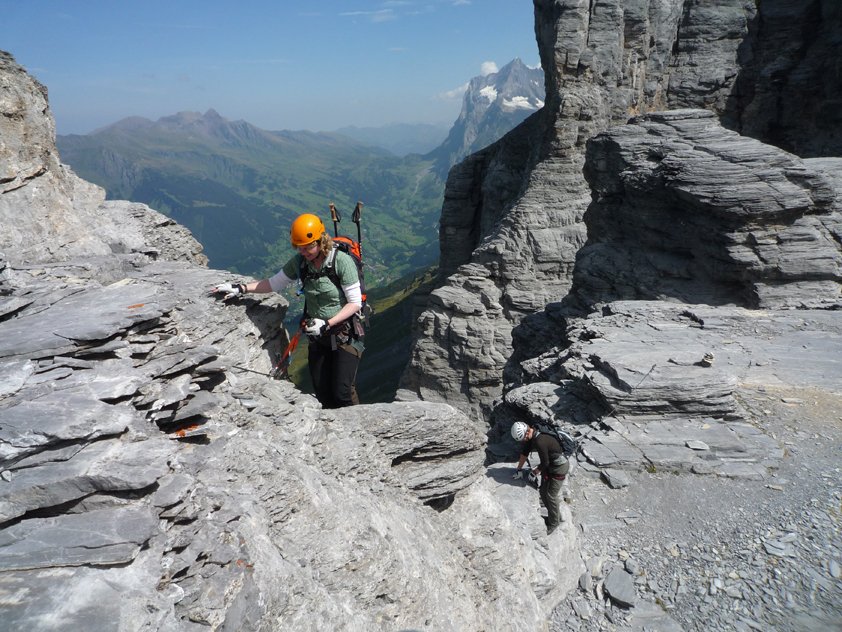 Hier kommt Mini-Eigernordwandfeeling auf! Der Rotstock-Klettersteig verläuft durch eine 260 m hohe Wand im rechten Ausläufer der Eigerwand. Neben dem Gefühl in der Eigerwand zu klettern, bietet diese Ferrata auch noch ein altes Stollenloch, denn bis zum Jahr 1903 war für die Jungfraubahn in der Nordwand des Rotstocks Endstation.