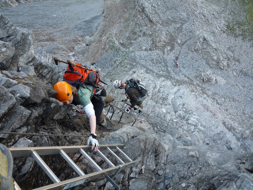 Komplette Klettersteigausrüstung und Helm. Für Anfänger ist beim Abstieg auch ein Sicherungsseil ratsam.