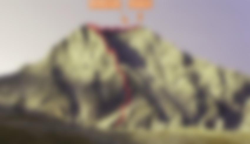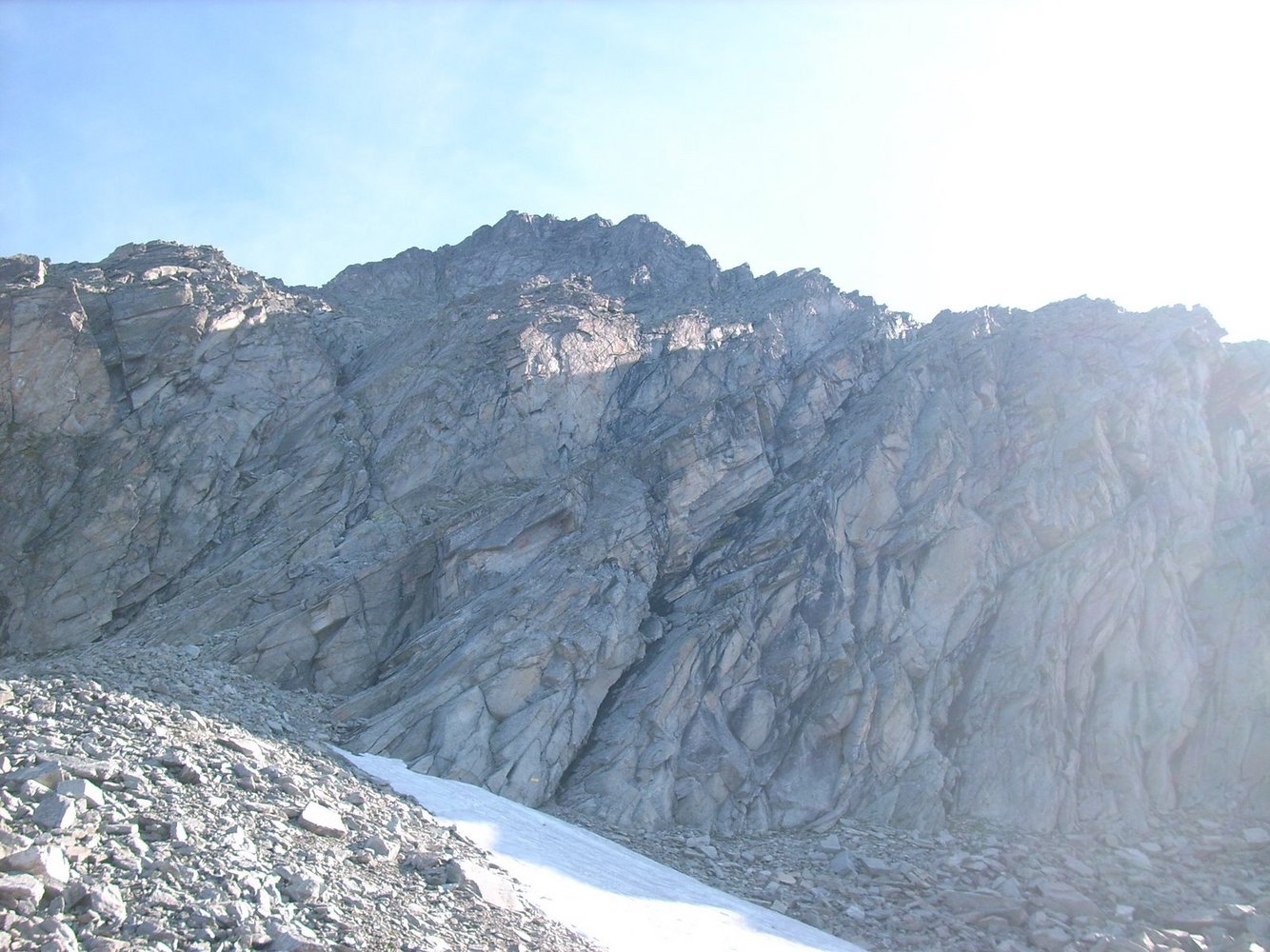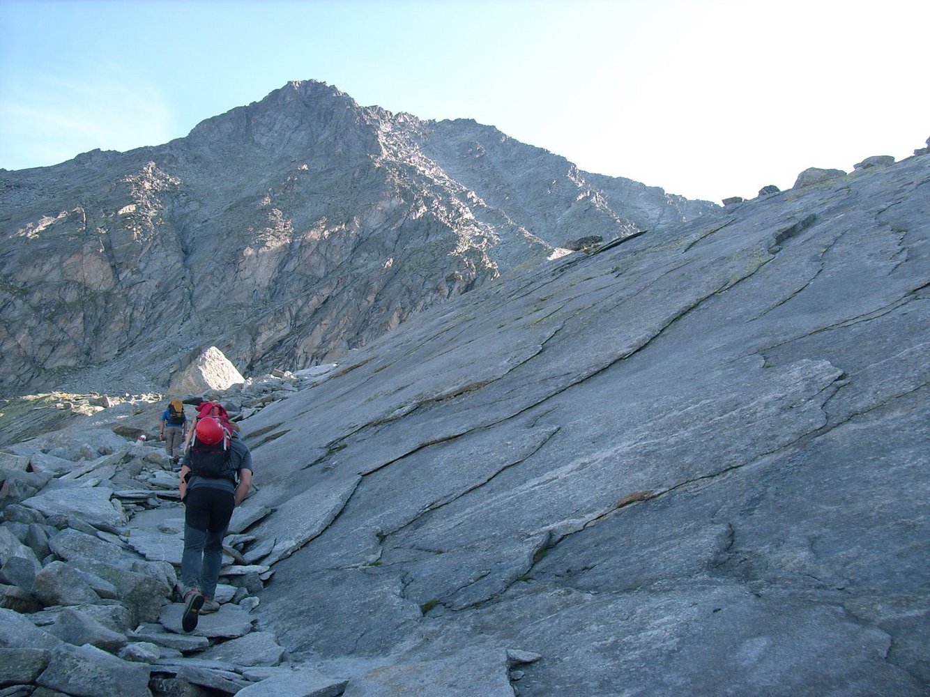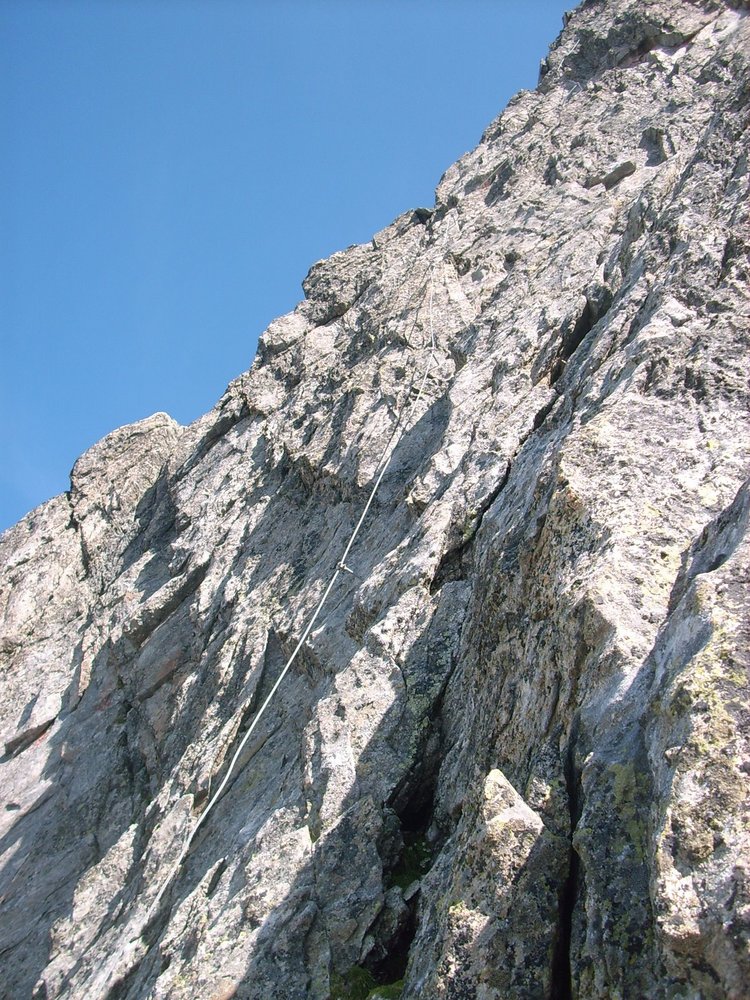Über eine markante, glatte Plattenrampe (zuerst D, dann C/D) zu einem Absatz. In kurzem Gehgelände wird eine große Schuttrampe gequert, bevor die Schlüsselstelle in Form einer unangenehmen Rinne (D/E) erreicht wird. Die erste Wand (zuerst D, dann D/E) führt in kompaktem, leicht überhängendem Fels zu einer Plattenverschneidung. Es folgt die zweite, 40 m hohe Wand (C/D).