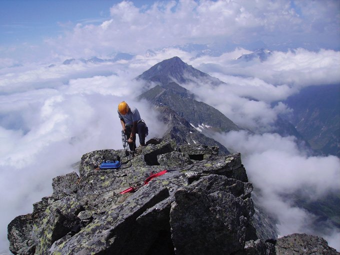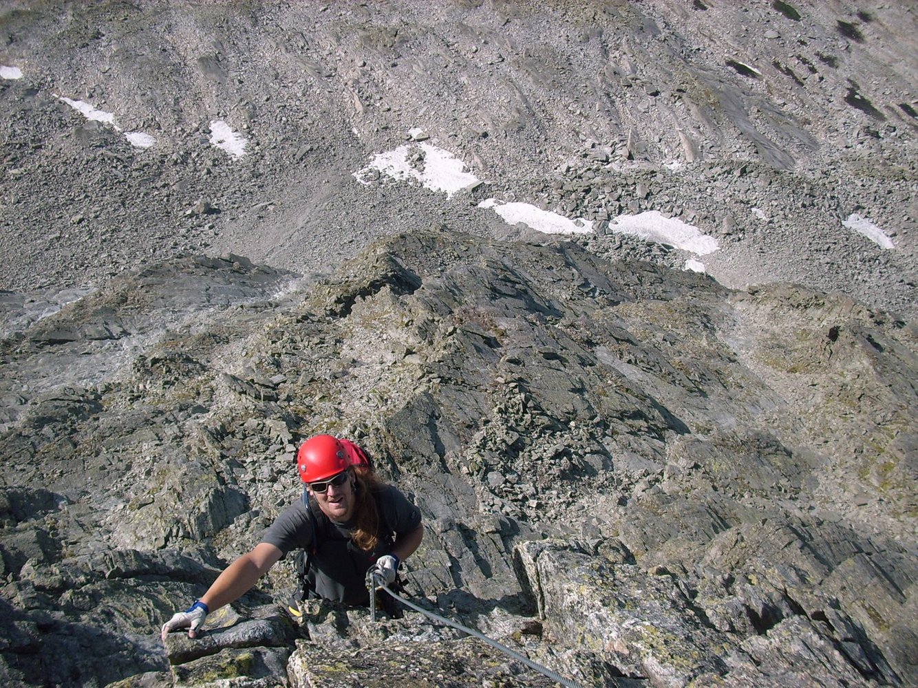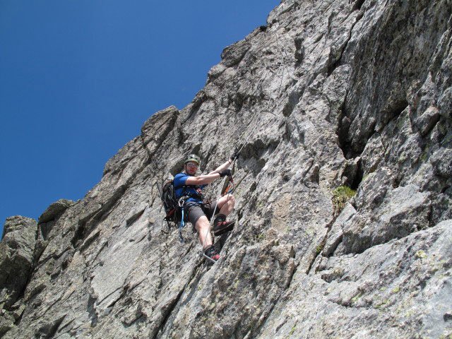 Nun mündet der Südgrat in den Westgrat. Auf diesem klettert man sehr ausgesetzt über mehrere Türme (C bis D). Besonders markant ist das Biefhörndl kurz vor dem Ausstieg (B/C) zum Gipfelkreuz.