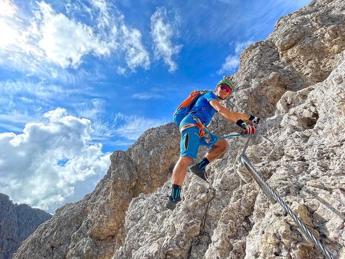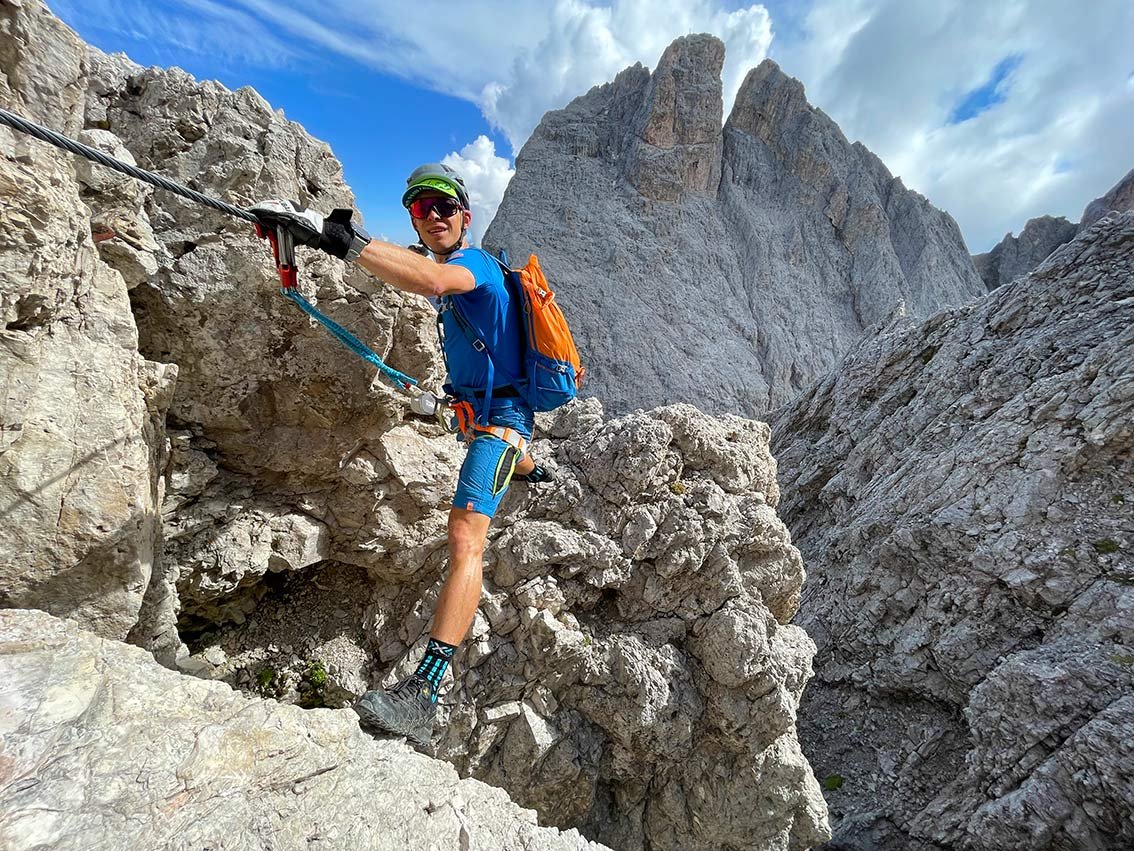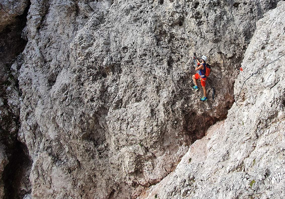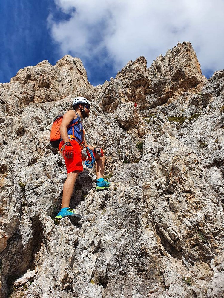 Über eine kurze Wandstufe (A) und eine unversicherte Schuttrinne zu den Ausläufern der nächsten Rinne. Anfangs an Trittstiften (B), dann leichter (A) in die Rinne, an deren Ende (A) links hinaus queren und über gestuftes Gelände zum Gipfel. Davor noch kurz versichert (A). Vom Gipfel über den Südwestanstieg auf dem SW-Grat absteigen (A), bis der Weg rechts zur Wand führt (A/B) und über Ausläufer des SW-Grates zu einer Geröllzone in der SW-Wand (A). Dann über gestuftes Gehgelände (Trittsicherheit) abwärts bis zu einer Weggabelung auf 2778 m, dort zwei Möglichkeiten: a) Villnösser Einstieg zur Mittagsscharte: Rechts, anfangs waagrechte Querung zu einer Rinne. Danach kurze Wand (B/C) und eine weitere Querung anfangs im Gehgelände, dann leichte Kletterei (1-) zum nächsten Felsspitz, den man über die Südwand (A/B, dann B/C) zu einer Scharte umgeht. Kurzer Aufstieg (A/B) in die nächste Scharte. Dann steil und erdig (A), zuletzt schotterig durch eine Rinne absteigen und rechts zur bereits sichtbaren Mittagsscharte queren (2615 m, GPS: N46 36.279 E11 45.603). Ab dort entweder nach Norden auf dem Weg 29 ins Villnösser Tal oder nach Süden zurück zum Ausgangspunkt (jeweils durch Rinnen). b) Südwestanstieg: Bergab über den Südwestanstieg bis auf eine Wiese, der man nach Westen eine Rinne querend zu den Versicherungen folgt. Querung zu einer Wandstelle (B/C), zu einer kl. Holzbrücke und weiter zu einer Rinne. Durch diese unschwierig (A) in wenigen Minuten zum Ende des Klettersteiges in der Rinne, die von der Mittagsscharte herabführt, 2513 m.