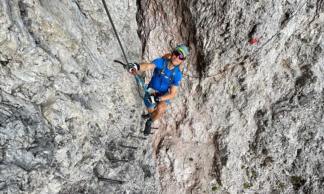 Klettersteig-Set und Helm, für Schwächere ein Sicherungsseil.