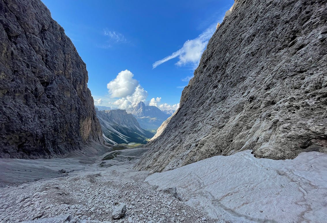 Durch die Rinne zurück zum Wegweiser unter den Südabstürzen des Sass Rigais und auf dem Zustiegsweg zum Col Raiser.