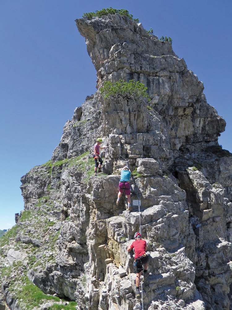 Zupacken muss man nur an einer ca. 5 Meter hohen Steilstufe (C) nach dem Querband. Manche Passagen des Klettersteiges sind ein wenig ausgesetzt (B/C). Der kleine Gipfel bietet nur Platz für ca. 8 Personen.